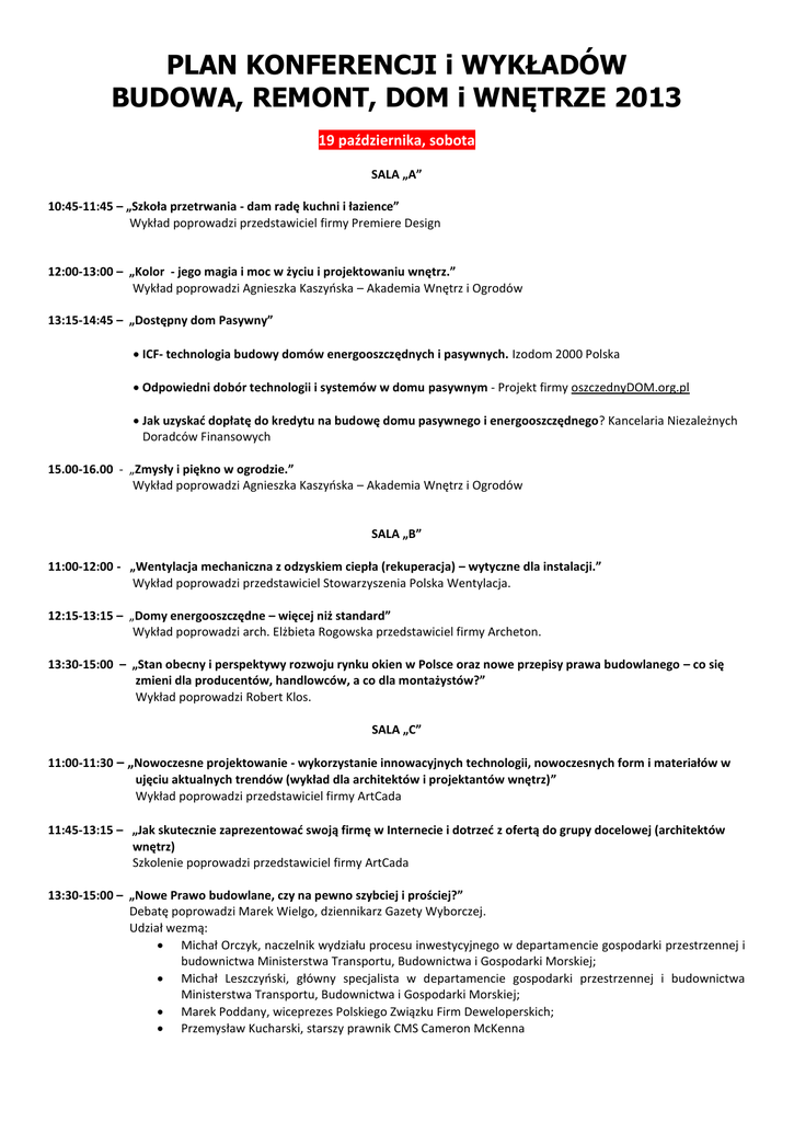 PLAN KONFERENCJI i WYKŁADÓW BUDOWA, REMONT, DOM i WNĘTRZE 2013 19 października, sobota SALA „A” 10:45-11:45 – „Szkoła przetrwania - dam radę kuchni i łazience” Wykład poprowadzi przedstawiciel firmy Premiere Design 12:00-13:00 – „Kolor - jego magia i moc w życiu i projektowaniu wnętrz.” Wykład poprowadzi Agnieszka Kaszyńska – Akademia Wnętrz i Ogrodów 13:15-14:45 – „Dostępny dom Pasywny” ICF- technologia budowy domów energooszczędnych i pasywnych. Izodom 2000 Polska Odpowiedni dobór technologii i systemów w domu pasywnym - Projekt firmy oszczednyDOM.org.pl Jak uzyskać dopłatę do kredytu na budowę domu pasywnego i energooszczędnego? Kancelaria Niezależnych Doradców Finansowych 15.00-16.00 - „Zmysły i piękno w ogrodzie.” Wykład poprowadzi Agnieszka Kaszyńska – Akademia Wnętrz i Ogrodów SALA „B” 11:00-12:00 - „Wentylacja mechaniczna z odzyskiem ciepła (rekuperacja) – wytyczne dla instalacji.” Wykład poprowadzi przedstawiciel Stowarzyszenia Polska Wentylacja. 12:15-13:15 – „Domy energooszczędne – więcej niż standard” Wykład poprowadzi arch. Elżbieta Rogowska przedstawiciel firmy Archeton. 13:30-15:00 – „Stan obecny i perspektywy rozwoju rynku okien w Polsce oraz nowe przepisy prawa budowlanego – co się zmieni dla producentów, handlowców, a co dla montażystów?” Wykład poprowadzi Robert Klos. SALA „C” 11:00-11:30 – „Nowoczesne projektowanie - wykorzystanie innowacyjnych technologii, nowoczesnych form i materiałów w ujęciu aktualnych trendów (wykład dla architektów i projektantów wnętrz)” Wykład poprowadzi przedstawiciel firmy ArtCada 11:45-13:15 – „Jak skutecznie zaprezentować swoją firmę w Internecie i dotrzeć z ofertą do grupy docelowej (architektów wnętrz) Szkolenie poprowadzi przedstawiciel firmy ArtCada 13:30-15:00 – „Nowe Prawo budowlane, czy na pewno szybciej i prościej?” Debatę poprowadzi Marek Wielgo, dziennikarz Gazety Wyborczej. Udział wezmą: Michał Orczyk, naczelnik wydziału procesu inwestycyjnego w departamencie gospodarki przestrzennej i budownictwa Ministerstwa Transportu, Budownictwa i Gospodarki Morskiej; Michał Leszczyński, główny specjalista w departamencie gospodarki przestrzennej i budownictwa Ministerstwa Transportu, Budownictwa i Gospodarki Morskiej; Marek Poddany, wiceprezes Polskiego Związku Firm Deweloperskich; Przemysław Kucharski, starszy prawnik CMS Cameron McKenna 20 października, niedziela SALA „A” 12:00–13:00 – „Kolor - jego magia i moc w życiu i projektowaniu wnętrz.” Wykład poprowadzi Agnieszka Kaszyńska – Akademia Wnętrz i Ogrodów 13:15-14:45 – „Dostępny dom Pasywny” ICF- technologia budowy domów energooszczędnych i pasywnych. Izodom 2000 Polska Odpowiedni dobór technologii i systemów w domu pasywnym - Projekt firmy oszczednyDOM.org.pl Jak uzyskać dopłatę do kredytu na budowę domu pasywnego i energooszczędnego? Kancelaria Niezależnych Doradców Finansowych SALA „B” 12:00–13:30 – „Projekt i co dalej? Jakie dokumenty należy złożyć z wnioskiem o pozwolenie na budowę. Jakie rozwiązania w projekcie są trudne do wykonania, drogie ... ładne” Wykład poprowadzi architekt Anna Kukawska. SALA „C” 11:00-12:00 - „Zasady funkcjonalnego urządzania wnętrz mieszkalnych.” Wykład poprowadzi przedstawiciel firmy Premiere Design 12:15-13:15 - „Zmysły i piękno w ogrodzie.” Wykład poprowadzi Agnieszka Kaszyńska – Akademia Wnętrz i Ogrodów