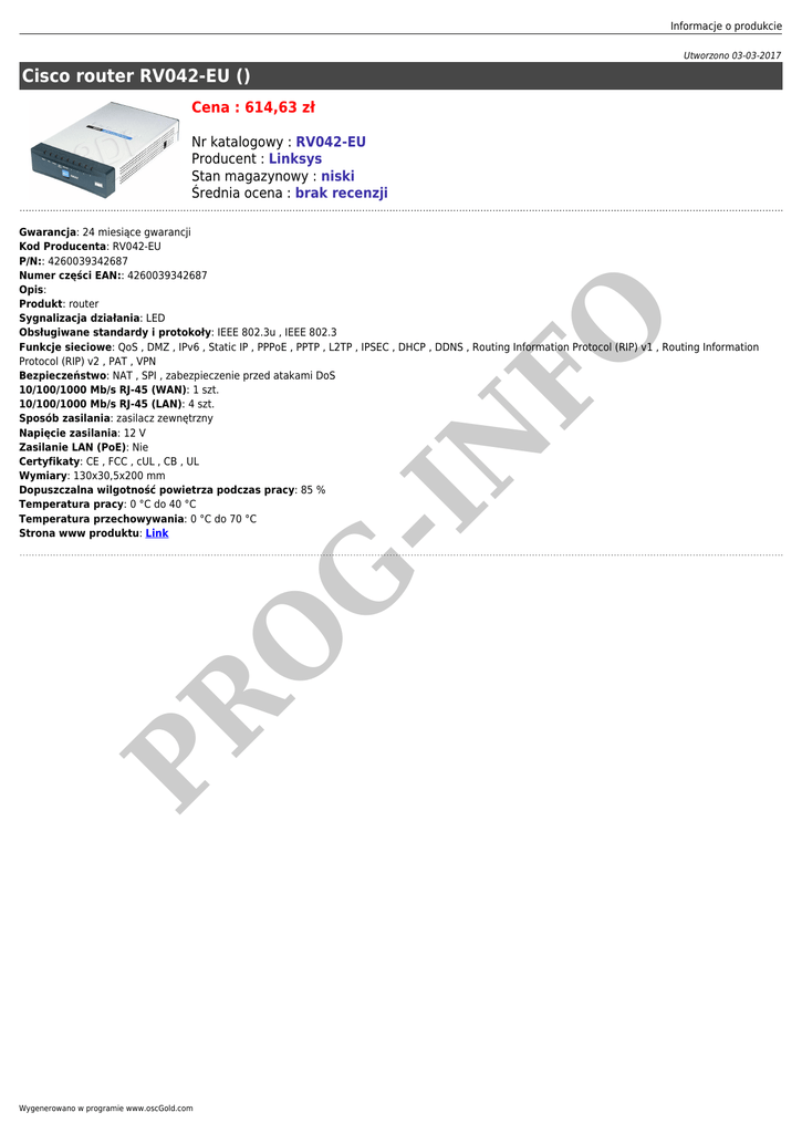 Informacje o produkcie Utworzono 03-03-2017 Cisco router RV042-EU () Cena : 614,63 zł Nr katalogowy : RV042-EU Producent : Linksys Stan magazynowy : niski Średnia ocena : brak recenzji PR O G -I N FO Gwarancja: 24 miesiące gwarancji Kod Producenta: RV042-EU P/N:: 4260039342687 Numer części EAN:: 4260039342687 Opis: Produkt: router Sygnalizacja działania: LED Obsługiwane standardy i protokoły: IEEE 802.3u , IEEE 802.3 Funkcje sieciowe: QoS , DMZ , IPv6 , Static IP , PPPoE , PPTP , L2TP , IPSEC , DHCP , DDNS , Routing Information Protocol (RIP) v1 , Routing Information Protocol (RIP) v2 , PAT , VPN Bezpieczeństwo: NAT , SPI , zabezpieczenie przed atakami DoS 10/100/1000 Mb/s RJ-45 (WAN): 1 szt. 10/100/1000 Mb/s RJ-45 (LAN): 4 szt. Sposób zasilania: zasilacz zewnętrzny Napięcie zasilania: 12 V Zasilanie LAN (PoE): Nie Certyfikaty: CE , FCC , cUL , CB , UL Wymiary: 130x30,5x200 mm Dopuszczalna wilgotność powietrza podczas pracy: 85 % Temperatura pracy: 0 °C do 40 °C Temperatura przechowywania: 0 °C do 70 °C Strona www produktu: Link Wygenerowano w programie www.oscGold.com