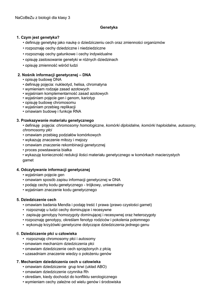 NaCoBeZu z biologii dla klasy 3 Genetyka 1. Czym jest genetyka? • definiuję genetykę jako naukę o dziedziczeniu cech oraz zmienności organizmów • rozpoznaję cechy dziedziczne i niedziedziczne • rozpoznaję cechy gatunkowe i cechy indywidualne • opisuję zastosowanie genetyki w różnych dziedzinach • opisuję zmienność wśród ludzi 2. Nośnik informacji genetycznej – DNA • opisuję budowę DNA • definiuję pojęcia: nukleotyd, helisa, chromatyna • wymieniam rodzaje zasad azotowych • wyjaśniam komplementarność zasad azotowych • wyjaśniam pojęcie gen i genom, kariotyp • opisuję budowę chromosomu • wyjaśniam przebieg replikacji • omawiam budowę i funkcje RNA 3. Przekazywanie materiału genetycznego • definiuję pojęcia: chromosomy homologiczne, komórki diploidalne, komórki haploidalne, autosomy, chromosomy płci • omawiam przebieg podziałów komórkowych • wykazuję znaczenie mitozy i mejozy • omawiam znaczenie rekombinacji genetycznej • proces powstawania białka • wykazuję konieczność redukcji ilości materiału genetycznego w komórkach macierzystych gamet 4. Odczytywanie informacji genetycznej • wyjaśniam pojęcie gen • omawiam sposób zapisu informacji genetycznej w DNA • podaję cechy kodu genetycznego - trójkowy, uniwersalny • wyjaśniam znaczenie kodu genetycznego 5. Dziedziczenie cech • omawiam badania Mendla i podaję treść I prawa (prawo czystości gamet) • rozpoznaję u ludzi cechy dominujące i recesywne • zapisuję genotypy homozygoty dominującej i recesywnej oraz heterozygoty • rozpoznaję genotypy, określam fenotyp rodziców i pokolenia potomnego • wykonuję krzyżówki genetyczne dotyczące dziedziczenia jednego genu 6. Dziedziczenie płci u człowieka • rozpoznaję chromosomy płci i autosomy • omawiam mechanizm dziedziczenia płci • omawiam dziedziczenie cech sprzężonych z płcią • uzasadniam znaczenie wiedzy o położeniu genów 7. Mechanizm dziedziczenia cech u człowieka • omawiam dziedziczenie grup krwi (układ ABO) • omawiam dziedziczenie czynnika Rh • określam, kiedy dochodzi do konfliktu serologicznego • wymieniam cechy zależne od wielu genów i środowiska 8. Mutacje jako czynnik zmienności genetycznej • wymieniam rodzaje mutacji • wymieniam czynniki mutagenne • określam znaczenie mutacji zachodzących w komórkach diploidalnych i haploidalnych • podaję różnice między zmiennością organizmów a mutacjami • wymieniam choroby genetyczne, podaję ich przyczyny i objawy • określam znaczenie badań prenatalnych Ewolucjonizm 9. Ewolucja i jej dowody • definiuję pojęcie „ewolucja” • wymieniam i charakteryzuję bezpośrednie dowody ewolucji: skamieniałości, ogniwa pośrednie, relikty • wymieniam i charakteryzuję pośrednie dowody ewolucji: narządy szczątkowe, jedność budowy i funkcjonowania, rozmieszczenie organizmów na kuli ziemskiej, struktury homologiczne i analogiczne, konwergencja, dywergencja. 10. Mechanizmy ewolucji • omawiam główne założenia teorii ewolucji Darwina • definiuję pojęcie „endemit” i wymieniam przykłady endemitów • wyjaśniam, na czym polega dobór naturalny i dobór sztuczny i podaję różnice między nimi • ilustruję przykładami działanie doboru naturalnego i doboru sztucznego • wyjaśniam pojęcie melanizmu przemysłowego • omawiam założenia syntetycznej teorii ewolucji 11. Pochodzenie człowieka • przedstawiam stanowisko systematyczne człowieka • określam podobieństwa i różnice między człowiekiem a innymi naczelnymi • omawiam przebieg ewolucji człowieka • wymieniam czynniki, które miały wpływ na ewolucję człowieka EKOLOGIA 12. Czym zajmuje się ekologia? • wyjaśniam, czym zajmuje się ekologia • wymieniam czynniki ograniczające występowanie gatunków w różnych środowiskach • rozróżniam siedlisko i niszę ekologiczną • omawiam na przykładzie wpływ środowiska na wygląd organizmu • omawiam różnice między ekologią a ochroną przyrody i ochroną środowiska • odczytuję z wykresu dane dotyczące zakresu tolerancji 13. Cechy populacji • odróżniam populację od gatunku • charakteryzuję liczebność i zagęszczenie • omawiam czynniki wpływające na liczebność (rozrodczość, śmiertelność, migracje) • omawiam wędrówki zwierząt • charakteryzuję strukturę przestrzenną • opisuję życie w stadzie, hierarchia w stadzie • opisuję strukturę wiekową i płciową • charakteryzuję piramidy wieku 14. Charakterystyka konkurencji • rozróżniam antagonistyczne i nieantagonistyczne zależności między organizmami • charakteryzuję konkurencję (konkurencja wewnątrzgatunkowa i konkurencja międzygatunkowa) • omawiam konkurencję jako czynnik doboru naturalnego 15. Charakterystyka roślinożerności • znaczenie roślinożerców w przyrodzie • regulacja liczebności roślin i roślinożerców • przystosowania organizmów do odżywiania się pokarmem roślinnym • sposoby obrony roślin przed zjadaniem znaczenie roślinożerców w przyrodzie • regulacja liczebności roślin i roślinożerców • przystosowania organizmów do odżywiania się pokarmem roślinnym • sposoby obrony roślin przed zjadaniem 16. Charakterystyka drapieżnictwa • wyjaśniam na wybranych przykładach, na czym polega drapieżnictwo • wykazuję rolę drapieżników w przyrodzie jako regulatorów liczebności ofiar • omawiam przystosowania organizmów do drapieżnictwa • przedstawiam różne strategie polowań stosowanych przez drapieżniki • omawiam sposoby obrony organizmów przed drapieżnikami • wymieniam przykłady roślin drapieżnych i ich przystosowania do zdobywania pokarmu 17. Pasożytnictwo • wyjaśniam, na czym polega pasożytnictwo, • wymieniam przykłady pasożytów zewnętrznych i wewnętrznych, • charakteryzuję przystosowania organizmów do pasożytniczego trybu życia, • omawiam pasoży