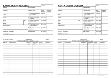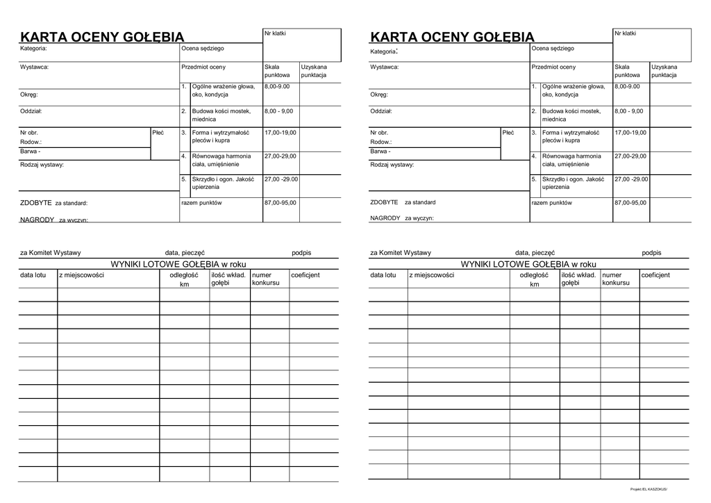 KARTA OCENY GOŁĘBIA KARTA OCENY GOŁĘBIA Nr klatki Kategoria: Ocena sędziego Wystawca: Przedmiot oceny Skala punktowa 1. Ogólne wrażenie głowa, oko, kondycja 8,00-9.00 Okręg: 2. Budowa kości mostek, miednica 8,00 - 9,00 Oddział: 3. Forma i wytrzymałość pleców i kupra 17,00-19,00 Nr obr. 4. Równowaga harmonia ciała, umięśnienie 27,00-29,00 5. Skrzydło i ogon. Jakość upierzenia 27,00 -29.00 razem punktów 87,00-95,00 Oddział: Płeć Nr obr. Rodow.: Barwa Rodzaj wystawy: ZDOBYTE za standard: Uzyskana punktacja data lotu z miejscowości Kategoria: Ocena sędziego Wystawca: Przedmiot oceny Skala punktowa 1. Ogólne wrażenie głowa, oko, kondycja 8,00-9.00 Okręg: 2. Budowa kości mostek, miednica 8,00 - 9,00 3. Forma i wytrzymałość pleców i kupra 17,00-19,00 4. Równowaga harmonia ciała, umięśnienie 27,00-29,00 5. Skrzydło i ogon. Jakość upierzenia 27,00 -29.00 razem punktów 87,00-95,00 Płeć Rodow.: Barwa Rodzaj wystawy: ZDOBYTE za standard Uzyskana punktacja NAGRODY za wyczyn: NAGRODY za wyczyn: za Komitet Wystawy sędziego Nr klatki data, pieczęć podpis za Komitet Wystawy sędziego coeficjent data lotu WYNIKI LOTOWE GOŁĘBIA w roku odległość km ilość wkład. numer gołębi konkursu z miejscowości data, pieczęć podpis WYNIKI LOTOWE GOŁĘBIA w roku odległość km ilość wkład. numer gołębi konkursu coeficjent Projekt:/EL KASZOKUS/