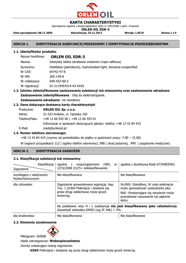 KARTA CHARAKTERYSTYKI Sporządzona zgodnie z Rozporządzeniem (WE) nr 1907/2006 z późn. zmianami ORLEN OIL EDR-3 Data sporządzenia: 08.11.2005 SEKCJA 1. Aktualizacja: 25.11.2012 Wersja: 1.0CLP Strona 1 z 9 IDENTYFIKACJA SUBSTANCJI/MIESZANINY I IDENTYFIKACJA PRZEDSIĘBIORSTWA 1.1. Identyfikator produktu Nazwa handlowa: ORLEN OIL EDR-3 Nazwa: Destylaty lekkie obrabiane wodorem (ropa naftowa) Synonimy: Distillates (petroleum), hydrotreated light; Kerosine-unspecified. Nr CAS: 64742-47-8 Nr WE: 265-149-8 Nr indeksowy: 649-422-00-2 Nr rejestracji: 01-2119453414-43-XXXX 1.2. Istotne zidentyfikowane zastosowania substancji lub mieszaniny oraz zastosowania odradzane Zastosowanie zidentyfikowane : Olej do elektrodrążarek. Zastosowanie odradzane: nie określono 1.3. Dane dotyczące dostawcy karty charakterystyki Producent: ORLEN OIL Sp. z o.o. Adres: 31-323 Kraków, ul. Opolska 100 Telefon/Faks: +48 12 66 555 00 / +48 12 66 555 01 Informacje w sprawach dotyczących jakości: telefon +48 13 43 84 415 E-Mail: [email protected] 1.4. Numer telefonu alarmowego: +48 13 43 84 415 (czynny od poniedziałku do piątku w godzinach pracy: 7.00 – 15.00) W nagłych przypadkach 112 ( ogólny telefon alarmowy), 998 ( straż pożarna), 999 ( pogotowie medyczne) SEKCJA 2. IDENTYFIKACJA ZAGROŻEŃ 2.1. Klasyfikacja substancji lub mieszaniny Klasyfikacja Zagrożenia zgodna z rozporządzeniem (WE) 1272/2008 (CLP)+ doklasyfikowanie: nr zgodna z dyrektywą Rady 67/548/EWG: wynikające z właściwości fizykochemicznych: Nie klasyfikowana Nie klasyfikowana dla człowieka: Zagrożenie spowodowane aspiracją: Asp. Tox. 1 (H304 Połknięcie i dostanie się przez drogi oddechowe może grozić śmiercią). Xn;R65- Szkodliwy; W razie połknięcia może spowodować uszkodzenie płuc R66 –Powtarzające się narażenie może powodować wysuszanie lub pękanie skóry Na podstawie noty H i L substancja nie jest klasyfikowana jako rakotwórcza. Zawartość ekstraktu DMSO (wg IP 346) < 3%. dla środowiska: Nie klasyfikowana Nie klasyfikowana 2.2. Elementy oznakowania Piktogram: GHS08 Hasło ostrzegawcze: Niebezpieczeństwo Zwroty wskazujące rodzaj zagrożenia: H304 Połknięcie i dostanie się przez drogi oddechowe może grozić śmiercią. KARTA CHARAKTERYSTYKI Sporządzona zgodnie z Rozporządzeniem (WE) nr 1907/2006 z późn. zmianami ORLEN OIL EDR-3 Data sporządzenia: 08.11.2005 Aktualizacja: 25.11.2012 Wersja: 1.0CLP Strona 2 z 9 Zwroty wskazujące środki ostrożności: P301+P310 W PRZYPADKU POŁKNIĘCIA: Natychmiast skontaktować się z OŚRODKIEM ZATRUĆ lub z lekarzem. P331 NIE wywoływać wymiotów. P405 Przechowywać pod zamknięciem. P501 Zawartość/pojemnik usuwać do firm posiadających odpowiednie uprawnienia. Dodatkowe informacje na etykiecie: Zawiera destylaty lekkie obrabiane wodorem (ropa naftowa); Frakcja naftowa - niespecyfikowana Nr CAS 64742-47-8 2.3. Inne zagrożenia Substancja nie spełnia kryteriów PBT lub vPvB zgodnie z załącznikiem XIII. Produkt palny o wysokiej temperaturze zapłonu. SEKCJA 3. SKŁAD/INFORMACJA O SKŁADNIKACH 3.1. Substancje Nazwa substancji Wzór % wagowy Nr CAS Nr WE Nr indeksowy Destylaty lekkie obrabiane wodorem (ropa naftowe) Nie dotyczy 100 64742-47-8 265-149-8 649-422-00-2 Złożona mieszanina węglowodorów otrzymywana przez obróbkę frakcji ropy naftowej wodorem w obecności katalizatora. Składa się z węglowodorów o liczbie atomów węgla głównie od C9 do C16. Wrze w temp. 150 do 2500C. SEKCJA 4. ŚRODKI PIERWSZEJ POMOCY 4.1. Opis środków pierwszej pomocy Wdychanie: Poszkodowanego usunąć (wyprowadzić/wynieść) z miejsca narażenia na świeże powietrze; zapewnić spokój i ciepło. Nieprzytomnego ułożyć w pozycji bocznej ustalonej, rozluźnić uciskające części ubrania; kontrolować i utrzymywać drożność dróg oddechowych. W przypadku zaburzeń w oddychaniu podawać tlen, w przypadku braku oddechu stosować sztuczne oddychanie. W przypadku utraty przytomności, zaburzeń oddychania lub utrzymującego się złego samopoczucia natychmiast zapewnić pomoc lekarską. Kontakt ze skórą: Natychmiast zdjąć zanieczyszczoną/nasiąkniętą odzież i buty. Zanieczyszczoną skórę umyć dokładnie wodą z mydłem lub łagodnym detergentem, a następnie spłukać wodą. W przypadku wystąpienia i utrzymywania się objawów podrażnienia skonsultować się z lekarzem. UWAGA: Zanieczyszczoną/nasiąkniętą odzież usunąć w bezpieczne miejsce z dala od źródeł ciepła i źródeł zapłonu. Kontakt z oczami: Zanieczyszczone oczy natychmiast płukać ciągłym strumieniem wody, usunąć szkła kontaktowe (jeśli są) i kontynuować płukanie przez ok. 15 minut. Podczas płukania trzymać powieki szeroko rozwarte i poruszać gałką oczną. W przypadku wystąpienia i utrzymywania się dolegliwości skonsultować się z lekarzem. UWAGA: Nie stosować zbyt silnego strumienia wody, aby nie uszkodzić rogówki. Połknięcie: Natychmiast zapewnić pomoc medyczną. NIE prowokować wymiotów – zwiększone ryzyko zachłyśnięcia. W przypadku wystąpienia samoistnych wymiotów trzymać poszkodowanego w pozycji nachylonej do przodu z twarzą skierowaną do ziemi. 4.2. Najważniejsze ostre i opóźnione objawy oraz skutki narażenia Nie określono. 4.3. Wskazania dotyczące wszelkiej natychmiastowej pomocy lekarskiej i szczególnego postępowania z poszkodowanym Nie prowokować wymiotów i nie podawać niczego doustnie osobie nieprzytomnej. Pokazać kartę charakterystyki lub etykietę/opakowanie personelowi medycznemu udzielającemu pomocy. Osoby udzielające pomocy w obszarze KARTA CHARAKTERYSTYKI Sporządzona zgodnie z Rozporządzeniem (WE) nr 1907/2006 z późn. zmianami ORLEN OIL EDR-3 Data sporządzenia: 08.11.2005 Aktualizacja: 25.11.2012 Wersja: 1.0CLP Strona 3 z 9 o nieznanym stężeniu par/mgły powinny być wyposażone w odpowiednie ochrony dróg oddechowych. Wskazówki dla lekarza: leczenie objawowe. SEKCJA 5. POSTĘPOWANIE W PRZYPADKU POŻARU 5.1