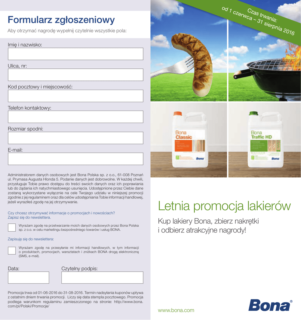 od 1 Formularz zgłoszeniowy Aby otrzymać nagrodę wypełnij czytelnie wszystkie pola: cze Cz r wc as trwa a– 31 s nia: ie r p n ia 2 016 Imię i nazwisko: Ulica, nr: Kod pocztowy i miejscowość: Telefon kontaktowy: Rozmiar spodni: E-mail: Administratorem danych osobowych jest Bona Polska sp. z o.o., 61-008 Poznań ul. Prymasa Augusta Hlonda 5. Podanie danych jest dobrowolne. W każdej chwili, przysługuje Tobie prawo dostępu do treści swoich danych oraz ich poprawiania lub do żądania ich natychmiastowego usunięcia. Udostępnione przez Ciebie dane zostaną wykorzystane wyłącznie na cele Twojego udziału w niniejszej promocji zgodnie z jej regulaminem oraz dla celów udostępniania Tobie informacji handlowej, jeżeli wyraziłeś zgodę na jej otrzymywanie. Czy chcesz otrzymywać informacje o promocjach i nowościach? Zapisz się do newslettera. Wyrażam zgodę na przetwarzanie moich danych osobowych przez Bona Polska sp. z o.o. w celu marketingu bezpośredniego towarów i usług BONA. Letnia promocja lakierów Kup lakiery Bona, zbierz nakrętki i odbierz atrakcyjne nagrody! Zapisuję się do newslettera: Wyrażam zgodę na przesyłanie mi informacji handlowych, w tym informacji o produktach, promocjach, warsztatach i zniżkach BONA drogą elektroniczną (SMS, e-mail). Data: Czytelny podpis: Promocja trwa od 01-06-2016 do 31-08-2016. Termin nadsyłania kuponów upływa z ostatnim dniem trwania promocji. Liczy się data stempla pocztowego. Promocja podlega warunkom regulaminu zamieszczonego na stronie: http://www.bona. com/pl/Polski/Promocje/ www.bona.com Kup lakiery Bona z nowymi etykietami, W promocji biorą udział wyłącznie lakiery z nowymi etykietami oraz kolorowymi nakrętkami: Novia – brązowa, seria Mega – niebieskie, seria Traffic – zielone. zbierz nakrętki i odbierz atrakcyjne nagrody! Pakiet 1 Jak wziąć udział w promocji: Pakiet 2 Kup 3 sztuki lakieru Bona Novia 5L Kup 6 sztuk lakieru a otrzymasz Bona Freshen Up 1L oraz Bona Cleaner 1L Bona Mega 5L Dokonaj zakupu zgodnie z odpowiednim pakietem zaprezentowanym na poprzedniej stonie. Krok 2 Wpisz swoje dane na odwrocie kuponu.* Krok 3 Niniejszy kupon (ulotkę) wraz z kopią dokumentu potwierdzającego nabycie produktów oraz odpowiednią temu ilością nakrętek z butli lakierów wyślij do biura Bona Polska na poniższy adres: Bona Polska Sp. z o.o. Ul. Prymasa Augusta Hlonda 5 61-008 Poznań a otrzymasz spodnie robocze w prezencie! w prezencie! Pakiet 3 Krok 1 Pakiet 4 Kup 4 sztuki lakieru Kup 9 sztuk lakieru Bona Traffic 4,95L lub Bona Traffic HD 4,95L a otrzymasz a otrzymasz spodnie robocze Bona Mega 5L 2 sztuki kleju Bona R848T 5400ml w prezencie! w prezencie! *Przesłanie formularza niezawierającego zgody na przetwarzanie danych osobowych skutkuje jego zniszczeniem na koszt Organizatora Promocji w sposób uniemożliwiający komukolwiek zapoznanie się z danymi zamieszczanymi na formularzu. Na adres wskazany na kuponie otrzymasz swoją nagrodę. Pakiet 5 Pakiet 6 Kup 6 sztuk lakieru Kup 9 sztuk lakieru Bona Traffic 4,95L Bona Traffic HD 4,95L 1 puszkę Bona Craft Oil 2K 1,25L Bona Mega Natural 5L lub Bona White 5L a otrzymasz w prezencie! a otrzymasz w prezencie! Promocja trwa od 1 czerwca 2016 do 31 sierpnia 2016 i podlega warunkom regulaminu zamieszczonego na stronie www.bona.com Masz pytania? Zadzwoń 61 816 34 60