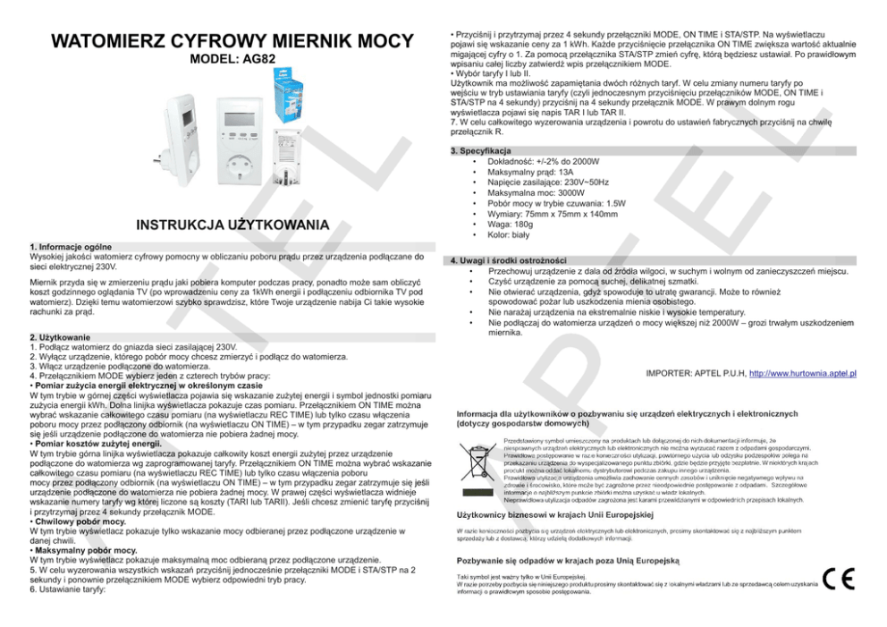 WATOMIERZ CYFROWY MIERNIK MOCY MODEL: AG82 INSTRUKCJA UŻYTKOWANIA 1. Informacje ogólne Wysokiej jakości watomierz cyfrowy pomocny w obliczaniu poboru prądu przez urządzenia podłączane do sieci elektrycznej 230V. Miernik przyda się w zmierzeniu prądu jaki pobiera komputer podczas pracy, ponadto może sam obliczyć koszt godzinnego oglądania TV (po wprowadzeniu ceny za 1kWh energii i podłączeniu odbiornika TV pod watomierz). Dzięki temu watomierzowi szybko sprawdzisz, które Twoje urządzenie nabija Ci takie wysokie rachunki za prąd. 2. Użytkowanie 1. Podłącz watomierz do gniazda sieci zasilającej 230V. 2. Wyłącz urządzenie, którego pobór mocy chcesz zmierzyć i podłącz do watomierza. 3. Włącz urządzenie podłączone do watomierza. 4. Przełącznikiem MODE wybierz jeden z czterech trybów pracy: • Pomiar zużycia energii elektrycznej w określonym czasie W tym trybie w górnej części wyświetlacza pojawia się wskazanie zużytej energii i symbol jednostki pomiaru zużycia energii kWh. Dolna linijka wyświetlacza pokazuje czas pomiaru. Przełącznikiem ON TIME można wybrać wskazanie całkowitego czasu pomiaru (na wyświetlaczu REC TIME) lub tylko czasu włączenia poboru mocy przez podłączony odbiornik (na wyświetlaczu ON TIME) – w tym przypadku zegar zatrzymuje się jeśli urządzenie podłączone do watomierza nie pobiera żadnej mocy. • Pomiar kosztów zużytej energii. W tym trybie górna linijka wyświetlacza pokazuje całkowity koszt energii zużytej przez urządzenie podłączone do watomierza wg zaprogramowanej taryfy. Przełącznikiem ON TIME można wybrać wskazanie całkowitego czasu pomiaru (na wyświetlaczu REC TIME) lub tylko czasu włączenia poboru mocy przez podłączony odbiornik (na wyświetlaczu ON TIME) – w tym przypadku zegar zatrzymuje się jeśli urządzenie podłączone do watomierza nie pobiera żadnej mocy. W prawej części wyświetlacza widnieje wskazanie numery taryfy wg której liczone są koszty (TARI lub TARII). Jeśli chcesz zmienić taryfę przyciśnij i przytrzymaj przez 4 sekundy przełącznik MODE. • Chwilowy pobór mocy. W tym trybie wyświetlacz pokazuje tylko wskazanie mocy odbieranej przez podłączone urządzenie w danej chwili. • Maksymalny pobór mocy. W tym trybie wyświetlacz pokazuje maksymalną moc odbieraną przez podłączone urządzenie. 5. W celu wyzerowania wszystkich wskazań przyciśnij jednocześnie przełączniki MODE i STA/STP na 2 sekundy i ponownie przełącznikiem MODE wybierz odpowiedni tryb pracy. 6. Ustawianie taryfy: • Przyciśnij i przytrzymaj przez 4 sekundy przełączniki MODE, ON TIME i STA/STP. Na wyświetlaczu pojawi się wskazanie ceny za 1 kWh. Każde przyciśnięcie przełącznika ON TIME zwiększa wartość aktualnie migającej cyfry o 1. Za pomocą przełącznika STA/STP zmień cyfrę, którą będziesz ustawiał. Po prawidłowym wpisaniu całej liczby zatwierdź wpis przełącznikiem MODE. • Wybór taryfy I lub II. Użytkownik ma możliwość zapamiętania dwóch różnych taryf. W celu zmiany numeru taryfy po wejściu w tryb ustawiania taryfy (czyli jednoczesnym przyciśnięciu przełączników MODE, ON TIME i STA/STP na 4 sekundy) przyciśnij na 4 sekundy przełącznik MODE. W prawym dolnym rogu wyświetlacza pojawi się napis TAR I lub TAR II. 7. W celu całkowitego wyzerowania urządzenia i powrotu do ustawień fabrycznych przyciśnij na chwilę przełącznik R. 3. Specyfikacja • Dokładność: +/-2% do 2000W • Maksymalny prąd: 13A • Napięcie zasilające: 230V~50Hz • Maksymalna moc: 3000W • Pobór mocy w trybie czuwania: 1.5W • Wymiary: 75mm x 75mm x 140mm • Waga: 180g • Kolor: biały 4. Uwagi i środki ostrożności • Przechowuj urządzenie z dala od źródła wilgoci, w suchym i wolnym od zanieczyszczeń miejscu. • Czyść urządzenie za pomocą suchej, delikatnej szmatki. • Nie otwierać urządzenia, gdyż spowoduje to utratę gwarancji. Może to również spowodować pożar lub uszkodzenia mienia osobistego. • Nie narażaj urządzenia na ekstremalnie niskie i wysokie temperatury. • Nie podłączaj do watomierza urządzeń o mocy większej niż 2000W – grozi trwałym uszkodzeniem miernika. IMPORTER: APTEL P.U.H, http://www.hurtownia.aptel.pl