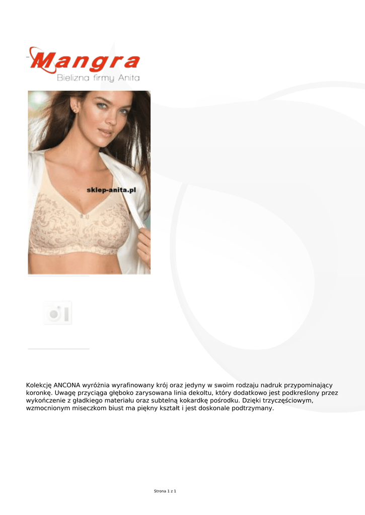 Kolekcję ANCONA wyróżnia wyrafinowany krój oraz jedyny w swoim rodzaju nadruk przypominający koronkę. Uwagę przyciąga głęboko zarysowana linia dekoltu, który dodatkowo jest podkreślony przez wykończenie z gładkiego materiału oraz subtelną kokardkę pośrodku. Dzięki trzyczęściowym, wzmocnionym miseczkom biust ma piękny kształt i jest doskonale podtrzymany. Strona 1 z 1