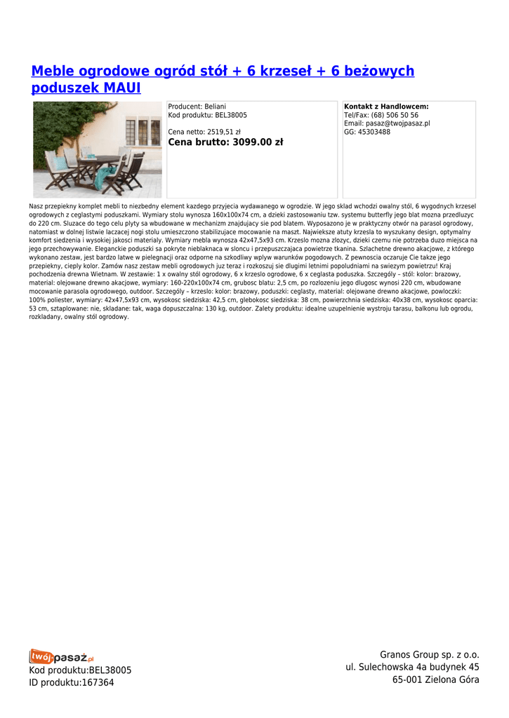 Meble ogrodowe ogród stół + 6 krzeseł + 6 beżowych poduszek MAUI Producent: Beliani Kod produktu: BEL38005 Cena netto: 2519,51 zł Kontakt z Handlowcem: Tel/Fax: (68) 506 50 56 Email: [email protected] GG: 45303488 Cena brutto: 3099.00 zł Nasz przepiekny komplet mebli to niezbedny element kazdego przyjecia wydawanego w ogrodzie. W jego sklad wchodzi owalny stól, 6 wygodnych krzesel ogrodowych z ceglastymi poduszkami. Wymiary stolu wynosza 160x100x74 cm, a dzieki zastosowaniu tzw. systemu butterfly jego blat mozna przedluzyc do 220 cm. Sluzace do tego celu plyty sa wbudowane w mechanizm znajdujacy sie pod blatem. Wyposazono je w praktyczny otwór na parasol ogrodowy, natomiast w dolnej listwie laczacej nogi stolu umieszczono stabilizujace mocowanie na maszt. Najwieksze atuty krzesla to wyszukany design, optymalny komfort siedzenia i wysokiej jakosci materialy. Wymiary mebla wynosza 42x47,5x93 cm. Krzeslo mozna zlozyc, dzieki czemu nie potrzeba duzo miejsca na jego przechowywanie. Eleganckie poduszki sa pokryte nieblaknaca w sloncu i przepuszczajaca powietrze tkanina. Szlachetne drewno akacjowe, z którego wykonano zestaw, jest bardzo latwe w pielegnacji oraz odporne na szkodliwy wplyw warunków pogodowych. Z pewnoscia oczaruje Cie takze jego przepiekny, cieply kolor. Zamów nasz zestaw mebli ogrodowych juz teraz i rozkoszuj sie dlugimi letnimi popoludniami na swiezym powietrzu! Kraj pochodzenia drewna Wietnam. W zestawie: 1 x owalny stól ogrodowy, 6 x krzeslo ogrodowe, 6 x ceglasta poduszka. Szczególy – stól: kolor: brazowy, material: olejowane drewno akacjowe, wymiary: 160-220x100x74 cm, grubosc blatu: 2,5 cm, po rozlozeniu jego dlugosc wynosi 220 cm, wbudowane mocowanie parasola ogrodowego, outdoor. Szczególy – krzeslo: kolor: brazowy, poduszki: ceglasty, material: olejowane drewno akacjowe, powloczki: 100% poliester, wymiary: 42x47,5x93 cm, wysokosc siedziska: 42,5 cm, glebokosc siedziska: 38 cm, powierzchnia siedziska: 40x38 cm, wysokosc oparcia: 53 cm, sztaplowane: nie, skladane: tak, waga dopuszczalna: 130 kg, outdoor. Zalety produktu: idealne uzupelnienie wystroju tarasu, balkonu lub ogrodu, rozkladany, owalny stól ogrodowy. Kod produktu:BEL38005 ID produktu:167364 Granos Group sp. z o.o. ul. Sulechowska 4a budynek 45 65-001 Zielona Góra