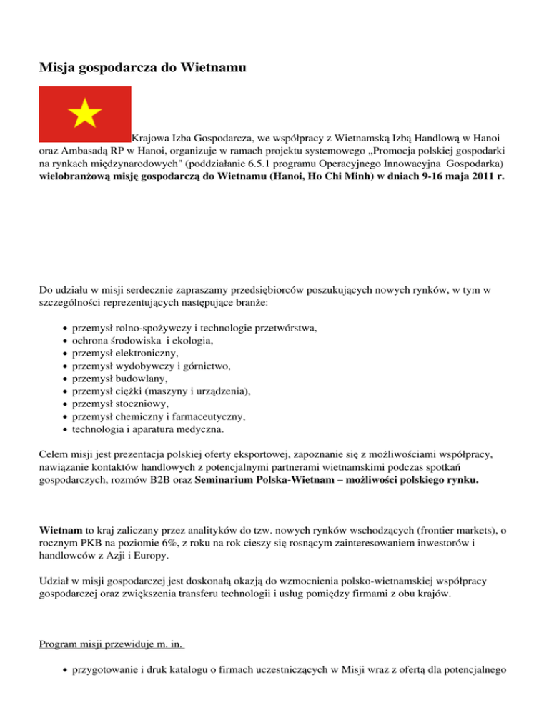 Misja gospodarcza do Wietnamu Krajowa Izba Gospodarcza, we współpracy z Wietnamską Izbą Handlową w Hanoi oraz Ambasadą RP w Hanoi, organizuje w ramach projektu systemowego „Promocja polskiej gospodarki na rynkach międzynarodowych" (poddziałanie 6.5.1 programu Operacyjnego Innowacyjna Gospodarka) wielobranżową misję gospodarczą do Wietnamu (Hanoi, Ho Chi Minh) w dniach 9-16 maja 2011 r. Do udziału w misji serdecznie zapraszamy przedsiębiorców poszukujących nowych rynków, w tym w szczególności reprezentujących następujące branże: przemysł rolno-spożywczy i technologie przetwórstwa, ochrona środowiska i ekologia, przemysł elektroniczny, przemysł wydobywczy i górnictwo, przemysł budowlany, przemysł ciężki (maszyny i urządzenia), przemysł stoczniowy, przemysł chemiczny i farmaceutyczny, technologia i aparatura medyczna. Celem misji jest prezentacja polskiej oferty eksportowej, zapoznanie się z możliwościami współpracy, nawiązanie kontaktów handlowych z potencjalnymi partnerami wietnamskimi podczas spotkań gospodarczych, rozmów B2B oraz Seminarium Polska-Wietnam – możliwości polskiego rynku. Wietnam to kraj zaliczany przez analityków do tzw. nowych rynków wschodzących (frontier markets), o rocznym PKB na poziomie 6%, z roku na rok cieszy się rosnącym zainteresowaniem inwestorów i handlowców z Azji i Europy. Udział w misji gospodarczej jest doskonałą okazją do wzmocnienia polsko-wietnamskiej współpracy gospodarczej oraz zwiększenia transferu technologii i usług pomiędzy firmami z obu krajów. Program misji przewiduje m. in. przygotowanie i druk katalogu o firmach uczestniczących w Misji wraz z ofertą dla potencjalnego partnera wietnamskiego, wizytę na targach, spotkania B2B firm polskich i wietnamskich w ramach organizowanych seminariów gospodarczych Polska-Wietnam (Ho Chi Minh), wizyty w wietnamskich inkubatorach technologicznych, uział w seminariach o rynku wietnamskim oraz prezentację międzynarodowych programów dotyczących współfinansowania projektów innowacyjnych ze środków publicznych. KOSZT UDZIAŁU W MISJI 1 OSOBY WYNOSI 13420.00 PLN brutto. Istnieje możliwość uzyskania dofinansowania ww. kosztu udziału w misji w ramach Programu Operacyjnego Innowacyjna Gospodarka 2007-2013, Poddziałanie 6.5.1 „Promocja polskiej gospodarki na rynkach międzynarodowych”. Przedsiębiorstwa zainteresowane uzyskaniem dofinansowania powinny złożyć wniosek do Ministerstwa Gospodarki, Departament Wdrażania Programów Operacyjnych, pl. Trzech Krzyży 3/5 00-507 Warszawa, nie później niż 10 marca 2011 r. (nie później niż 60 dni przed terminem rozpoczęcia misji!). Maksymalna pomoc udzielona na udział w programie promocji o charakterze ogólnym w ramach Poddziałania 6.5.1. PO IG nie może przekroczyć 50% wydatków kwalifikowanych związanych z uczestnictwem w misji. Wnioski o dofinansowanie dostępne są na stronie: http://www.mg.gov.pl/node/10299. Zainteresowanych prosimy o nadsyłanie zgłoszeń do udziału w misji do 6 marca 2011 r. na adres: Krajowa-Izba Gospodarcza Biuro Współpracy z Zagranicą Warszawa 00-074. ul. Trębacka 4, tel. 4822/6309707, fax 48228284199 Osoba do kontaktu: Katarzyna KANIEWSKA, e-mail: [email protected] Serdecznie zapraszamy! Powered by TCPDF (www.tcpdf.org)