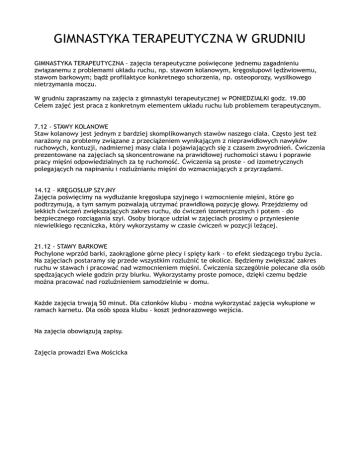 GIMNASTYKA TERAPEUTYCZNA W GRUDNIU GIMNASTYKA TERAPEUTYCZNA - zajęcia terapeutyczne poświęcone jednemu zagadnieniu związanemu z problemami układu ruchu, np. stawom kolanowym, kręgosłupowi lędźwiowemu, stawom barkowym; bądź profilaktyce konkretnego schorzenia, np. osteoporozy, wysiłkowego nietrzymania moczu. W grudniu zapraszamy na zajęcia z gimnastyki terapeutycznej w PONIEDZIAŁKI godz. 19.00 Celem zajęć jest praca z konkretnym elementem układu ruchu lub problemem terapeutycznym. 7.12 - STAWY KOLANOWE Staw kolanowy jest jednym z bardziej skomplikowanych stawów naszego ciała. Często jest też narażony na problemy związane z przeciążeniem wynikającym z nieprawidłowych nawyków ruchowych, kontuzji, nadmiernej masy ciała i pojawiających się z czasem zwyrodnień. Ćwiczenia prezentowane na zajęciach są skoncentrowane na prawidłowej ruchomości stawu i poprawie pracy mięśni odpowiedzialnych za tę ruchomość. Ćwiczenia są proste - od izometrycznych polegających na napinaniu i rozluźnianiu mięśni do wzmacniających z przyrządami. 14.12 – KRĘGOSŁUP SZYJNY Zajęcia poświęcimy na wydłużanie kręgosłupa szyjnego i wzmocnienie mięśni, które go podtrzymują, a tym samym pozwalają utrzymać prawidłową pozycję głowy. Przejdziemy od lekkich ćwiczeń zwiększających zakres ruchu, do ćwiczeń izometrycznych i potem – do bezpiecznego rozciągania szyi. Osoby biorące udział w zajęciach prosimy o przyniesienie niewielkiego ręczniczka, który wykorzystamy w czasie ćwiczeń w pozycji leżącej. 21.12 - STAWY BARKOWE Pochylone wprzód barki, zaokrąglone górne plecy i spięty kark - to efekt siedzącego trybu życia. Na zajęciach postaramy się przede wszystkim rozluźnić te okolice. Będziemy zwiększać zakres ruchu w stawach i pracować nad wzmocnieniem mięśni. Ćwiczenia szczególnie polecane dla osób spędzających wiele godzin przy biurku. Wykorzystamy proste pomoce, dzięki czemu będzie można pracować nad rozluźnieniem samodzielnie w domu. Każde zajęcia trwają 50 minut. Dla członków klubu - można wykorzystać zajęcia wykupione w ramach karnetu. Dla osób spoza klubu - koszt jednorazowego wejścia. Na zajęcia obowiązują zapisy. Zajęcia prowadzi Ewa Mościcka