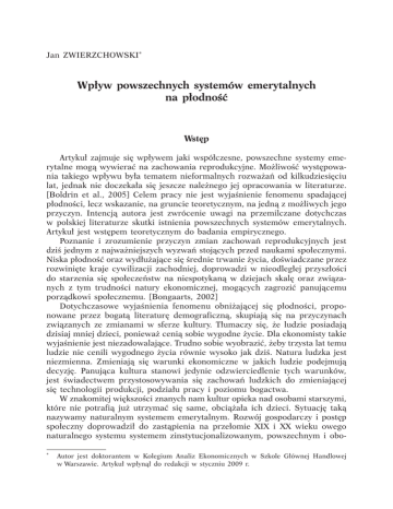 Jan ZWIERZCHOWSKI* Wpływ powszechnych systemów emerytalnych na płodność Wstęp Artykuł zajmuje się wpływem jaki współczesne, powszechne systemy emerytalne mogą wywierać na zachowania reprodukcyjne. Możliwość występowania takiego wpływu była tematem nieformalnych rozważań od kilkudziesięciu lat, jednak nie doczekała się jeszcze należnego jej opracowania w literaturze. [Boldrin et al., 2005] Celem pracy nie jest wyjaśnienie fenomenu spadającej płodności, lecz wskazanie, na gruncie teoretycznym, na jedną z możliwych jego przyczyn. Intencją autora jest zwrócenie uwagi na przemilczane dotychczas w polskiej literaturze skutki istnienia powszechnych systemów emerytalnych. Artykuł jest wstępem teoretycznym do badania empirycznego. Poznanie i zrozumienie przyczyn zmian zachowań reprodukcyjnych jest dziś jednym z najważniejszych wyzwań stojących przed naukami społecznymi. Niska płodność oraz wydłużające się średnie trwanie życia, doświadczane przez rozwinięte kraje cywilizacji zachodniej, doprowadzi w nieodległej przyszłości do starzenia się społeczeństw na niespotykaną w dziejach skalę oraz związanych z tym trudności natury ekonomicznej, mogących zagrozić panującemu porządkowi społecznemu. [Bongaarts, 2002] Dotychczasowe wyjaśnienia fenomenu obniżającej się płodności, proponowane przez bogatą literaturę demograficzną, skupiają się na przyczynach związanych ze zmianami w sferze kultury. Tłumaczy się, że ludzie posiadają dzisiaj mniej dzieci, ponieważ cenią sobie wygodne życie. Dla ekonomisty takie wyjaśnienie jest niezadowalające. Trudno sobie wyobrazić, żeby trzysta lat temu ludzie nie cenili wygodnego życia równie wysoko jak dziś. Natura ludzka jest niezmienna. Zmieniają się warunki ekonomiczne w jakich ludzie podejmują decyzję. Panująca kultura stanowi jedynie odzwierciedlenie tych warunków, jest świadectwem przystosowywania się zachowań ludzkich do zmieniającej się technologii produkcji, podziału pracy i poziomu bogactwa. W znakomitej większości znanych nam kultur opieka nad osobami starszymi, które nie potrafią już utrzymać się same, obciążała ich dzieci. Sytuację taką nazywamy naturalnym systemem emerytalnym. Rozwój gospodarczy i postęp społeczny doprowadził do zastąpienia na przełomie XIX i XX wieku owego naturalnego systemu systemem zinstytucjonalizowanym, powszechnym i obo*Autor jest doktorantem w Kolegium Analiz Ekonomicznych w Szkole Głównej Handlowej w Warszawie. Artykuł wpłynął do redakcji w styczniu 2009 r. 76 GOSPODARKA NARODOWA Nr 4/2009 wiązkowym. Z punktu widzenia stymulowania płodności wadą powszechnych emerytur jest stworzenie iluzji, jakoby każdy mógł sam sobie zapewnić dostatnią starość. W efekcie jedynym motywem do płodzenia dzieci pozostaje dziś bezpośrednia użyteczność czerpana z faktu ich posiadania. Motyw zabezpieczenia na starość przestaje mieć istotne znaczenie. Racjonalne jednostki ograniczają więc liczbę dzieci, a w równowadze demograficznej, współczynnik płodności nie zapewnia prostej zastępowalności pokoleń. Kolejne młode pokolenia obciążone są utrzymywaniem stosunkowo licznej grupy emerytów. Sytuacja ta nosi znamiona dylematu więźnia. Równowaga taka nie jest Pareto-efektywna, bowiem większa płodność prowadziłaby do wyższej użyteczności wszystkich pokoleń. W dodatku prowadzi do zanikania społeczeństw w długim horyzoncie. Zawartość artykułu jest następująca. Część druga zawiera historyczny rys przemian instytucjonalnych związanych z systemami emerytalnymi oraz przemian demograficznych. Część trzecia nawiązuje do głównych teorii opisujących fenomen zmian demograficznych ostatnich dwustu lat. W następnej części przedstawiony został zmodyfikowany model OLG, który obrazuje w jaki sposób emerytury mogą wpływać na obniżenie płodności. Na gruncie tego samego modelu zostało zaproponowane rozwiązanie dylematu. Podsumowanie kończy niniejszy artykuł. Płodność i systemy emerytalne w ujęciu historycznym Płodność Obecnie często zakłada się, że w społeczeństwach przed transformacją demograficzną z przełomu dziewiętnastego i dwudziestego wieku panowała wysoka płodność, zbliżona do biologicznego maksimum (tak zwana płodność naturalna). W rzeczywistości płodność nawet w starożytności kształtowała się na poziomach znacznie poniżej biologicznego maksimum i ulegała ona okresowym zmianom, w odpowiedzi na zmieniające się warunki zewnętrzne [Reid, 1988]. Przyjmuje się, że w okresie do dziewiętnastego wieku w Europie na jedną kobietę przypadały cztery do pięciu urodzeń, a poza Europą sześć do ośmiu. Są to wartości dwu, trzykrotnie mniejsze od tzw. płodności naturalnej, czyli biologicznego maksimum. Ich niska wartość oraz duże zróżnicowanie świadczą o wysokiej skuteczności i długiej tradycji stosowania naturalnych metod planowania rodziny. Wskazują, że już w zamierzchłej przeszłości liczba posiadanych dzieci mogła być efektem świadomych decyzji reprodukcyjnych [Wrigley, 1966]. Nowoczesna transformacja demograficzna rozpoczęła się z początkiem dziewiętnastego wieku we Francji i w Stanach Zjednoczonych. Reszta Europy podążyła tą samą drogą pół wieku później. Polegała ona w głównej mierze na obniżaniu się średniej liczby dzieci rodzących się w małżeństwie oraz jednoczesnym wydłużaniu średniego trwania życia. Zakończyła się właściwie w latach trzydziestych dwudziestego wieku. W odróżnieniu od wahań sprzed transfor- Jan Zwierzchowski, Wpływ powszechnych systemów emerytalnych na płodność 77 macji, obniżenie płodności z przełomu dziewiętnastego i dwudziestego wieku miało charakter trwały. W latach pięćdziesiątych XX wieku nastąpił wzrost płodności, ale miał on charakter chwilowej rekompensaty po drugiej wojnie światowej (tzw. Baby Boom), a płodność, w najwy