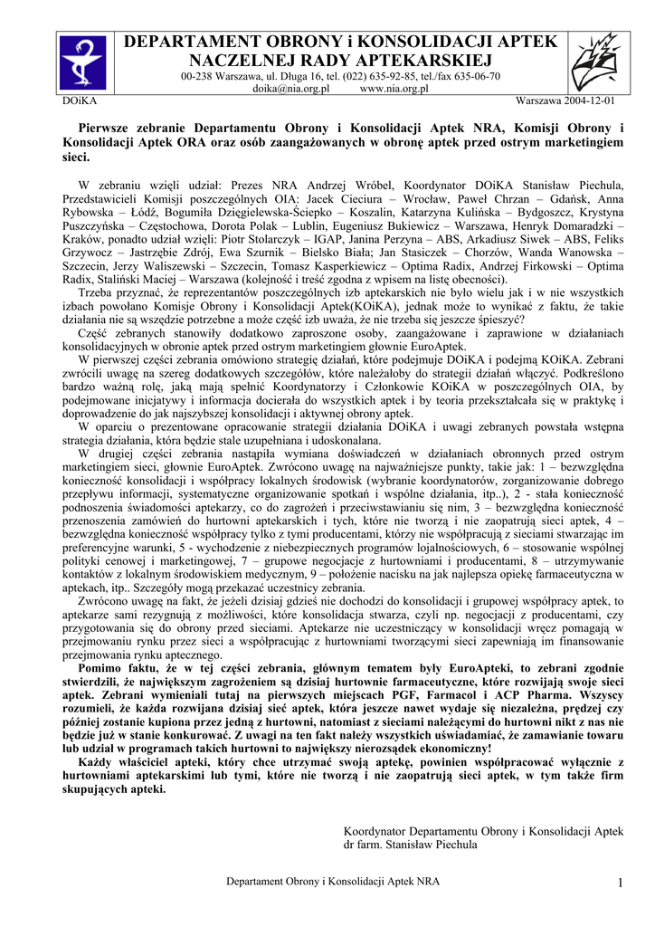 DEPARTAMENT OBRONY i KONSOLIDACJI APTEK NACZELNEJ RADY APTEKARSKIEJ 00-238 Warszawa, ul. Długa 16, tel. (022) 635-92-85, tel./fax 635-06-70 [email protected] www.nia.org.pl DOiKA Warszawa 2004-12-01 Pierwsze zebranie Departamentu Obrony i Konsolidacji Aptek NRA, Komisji Obrony i Konsolidacji Aptek ORA oraz osób zaangażowanych w obronę aptek przed ostrym marketingiem sieci. W zebraniu wzięli udział: Prezes NRA Andrzej Wróbel, Koordynator DOiKA Stanisław Piechula, Przedstawicieli Komisji poszczególnych OIA: Jacek Cieciura – Wrocław, Paweł Chrzan – Gdańsk, Anna Rybowska – Łódź, Bogumiła Dzięgielewska-Ściepko – Koszalin, Katarzyna Kulińska – Bydgoszcz, Krystyna Puszczyńska – Częstochowa, Dorota Polak – Lublin, Eugeniusz Bukiewicz – Warszawa, Henryk Domaradzki – Kraków, ponadto udział wzięli: Piotr Stolarczyk – IGAP, Janina Perzyna – ABS, Arkadiusz Siwek – ABS, Feliks Grzywocz – Jastrzębie Zdrój, Ewa Szurnik – Bielsko Biała; Jan Stasiczek – Chorzów, Wanda Wanowska – Szczecin, Jerzy Waliszewski – Szczecin, Tomasz Kasperkiewicz – Optima Radix, Andrzej Firkowski – Optima Radix, Staliński Maciej – Warszawa (kolejność i treść zgodna z wpisem na listę obecności). Trzeba przyznać, że reprezentantów poszczególnych izb aptekarskich nie było wielu jak i w nie wszystkich izbach powołano Komisje Obrony i Konsolidacji Aptek(KOiKA), jednak może to wynikać z faktu, że takie działania nie są wszędzie potrzebne a może część izb uważa, że nie trzeba się jeszcze śpieszyć? Część zebranych stanowiły dodatkowo zaproszone osoby, zaangażowane i zaprawione w działaniach konsolidacyjnych w obronie aptek przed ostrym marketingiem głownie EuroAptek. W pierwszej części zebrania omówiono strategię działań, które podejmuje DOiKA i podejmą KOiKA. Zebrani zwrócili uwagę na szereg dodatkowych szczegółów, które należałoby do strategii działań włączyć. Podkreślono bardzo ważną rolę, jaką mają spełnić Koordynatorzy i Członkowie KOiKA w poszczególnych OIA, by podejmowane inicjatywy i informacja docierała do wszystkich aptek i by teoria przekształcała się w praktykę i doprowadzenie do jak najszybszej konsolidacji i aktywnej obrony aptek. W oparciu o prezentowane opracowanie strategii działania DOiKA i uwagi zebranych powstała wstępna strategia działania, która będzie stale uzupełniana i udoskonalana. W drugiej części zebrania nastąpiła wymiana doświadczeń w działaniach obronnych przed ostrym marketingiem sieci, głownie EuroAptek. Zwrócono uwagę na najważniejsze punkty, takie jak: 1 – bezwzględna konieczność konsolidacji i współpracy lokalnych środowisk (wybranie koordynatorów, zorganizowanie dobrego przepływu informacji, systematyczne organizowanie spotkań i wspólne działania, itp..), 2 - stała konieczność podnoszenia świadomości aptekarzy, co do zagrożeń i przeciwstawianiu się nim, 3 – bezwzględna konieczność przenoszenia zamówień do hurtowni aptekarskich i tych, które nie tworzą i nie zaopatrują sieci aptek, 4 – bezwzględna konieczność współpracy tylko z tymi producentami, którzy nie współpracują z sieciami stwarzając im preferencyjne warunki, 5 - wychodzenie z niebezpiecznych programów lojalnościowych, 6 – stosowanie wspólnej polityki cenowej i marketingowej, 7 – grupowe negocjacje z hurtowniami i producentami, 8 – utrzymywanie kontaktów z lokalnym środowiskiem medycznym, 9 – położenie nacisku na jak najlepsza opiekę farmaceutyczna w aptekach, itp.. Szczegóły mogą przekazać uczestnicy zebrania. Zwrócono uwagę na fakt, że jeżeli dzisiaj gdzieś nie dochodzi do konsolidacji i grupowej współpracy aptek, to aptekarze sami rezygnują z możliwości, które konsolidacja stwarza, czyli np. negocjacji z producentami, czy przygotowania się do obrony przed sieciami. Aptekarze nie uczestniczący w konsolidacji wręcz pomagają w przejmowaniu rynku przez sieci a współpracując z hurtowniami tworzącymi sieci zapewniają im finansowanie przejmowania rynku aptecznego. Pomimo faktu, że w tej części zebrania, głównym tematem były EuroApteki, to zebrani zgodnie stwierdzili, że największym zagrożeniem są dzisiaj hurtownie farmaceutyczne, które rozwijają swoje sieci aptek. Zebrani wymieniali tutaj na pierwszych miejscach PGF, Farmacol i ACP Pharma. Wszyscy rozumieli, że każda rozwijana dzisiaj sieć aptek, która jeszcze nawet wydaje się niezależna, prędzej czy później zostanie kupiona przez jedną z hurtowni, natomiast z sieciami należącymi do hurtowni nikt z nas nie będzie już w stanie konkurować. Z uwagi na ten fakt należy wszystkich uświadamiać, że zamawianie towaru lub udział w programach takich hurtowni to największy nierozsądek ekonomiczny! Każdy właściciel apteki, który chce utrzymać swoją aptekę, powinien współpracować wyłącznie z hurtowniami aptekarskimi lub tymi, które nie tworzą i nie zaopatrują sieci aptek, w tym także firm skupujących apteki. Koordynator Departamentu Obrony i Konsolidacji Aptek dr farm. Stanisław Piechula Departament Obrony i Konsolidacji Aptek NRA 1 DEPARTAMENT OBRONY i KONSOLIDACJI APTEK NACZELNEJ RADY APTEKARSKIEJ 00-238 Warszawa, ul. Długa 16, tel. (022) 635-92-85, tel./fax 635-06-70 [email protected] www.nia.org.pl DOiKA Warszawa 2004-12-01 Propozycje do Strategii Departamentu Obrony i Konsolidacji Aptek WSTĘP Departament, jak sama nazwa wskazuje, powstał w celu reagowania na najbardziej niebezpieczne dla aptek zjawiska, które wymagają jak najszybszych i zdecydowanych działań. Warto jednak zdawać sobie sprawę, że główne zadania DOiKA, czyli obrona i konsolidacja aptek, to tematy, które należało podejmować przynajmniej 5 lat temu gdyż ich realizacja dzisiaj, to próby gaszenie konewką wielkiego pożaru. Z uwagi jednak na fakt, że „nigdy nie jest tak źle by nie mogło być gorzej” warto się w te tematy angażować s