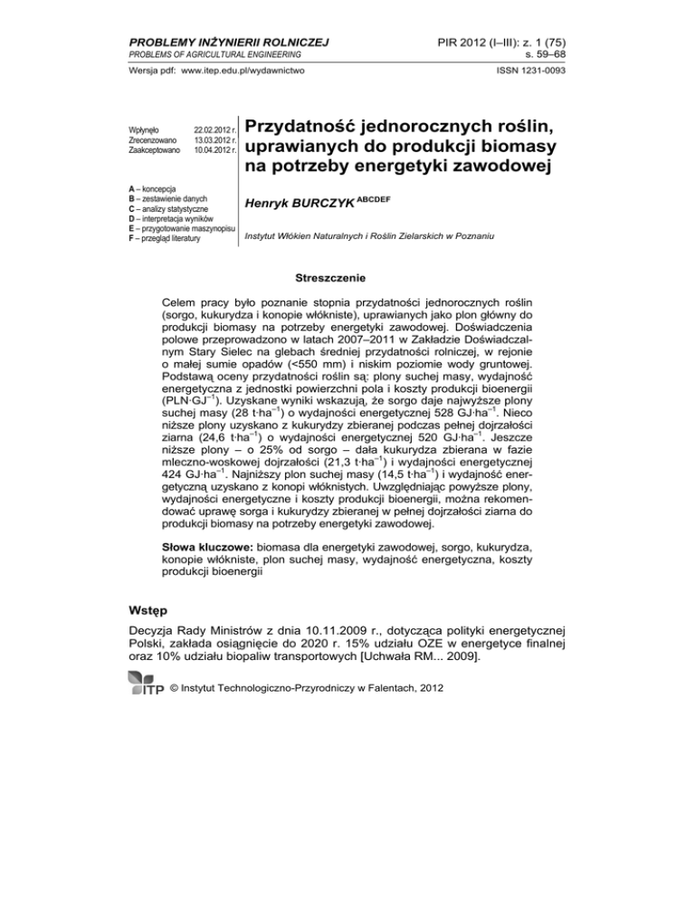 PROBLEMY INŻYNIERII ROLNICZEJ PIR 2012 (I–III): z. 1 (75) PROBLEMS OF AGRICULTURAL ENGINEERING Wersja pdf: www.itep.edu.pl/wydawnictwo Wpłynęło Zrecenzowano Zaakceptowano 22.02.2012 r. 13.03.2012 r. 10.04.2012 r. A – koncepcja B – zestawienie danych C – analizy statystyczne D – interpretacja wyników E – przygotowanie maszynopisu F – przegląd literatury s. 59–68 ISSN 1231-0093 Przydatność jednorocznych roślin, uprawianych do produkcji biomasy na potrzeby energetyki zawodowej Henryk BURCZYK ABCDEF Instytut Włókien Naturalnych i Roślin Zielarskich w Poznaniu Streszczenie Celem pracy było poznanie stopnia przydatności jednorocznych roślin (sorgo, kukurydza i konopie włókniste), uprawianych jako plon główny do produkcji biomasy na potrzeby energetyki zawodowej. Doświadczenia polowe przeprowadzono w latach 2007–2011 w Zakładzie Doświadczalnym Stary Sielec na glebach średniej przydatności rolniczej, w rejonie o małej sumie opadów (<550 mm) i niskim poziomie wody gruntowej. Podstawą oceny przydatności roślin są: plony suchej masy, wydajność energetyczna z jednostki powierzchni pola i koszty produkcji bioenergii (PLN·GJ–1). Uzyskane wyniki wskazują, że sorgo daje najwyższe plony suchej masy (28 t·ha–1) o wydajności energetycznej 528 GJ·ha–1. Nieco niższe plony uzyskano z kukurydzy zbieranej podczas pełnej dojrzałości ziarna (24,6 t·ha–1) o wydajności energetycznej 520 GJ·ha–1. Jeszcze niższe plony – o 25% od sorgo – dała kukurydza zbierana w fazie mleczno-woskowej dojrzałości (21,3 t·ha–1) i wydajności energetycznej 424 GJ·ha–1. Najniższy plon suchej masy (14,5 t·ha–1) i wydajność energetyczną uzyskano z konopi włóknistych. Uwzględniając powyższe plony, wydajności energetyczne i koszty produkcji bioenergii, można rekomendować uprawę sorga i kukurydzy zbieranej w pełnej dojrzałości ziarna do produkcji biomasy na potrzeby energetyki zawodowej. Słowa kluczowe: biomasa dla energetyki zawodowej, sorgo, kukurydza, konopie włókniste, plon suchej masy, wydajność energetyczna, koszty produkcji bioenergii Wstęp Decyzja Rady Ministrów z dnia 10.11.2009 r., dotycząca polityki energetycznej Polski, zakłada osiągnięcie do 2020 r. 15% udziału OZE w energetyce finalnej oraz 10% udziału biopaliw transportowych [Uchwała RM... 2009]. © Instytut Technologiczno-Przyrodniczy w Falentach, 2012 Henryk Burczyk Aby zrealizować zwiększony udział biopaliw, istnieje Polsce dostateczna baza techniczna i surowcowa (w formie nasion rzepaku ozimego, buraków cukrowych, ziemniaków i ziarna kukurydzy), aby pozyskać potrzebną ilość estrów i bioetanolu do produkcji biopaliw zgodnie z ustaleniami Narodowego Celu Wskaźnikowego. Trudnym zadaniem do wykonania w najbliższej przyszłości będzie zapewnienie potrzebnej ilości biomasy, szczególnie dla energetyki zawodowej, która w głównej mierze realizuje powyższe zadania. Zapotrzebowanie elektrowni i elektrociepłowni na biomasę do 2020 r. zaproponowane przez ekspertów wynosi orientacyjnie ok. 10 mln t s.m., w tym 2 mln t biomasy leśnej i 3,0 mln t słomy. Pozostałe 5 mln t s.m. przewiduje się otrzymać z uprawy wieloletnich roślin energetycznych na powierzchni ok. 500 tys. ha, przyjmując wysokość plonów na poziomie 10 t·ha–1 s.m. [GRZYBEK 2008]. Uzyskanie wymienionej ilości biomasy z roślin wieloletnich w warunkach ograniczonego wsparcia finansowego w uprawie i zakładaniu plantacji będzie bardzo trudne. Dotychczasowe wyniki z uprawą tych roślin dla potrzeb energetyki zawodowej również nie budzą optymizmu, dlatego alternatywą mogą być jednoroczne rośliny uprawiane w plonie głównym (sorgo, kukurydza i konopie włókniste), dające tańsze i bardziej wydajne plony biomasy z jednostki powierzchni pola od roślin wieloletnich [BURCZYK i in. 2009]. Wieloletnie rośliny energetyczne będą mogły spełniać określoną rolę na glebach zwięzłych, wilgotnych i występujących w rejonach o większej sumie opadów atmosferycznych (>600 mm). Na glebach o gorszej przydatności rolniczej, występujących w województwach: podlaskim, mazowieckim, łódzkim, lubuskim i wielkopolskim, o niskim poziomie wody gruntowej i małej sumie opadów atmosferycznych (<550 mm), rozwiązaniem może być uprawa jednorocznych roślin energetycznych [KRASOWICZ i in. 2009]. Materiał i metody badań W celu potwierdzenia powyższej hipotezy przeprowadzono w latach 2007–2011 ścisłe doświadczenia polowe w Zakładzie Doświadczalnym Stary Sielec IWNiRZ, powiat Rawicz, położonym w rejonie o małej sumie opadów (<550 mm) i niskim poziomie wody gruntowej. Doświadczenia zakładano na glebach bielicowych, zalegających na glinie o odczynie pH w granicach 5,5–6,5, o średniej zasobności w składniki pokarmowe, w stanowisku po zbożach ozimych. Wyjątkowo w 2011 r. doświadczenie założono na nieco lepszej glebie (kl. IVa), położonej na obniżonym terenie i przylegające do łąki o wyższym poziomie wody gruntowej. Uprawę roli od jesieni do zasiewu nasion wykonywano zgodnie z zasadami dobrej praktyki rolniczej. Nawożenie mineralne stosowano bezpośrednio przed siewem nasion w ilości na 1 ha: N – 120 kg, P2O5 – 60 kg i K2O – 100 kg. W doświadczeniach stosowano następujące odmiany oraz ilości wysiewu nasion: sorgo – Sucrosorgo 506 (10 kg·ha–1), kukurydzę – Bułat, a tylko w 2011 r. Vitras (80 kg·ha–1), i konopie włókniste – Białobrzeskie (30 kg·ha–1). 60 © ITP w Falentach; PIR 2012 (I–III): z. 1 (75) Przydatność jednorocznych roślin, uprawianych do produkcji biomasy... Rośliny zbierano w fazie mleczno-woskowej dojrzałości nasion. W dodatkowym obiekcie z kukurydzą opóźniano zbiór do pełnej dojrzałości ziarna, w którym określano oddzielnie plon ziarna i słomy. Podczas zbioru biomasy pobierano próby z każdego poletka do oznaczenia zawartości suchej masy i ciepła spalania za pomocą kalorymetru w Lab