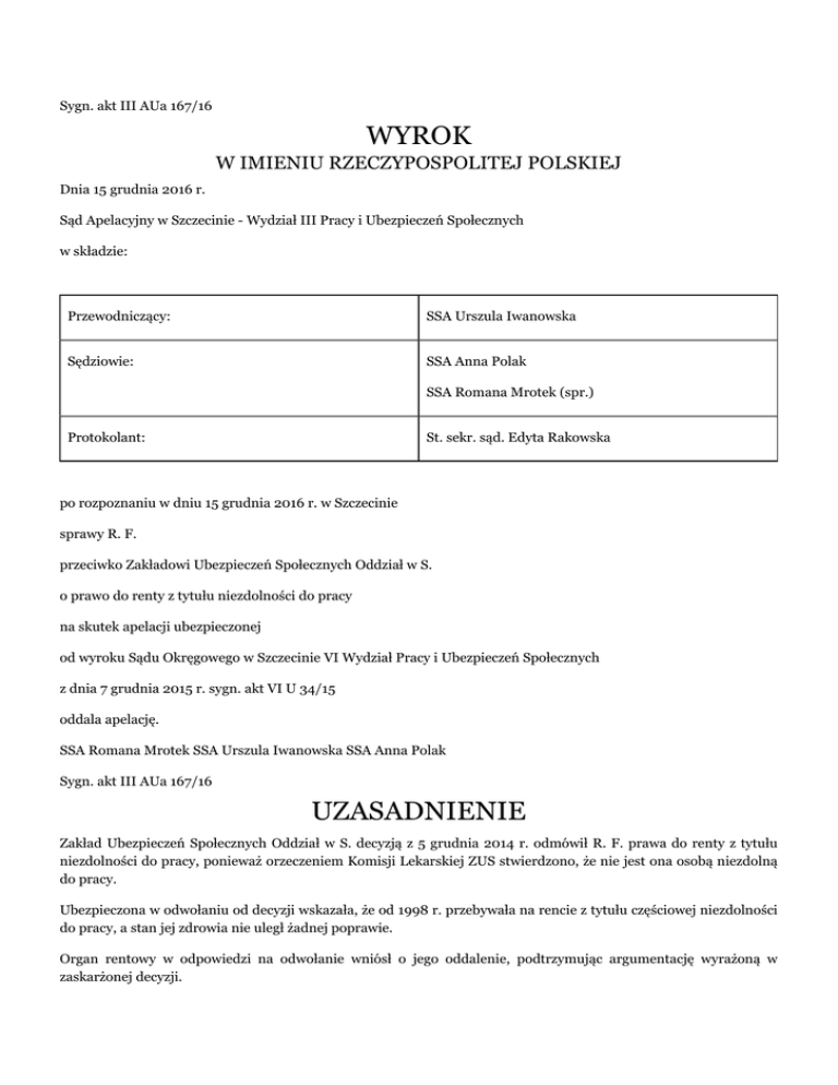 Sygn. akt III AUa 167/16 WYROK W IMIENIU RZECZYPOSPOLITEJ POLSKIEJ Dnia 15 grudnia 2016 r. Sąd Apelacyjny w Szczecinie - Wydział III Pracy i Ubezpieczeń Społecznych w składzie: Przewodniczący: SSA Urszula Iwanowska Sędziowie: SSA Anna Polak SSA Romana Mrotek (spr.) Protokolant: St. sekr. sąd. Edyta Rakowska po rozpoznaniu w dniu 15 grudnia 2016 r. w Szczecinie sprawy R. F. przeciwko Zakładowi Ubezpieczeń Społecznych Oddział w S. o prawo do renty z tytułu niezdolności do pracy na skutek apelacji ubezpieczonej od wyroku Sądu Okręgowego w Szczecinie VI Wydział Pracy i Ubezpieczeń Społecznych z dnia 7 grudnia 2015 r. sygn. akt VI U 34/15 oddala apelację. SSA Romana Mrotek SSA Urszula Iwanowska SSA Anna Polak Sygn. akt III AUa 167/16 UZASADNIENIE Zakład Ubezpieczeń Społecznych Oddział w S. decyzją z 5 grudnia 2014 r. odmówił R. F. prawa do renty z tytułu niezdolności do pracy, ponieważ orzeczeniem Komisji Lekarskiej ZUS stwierdzono, że nie jest ona osobą niezdolną do pracy. Ubezpieczona w odwołaniu od decyzji wskazała, że od 1998 r. przebywała na rencie z tytułu częściowej niezdolności do pracy, a stan jej zdrowia nie uległ żadnej poprawie. Organ rentowy w odpowiedzi na odwołanie wniósł o jego oddalenie, podtrzymując argumentację wyrażoną w zaskarżonej decyzji. Sąd Okręgowy w Szczecinie VI Wydział Pracy i Ubezpieczeń Społecznych wyrokiem z 7 grudnia 2015 r. oddalił odwołanie. Sąd pierwszej instancji ustalił, że R. F., urodzona (...), z zawodu technik ekonomista, w czasie aktywności zawodowej zatrudniona była jako pracownik biurowy, kasjer, sprzedawca, księgowa, likwidator szkód komunikacyjnych. W okresie od dnia 1 grudnia 1998 r. do 30 listopada 2010 r. na mocy kolejnych decyzji ZUS miała przyznane prawo do renty z tytułu częściowej niezdolności do pracy. W dniu 28 października 2014 r., na skutek wniosku ubezpieczonej z 7 października 2014 r., Lekarz Orzecznik ZUS uznał, że nie jest ona osobą niezdolną do pracy. Na skutek sprzeciwu, Komisja Lekarska ZUS, w dniu 27 listopada 2014 roku, wydała orzeczenie, w którym stwierdziła, że ubezpieczona nie jest niezdolna do pracy, rozpoznając przewlekły zespół bólowy kręgosłupa szyjnego, piersiowego i lędźwiowo-krzyżowego w przebiegu zmian dyskopatyczno-zwyrodnieniowych u osoby po przebytym leczeniu operacyjnym z powodu skoliozy kręgosłupa piersiowego; zaburzenia depresyjno-lekowe w okresie redukcji objawów, obrzęk limfatyczny nasady dalszej podudzia lewego i stopy lewej bez upośledzenia funkcji tej kończyny. Sąd Okręgowy ustalił, że na dzień wydania zaskarżonej decyzji u ubezpieczonej istniały podstawy do rozpoznania: - zaburzeń depresyjno-lekowych mieszanych, - prawostronnego skrzywienia kręgosłupa piersiowo-lędźwiowego leczonego operacyjnie bez zespołu bólowego i zaburzeń neurologicznych, - obrzęku limfatycznego stopy i podudzia lewego bez upośledzenia funkcji kończyny. Sąd pierwszej instancji uznał, że występujące u ubezpieczonej schorzenia i stopień ich nasilenia nie powodowały na dzień wydania zaskarżonej decyzji długotrwałej niezdolności do pracy – ubezpieczona zachowała zdolność do wykonywania lekkiej pracy umysłowej. Rozpoznane schorzenia neurologiczno-ortopedyczne aktualnie nie powodują długotrwałej niezdolności do pracy w zakresie posiadanego wykształcenia. Prawostronne skrzywienie kręgosłupa piersiowo-lędźwiowego leczone operacyjnie powoduje wprawdzie ograniczenie ruchomości w odcinku piersiowolędźwiowym, jednak bez objawów podrażnienia korzeni nerwowych. Stwierdzony obrzęk limfatyczny podudzia stopy lewej nie upośledza w istotnym stopniu funkcji chodu. Również rozpoznane zaburzenia depresyjno-lękowe, o nieznacznym nasileniu, nie powodują istotnego ograniczenia funkcji organizmu ubezpieczonej. Po ustaleniu powyższego stanu faktycznego oraz na podstawie art. 57 i art. 58, a także art. 12 i art. 13, w zw. z art. 107 ustawy z dnia 17 grudnia 1998r. o emeryturach i rentach z Funduszu Ubezpieczeń Społecznych (Dz. U. Dz.U. z 2013 r. poz. 1440 j.t. ze zm. - dalej ustawa rentowa) Sąd Okręgowy uznał odwołanie za nieuzasadnione. Podkreślił, że w niniejszej sprawie spór dotyczył tego, czy na dzień składania wniosku ubezpieczona była osobą niezdolną do pracy, i ewentualnie w jakim stopniu, oraz czy była to niezdolność trwała czy okresowa. Ustalenia stanu zdrowia ubezpieczonej oraz jej zdolności do pracy Sąd Okręgowy poczynił w oparciu o analizę dokumentacji lekarskiej ubezpieczonej – zarówno dokumentacji pozostającej w dyspozycji organu rentowego jak i przedłożonej przez wnioskodawczynię w toku sprawy – jak również na podstawie przeprowadzonego przez dowodu z opinii biegłych sądowych lekarzy specjalistów z zakresu neurologii, ortopedii, psychiatrii oraz medycyny pracy. Autentyczność dokumentów nie była przez strony kwestionowana i nie budziła wątpliwości Sądu. Zostały one sporządzone w sposób zgodny z przepisami prawa, przez uprawnione do tego osoby, w ramach ich kompetencji, oraz w sposób rzetelny, stąd też Sąd Okręgowy ocenił je jako wiarygodne. Tak samo ocenił wydane w sprawie opinie biegłych. Sąd ten miał na uwadze, że opinie sporządzone w toku postępowania wydane zostały przez biegłych sądowych specjalistów posiadających wieloletnią praktykę zawodową, cieszących się dużym autorytetem, po uprzednio przeprowadzonym badaniu wnioskodawczyni oraz wcześniejszej analizie treści dokumentacji lekarskiej dotyczącej ubezpieczonej. Są one, w ocenie Sądu, jasne i spójne, wnioski w nich zawarte logiczne i przekonywająco uzasadnione, a rzetelność i fachowość ustaleń nie budziła wątpliwości i pozwalała na uznanie ich za w pełni wiarygodne. Biegli sądowi na podstawie analizy dokumentacji medycznej, zebranego od ubezpieczonej wywiadu oraz po przeprowadzeniu badań rozpoznali u R. F. wskazane w uzasadnieniu niniejszego wyroku 