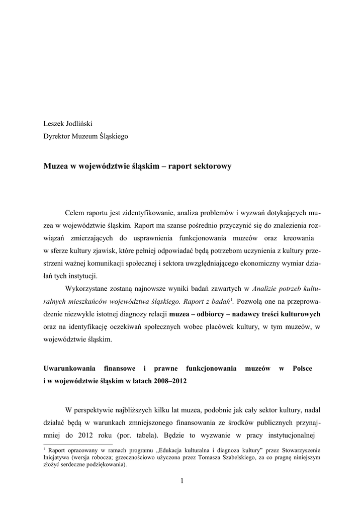 Leszek Jodliński Dyrektor Muzeum Śląskiego Muzea w województwie śląskim – raport sektorowy Celem raportu jest zidentyfikowanie, analiza problemów i wyzwań dotykających muzea w województwie śląskim. Raport ma szanse pośrednio przyczynić się do znalezienia rozwiązań zmierzających do usprawnienia funkcjonowania muzeów oraz kreowania w sferze kultury zjawisk, które pełniej odpowiadać będą potrzebom uczynienia z kultury przestrzeni ważnej komunikacji społecznej i sektora uwzględniającego ekonomiczny wymiar działań tych instytucji. Wykorzystane zostaną najnowsze wyniki badań zawartych w Analizie potrzeb kulturalnych mieszkańców województwa śląskiego. Raport z badań 1. Pozwolą one na przeprowadzenie niezwykle istotnej diagnozy relacji muzea – odbiorcy – nadawcy treści kulturowych oraz na identyfikację oczekiwań społecznych wobec placówek kultury, w tym muzeów, w województwie śląskim. Uwarunkowania finansowe i prawne funkcjonowania muzeów w Polsce i w województwie śląskim w latach 2008–2012 W perspektywie najbliższych kilku lat muzea, podobnie jak cały sektor kultury, nadal działać będą w warunkach zmniejszonego finansowania ze środków publicznych przynajmniej do 2012 roku (por. tabela). Będzie to wyzwanie w pracy instytucjonalnej 1 Raport opracowany w ramach programu „Edukacja kulturalna i diagnoza kultury” przez Stowarzyszenie Inicjatywa (wersja robocza; grzecznościowo użyczona przez Tomasza Szabelskiego, za co pragnę niniejszym złożyć serdeczne podziękowania). 1 i programowej muzeów, m.in. w zakresie możliwych działań reformujących ich funkcjonowanie. Prognozy zespołu prof. J. Hausnera (z 2009 roku2) zakładają, że choć wydatki publiczne na kulturę – zasilane przez środki UE – będą nadal rosły (w 2010 roku o 3,4%; w 2011 roku o 8,6%), to dopiero w 2011 roku wzrostowi temu towarzyszyć będzie zwiększenie wydatków budżetu państwa i jednostek samorządu terytorialnego na kulturę. 2004 Szacunki 2005 2006 2007 2008 Prognozy 2009 2010 2011 Budżet państwa 1,78 1,83 1,97 2,18 2,30 2,36 2,34 2,46 Jednostki samorządu terytorialnego 3,00 3,44 4,24 4,73 5,20 5,06 5,13 5,40 Środki funduszy strukturalnych 0,00 0,04 0,26 0,48 0,71 0,93 1,02 1,06 Publiczne nakłady na kulturę 4,78 5,30 6,46 7,39 8,21 8,35 8,49 8,92 Wydatki gospodarstw domowych 10,21 10,25 11,53 13,34 15,30 14,75 14,25 14,60 Wydatki na kulturę łącznie Udział łącznych wyd. na kulturę w PKB (w %) 14,99 15,56 18,00 20,73 23,51 23,10 22,73 23,52 1,62 1,58 1,70 1,76 1,85 1,83 1,79 1,80 Wyszczególnienie Źródło: Raport Kultura w kryzysie…, s. 13. Wydatki w mld złotych Negatywnie będzie się kształtował strumień środków płynących z gospodarstw domowych, które w warunkach kryzysu mocno ograniczą wydatki na konsumpcję dóbr kultury i w 2011 roku nadal będą to środki mniejsze od tych wydatkowanych w 2009 roku. Na tym tle wydatki samorządu województwa śląskiego na kulturę, zarówno dla podmiotów, dla których jest organizatorem (98 698 400; 2008; drugie miejsce w kraju), jak i wyasygnowane na zadania w dziedzinie kultury podejmowane przez inne podmioty w trybie konkursowym (115 742 200; 2008; drugie miejsce w kraju)3, uznać można za wysokie. Niestety, w przeliczeniu na jednego mieszkańca województwo śląskie, z kwotą 24,9 zł zajmuje 12 miejsce w kraju (2008; mazowieckie 49,5 zł; podlaskie 48,8 zł). Udział środków przeznaczonych na działalność programową w wydatkach całego budżetu kultury stanowił 3,1% w przypadku województwa śląskiego (podobnie województwo małopolskie; województwo wielkopolskie 3,5%; średnia krajowa 1,3%), co dowodzi pozy2 Opracowany w ramach dyskusji poprzedzającej Kongres Kultury Polskiej i negatywnie przyjęty podczas Kongresu we wrześniu 2009 roku. 3 Raport o finansowaniu i zarządzaniu instytucjami kultury; http://www.kongreskultury.pl/title,pid,287.html; pobranie 16.08.2010. 2 tywnej tendencji położenia nacisku na finansowanie działalności programowej instytucji. Cechą wydatków samorządów jest, od 2001 roku, dynamiczny wzrost wydatków majątkowych, co wiąże się m.in. z procesami modernizacji tego sektora, zwłaszcza po przejęciu go przez samorządy województw w 1999 roku i inwestycjami finansowymi ze środków UE. Ustrój prawny muzeów definiuje nowelizowana obecnie Ustawa o muzeach z 1996 roku, w której ustawodawca zmierza m.in. do lepszego zdefiniowania instytucji muzeum, wyrównania praw publicznych i prywatnych instytucji kultury oraz Ustawa o organizowaniu i prowadzeniu działalności kulturalnej z 1991 roku. Zakres jednak i kontekst polityki kulturalnej państwa, której podlegają muzea definiują zarówno regionalne dokumenty planistyczne, jak również dokumenty o wymiarze ogólnokrajowym, w tym Nowa strategia rozwoju kultury na lata 2004–2013 oraz zbiór najważniejszych dla funkcjonowania ustaw m.in. ustawy o finansach publicznych, prawa zamówień publicznych, ustawy o prawie autorskim i prawach pokrewnych, kodeks pracy itd. Przepisy prawa i ich analiza może z powodzeniem stanowić odrębny temat służący opisowi obecnej kondycji muzeów i wyzwań, jakie przed nimi stoją. Potencjał kulturowy województwa śląskiego Niniejszy rozdział zawiera analizę potencjału kulturowego przeprowadzoną na podstawie dokumentu Strategia Rozwoju Województwa Śląskiego na lata 2000–2020 oraz dostępnych danych na temat jej realizacji, związanych z okresową ewaluacją Strategii. Ostatnia z nich miała miejsce 10 czerwca 2009 roku podczas sesji Sejmiku Województwa Śląskiego. Województwo śląskie charakteryzuje wielokulturowość, wieloetniczność i wielokonfesyjność oraz silne utożsamianie się społeczności lokalnych z własną kulturą. Ten ostatni z procesów nasila się, czego objawem jest m.in. rosnąca liczba osób wskazujących na swoją śląską tożsamość (jako drugą obok narodowej) i przywiązanie do mowy śląskiej.