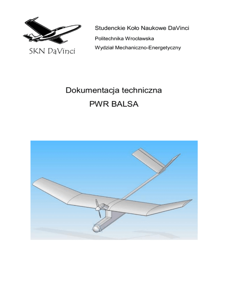 Studenckie Koło Naukowe DaVinci Politechnika Wrocławska Wydział Mechaniczno-Energetyczny Dokumentacja techniczna PWR BALSA 1. Wstęp a. Historia uczestnictwa Politechnika Wrocławska i koło naukowe Da Vinci uczestniczyło już w konkursie na bezzałogowy statek powietrzny w roku 2005, 2006 i 2009. b. Organizacja zespołu Karol Łukaszewski – absolwent Inżynierii Lotniczej, student 2-go roku Budownictwa, koordynator, projektant Jakub Kluz – absolwent Inżynierii Lotniczej, koordynator, pilot Piotr Leśniak – student 2-go roku WME, MiBM Aleksander Marcinkiewicz - student 2-go roku WME, MiBM Karol Rosiak – student 4-go roku WME, MiBM Roman Kierzkowski – doktorant Wydz. Informatyki Grzegorz Duszyński – student 2-go roku Wydz. Informatyki c. Realizacja pracy dyplomowej. Bezzałogowy statek latający PWR BALSA jest realizacją pracy dyplomowej jednego z członków zespołu – Karola Łukaszewskiego. Praca ta zawiera m.in. projekt aerodynamiczny i sylwetkę płatowca. 2. Projekt a. Założenia projektowe masa maksymalna startowa do 5 kg, możliwie duża długotrwałość lotu, z jak najmniejszym wydatkiem energetycznym, w stanie gotowym do transportu płatowiec musi zmieścić się w pojemniku transportowym o wymiarach wewnętrznych 1000 x 300 x 350 mm, wyposażony w system spadochronowy zapewniający wyhamowanie prędkości lotu i lądowanie z prędkością pionową nie większą niż 7 m/s, prezentacja graficzna aktualnej pozycji, kierunku lotu, wysokości, prędkości lotu BSL przekazywanie obrazu z kamery w czasie rzeczywistym, rejestracja obrazu z kamery, prezentacja graficzna zadanej trasy lotu, rejestracja pozycji samolotu, przekazywanie parametrów lotu, kierunku i odległości samolotu od stacji naziemnej, przekazywanie warunków atmosferycznych: prędkości i kierunku wiatru, temperatury powietrza, warunków oblodzenia. b. Sposób realizacji misji Na podstawie obrazu wyświetlanego na monitorze komputera danych przekazywanych z czujników telemetrycznych oraz przez obserwacje przez lornetkę będzie oceniana aktualna pozycja, i prowadzone działania w celu realizacji misji. c. Dobór układu W celu osiągnięcia optymalnej długotrwałości lotu konstrukcja będzie łączyła w sobie cechy szybowca i samolotu. Charakterystyki geometryczne projektowanego bezpilotowego statku latającego zostały dobrane m.in. na podstawie porównywanych konstrukcji. zdecydowano, że bezzałogowy statek latający będzie górnopłatem z wolnonośnym skrzydłem i ciągnącym śmigłem. Aby uniknąć ewentualnych uszkodzeń sterów przy klasycznym lądowaniu wybrano usterzenie motylkowe. W zależności od profilu misji będzie możliwe lądowanie klasyczne na brzuchu lub lądowanie na spadochronie. Silnik zamontowany zostanie w przedniej części kadłuba aby uchronić się przed możliwością wplątania w łopatki śmigła linek spadochronu, który może pełnić rolę awaryjnego systemu lądowania. Skrzydło będzie dzieliło się na prosty centropłat i trapezowe uszka zamontowane z kątem wzniosu. Będzie ono zamontowane po obu stronach pylonu wyrastającego z kadłuba. Pylon będzie w sobie mieścił komorę spadochronową, którą można (w opcji bez spadochronu) wykorzystać na zwiększenie przestrzeni ładunkowej. Jego wysokość zapewni swobodę pracy wirnika śmigła. Z przedniej części pylonu będzie „wychodzić” gondola silnikowa. W przedniej części kadłuba zostanie zamontowana głowica z kamerą, natomiast do tylnej belka ogonowa. Sterowanie będzie odbywać się za pomocą usterzenia oraz lotek zamontowanych w uszkach. d. Dobór parametrów masowych i geometrycznych Aby przyjąć określone wymiary konstrukcji statku powietrznego należy kierować się pewnymi wytycznymi, na przykład obciążeniem powierzchni nośnej lub obciążeniem siły ciągu zespołu napędowego. W projekcie do określenia powierzchni skrzydła posłużono się parametrem obciążenia powierzchni nośnej. Na podstawie analizy istniejących konstrukcji, otrzymano obciążenie powierzchni nośnej w zakresie od 70 do 113 g . Literatura dopuszcza dla zdalnie sterowanych motoszybowców dm 2 wartości zarówno niższe jaki i wyższe. W celu zmniejszenia prędkości lotu w stosunku do istniejących bezzałogowych statków latających przyjęto niższe niż dla nich obciążenie powierzchni skrzydła równe: q skrz 62,5 g dm 2 Przyjęto powyższe, ponieważ w założeniach położono nacisk na długotrwałość lotu a nie na zasięg, w związku z czym prędkość przelotowa może być niższa. Obniżenie obciążenia niesie za sobą spadek prędkości opadania, za którym idzie wzrost długotrwałości lotu. Z powodów ograniczeń wynikających z regulaminu przyjęto do obliczeń masę wynoszącą 5kg. Dla przyjętego obciążenia oraz masy wyznaczono powierzchnię skrzydła: S 5000 g 80dm 2 0,80m 2 g 62,5 2 dm Dla określonej powierzchni nośnej kolejnym krokiem jest wyznaczenie rozpiętości. Aby tego dokonać należy kierować się parametrem jakim jest wydłużenie płata dla danego typu statków powietrznych. Jako że projektowany bezzałogowy statek latający ma łączyć w sobie cechy szybowca i samolotu transportowego jego wydłużenie powinno zawierać się w wartościach bliskich granicom charakterystycznym dla tych typów statków. Rozpiętość przyjęto równą: b 2,90m następnie obliczono wydłużenie według zależności: b 2 2,9 10,5 S 0,8 2 Otrzymane wydłużenie znajduje się w górnym zakresie wartości dla samolotów transportowych oraz nieco poniżej dolnego dla szybowców. Pozostałe parametry geometryczne charakteryzujące płat nośny: bc 1,50m c p 0,30m rozpiętość centropłata cięciwa centropłata cięciwa na końcu skrzydła ck 0,20m Cięciwa aerodynamiczna obliczona została analitycznie na podstawie wzoru: We wzorze skrzydle, a kadłubie. 2 1 3 1 ca 1 c śr 31 1 1 należy rozumieć jako ułamek określający udział rozpiętości centropłata w całym to zbieżnoś