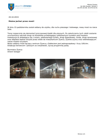 Miasto Żywiec 34-300 Żywiec, Rynek 2 33-475-42-00, 33-475-42-01 20.10.2015 Można jechać przez most! W dniu 15 października został oddany do użytku, dla ruchu pieszego i kołowego, nowy most na rzece Sole. Teraz rozpocznie się demontaż tymczasowej kładki dla pieszych. Po zakończeniu tych robót zostanie uruchomiony odcinek drogi na Korbielów przebiegający półotwartym tunelem pod mostem. Inwestycja ta składająca się z mostu, półotwartego tunelu, drogi dojazdowej, ronda, drogi serwisowej oraz deptaka będzie służyła przez wiele lat mieszkańcom Żywca, Żywiecczyzny oraz odwiedzającym nasze miasto turystom. Nowo oddany most łączący centrum Żywca z Zabłociem jest jednoprzęsłowy i liczy 109,4m. Dziękuję kierowcom i pieszym za cierpliwość, życzę przyjemnej jazdy. Burmistrz Żywca Antoni Szlagor Strona 1/1 Powered by TCPDF (www.tcpdf.org)