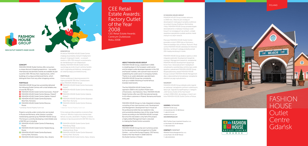 6 5 3 2 1 9 48 CONCEPT FASHION HOUSE Outlet Centres offer consumers a unique discount shopping experience – top quality international and domestic brands are available all year round for 30%-70% less than original prices, within buildings of a unique architectural theme, which distinguish them from any other shopping centres. KONCEPCJA W ofercie FASHION HOUSE Outlet Centre znajdują się produkty znanych międzynarodowych i krajowych marek – w cenach średnio o 30%-70% niższych w porównaniu do standardowych cen sklepowych. Obiekty FASHION HOUSE Outlet Centre wyróżniają się na tle innych centrów handlowych oryginalną architekturą, nawiązującą do lokalnej tradycji architektonicznej. PORTFOLIO FASHION HOUSE Group has successfully delivered the following Outlet Centres with a total lettable area of over 85,700 sq m: 1 FASHION HOUSE Outlet Centre Sosnowiec, Poland* 2 FASHION HOUSE Outlet Centre Warsaw, Poland* 3 FASHION HOUSE Outlet Centre Gdańsk, Poland* 4 FASHION HOUSE Outlet Centre Bucharest, West Park, Romania 5 FASHION HOUSE Outlet Centre Moscow, Russia PORTFOLIO Centra outletowe (o łącznej powierzchni najmu ponad 85 700 mkw.) zrealizowane przez FASHION HOUSE Group: 1 FASHION HOUSE Outlet Centre Sosnowiec, Polska* 2 FASHION HOUSE Outlet Centre Warszawa, Polska* 3 FASHION HOUSE Outlet Centre Gdańsk, Polska* 4 FASHION HOUSE Outlet Centre Bukareszt West Park, Rumunia 5 FASHION HOUSE Outlet Centre Moskwa, Rosja * owned by Polonia Property Fund II Ltd * własność Polonia Property Fund II Ltd Projects currently under construction are located in Russia and Romania, while Ukraine is another market being opened up by FASHION HOUSE Group. The Group is currently developing a total lettable area of 68,700 sq m including: 6 FASHION HOUSE Outlet Centre St Petersburg, Russia 7 FASHION HOUSE Outlet Centre Yekaterinburg, Russia 8 FASHION HOUSE Outlet Centre Bucharest, Cernica Park, Romania 9 FASHION HOUSE Outlet Centre, Kiev, Ukraine Firma realizuje kilka projektów na terenie Rosji i Rumunii. Wkrótce rozpocznie również działalność na rynku ukraińskim. Projekty w trakcie realizacji (o łącznej powierzchni 68 700 mkw.) to: 7 CEE Retail Estate Awards: Factory Outlet of the Year 2008 CEE Retail Estate Awards: Centrum Outletowe Roku 2008 ABOUT FASHION HOUSE GROUP FASHION HOUSE Group, established in 2000, is a leading player in the European outlet sector and the largest outlet developer/operator in the CEE and Russian markets, with a proven track record of establishing the outlet sector in emerging markets. Thanks to an outlet-dedicated, specialist team, FASHION HOUSE Group has consistently built up a notable following of world-famous branded retail tenants. The first FASHION HOUSE Outlet Centre opened in 2004 in the southern Polish town of Sosnowiec, near Katowice. Now, FASHION HOUSE Outlet Centres offer over 250 international brands to 10 million customers in Poland, Romania and Russia every year. FASHION HOUSE Group is a fully integrated company consisting of two main business units: Development and Management. Development has in-house all the professional skills that are needed to fully and successfully develop a top-of-the-range Outlet Centre according to the FASHION HOUSE concept. But since the real estate is only half of the project, a highly skilled Management team is devoted to making the Outlet Centre successful. 6 FASHION HOUSE Outlet Centre Sankt Petersburg, Rosja 7 FASHION HOUSE Outlet Centre Jekaterynburg, Rosja 8 FASHION HOUSE Outlet Centre Bukareszt Cernica Park, Rumunia 9 FASHION HOUSE Outlet Centre, Kijów, Ukraina POLAND O FASHION HOUSE GROUP FASHION HOUSE Group została założona w 2000 roku. Obecnie jest wiodącym deweloperem realizującym projekty outletowe na rynkach Europy Środkowo-Wschodniej i Rosji. FASHION HOUSE Group posiada bogate doświadczenie w realizacji inwestycji outletowych na rozwijających się rynkach, a dzięki zespołowi specjalistów zyskała zaufanie marek znanych na całym świecie. Pierwsze FASHION HOUSE Outlet Centre powstało w lutym 2004 roku w Sosnowcu. Obecnie każdego roku w Polsce, Rumunii i Rosji centra FASHION HOUSE odwiedza 10 milionów klientów, na których czekają produkty ponad 250 międzynarodowych marek. FASHION HOUSE Group działa w oparciu o dwie integralne jednostki: Development (zespół ds. rozwoju) i Management (zespół ds. zarządzania). FASHION HOUSE Development dysponuje know-how i doświadczeniem niezbędnym w budowaniu wysokiej klasy centrów typu outlet, zgodnie z założeniami FASHION HOUSE Group. Wyspecjalizowany zespół FASHION HOUSE Group w ramach FASHION HOUSE Management dba o odpowiednią komercjalizację i zarządzanie obiektem po jego wybudowaniu. NAGRODY FASHION HOUSE Group zdobyła wiele nagród za realizację i zarządzanie centrami outletowymi, takich jak. nagroda EuropaProperty w kategorii „CEE Factory Outlet of the Year Award” w latach 2008-2010, dla każdego z trzech centrów FASHION HOUSE Outlet Centre w Polsce. FASHION HOUSE Outlet Centre Gdańsk LEASING / WYNAJEM FASHION HOUSE Group Al. Jerozolimskie 212, 02-486 Warsaw T: +48 22 571 44 44 [email protected] www.fashionhouse.com BOIG The Blue Ocean Investment Group Sp. z o.o. al. Jana Pawła II 25, 00-854 Warsaw RECOGNITION FASHION HOUSE Group has won numerous prizes for the development and management of Outlet Centres – such as the Europa Property ‘CEE Factory Outlet of the Year Award’ in 2008-2010 for the Outlet Centres in Poland. T: +48 22 653 46 20 CONTACT / КОNТАКT PEAKSIDE Polonia Management Sp. z o.o. al. Jana Pawła II 29, 00-867 Warsaw T: +48 22 653 69 00 G D A Ń S K POLSKA FASHION HOUSE OUTLET CENTRE GDAŃSK Located in the Tricity Region on the Baltic coast in Poland, FASHION HOUSE Outlet Centre Gdańsk enjoys great popularity amongst customers – both locals and the 1.5 million tourists visiting the coastal region each year – thanks to the perfect combination of national and international, highstreet and lux