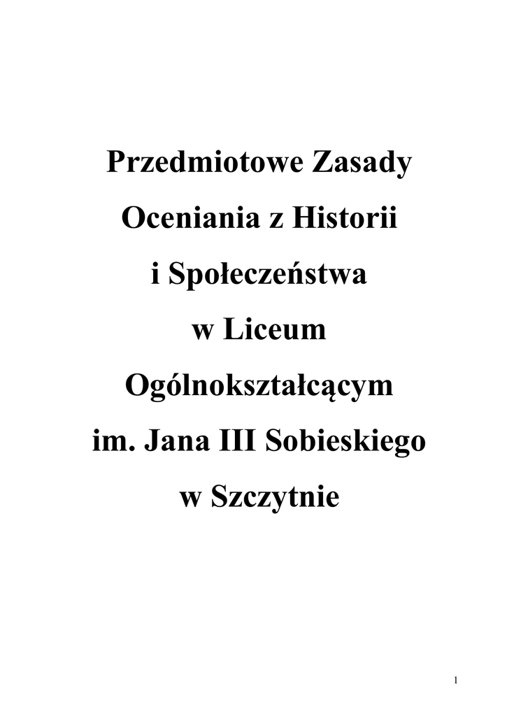 Przedmiotowe Zasady Oceniania z Historii i Społeczeństwa w Liceum Ogólnokształcącym im. Jana III Sobieskiego w Szczytnie 1 I Metryczka przedmiotowych zasad oceniania w roku szkolnym 2016 / 2017 - Przedmiot nauczania: Historia i społeczeństwo klasy II A, B, C, D, III A, III B, III C, III D - Nauczyciele uczący: mgr Wojciech Gramowski, mgr Elżbieta Weichhaus – Kończyk Polecany podręcznik - klasy II A M. Markowicz, O. Pytlińska, A. Wyroda - „ Historia i społeczeństwo – Ojczysty Panteon i ojczyste spory” WSiP Warszawa 2013. Nr dopuszczenia 644/1/2013 M. Markowicz, O. Pytlińska, A. Wyroda - „ Historia i społeczeństwo – Europa i świat” WSiP Warszawa 2013. Nr dopuszczenia 667/1/2013 M. Markowicz, O. Pytlińska, A. Wyroda - „ Historia i społeczeństwo – Rządzący i rządzeni” WSiP Warszawa 2013. Nr dopuszczenia 667/4/2013 Polecany podręcznik - klasy II B, C, D, M. Markowicz, O. Pytlińska, A. Wyroda - „ Historia i społeczeństwo – Ojczysty Panteon i ojczyste spory” WSiP Warszawa 2013. Nr dopuszczenia 644/1/2013 M. Markowicz, O. Pytlińska, A. Wyroda - „ Historia i społeczeństwo – Europa i świat” WSiP Warszawa 2013. Nr dopuszczenia 667/1/2013 Polecany podręcznik - klasy III A, B, C, D, M. Markowicz, O. Pytlińska, A. Wyroda - „ Historia i społeczeństwo – Wojna i wojskowość” WSiP Warszawa 2013. Nr dopuszczenia 667/3/2013 II Cele przedmiotowych zasad oceniania. Ocenianie bieżące z zajęć edukacyjnych ma na celu monitorowanie pracy ucznia oraz przekazywanie uczniowi informacji o jego osiągnięciach edukacyjnych pomagających w uczeniu się, poprzez wskazanie, co uczeń robi dobrze, co i jak wymaga poprawy oraz jak powinien dalej się uczyć. Przedmiotowe Zasady Oceniania zapewniają: PZO mają zapewnić rodzicowi: - znajomość wymagań edukacyjnych, - bieżącą informację o postępach w nauce ucznia. PZO mają zapewnić uczniowi: - znajomość wymagań edukacyjnych, - bieżące określenie poziomu opanowania wiadomości i umiejętności, - systematyczne dokumentowanie postępów w nauce, - motywowanie do samorozwoju, - wyrabianie nawyku do systematycznej pracy, - aktywne uczestniczenie w procesie oceniania oraz możliwości poprawy własnych osiągnięć. PZO mają zapewnić nauczycielowi: - ocenianie poziomu wiedzy i umiejętności uczniowskich, - zasady współpracy z uczniami przy ocenianiu procesu dydaktycznego. 2 III Przedmiot i zasady oceniania. Przedmiot historia i społeczeństwo jest skierowany do uczniów zainteresowanych naukami matematycznymi i przyrodniczymi. Jak ujmują to autorzy podstawy programowej, celem przedmiotu jest poszerzenie wiedzy uczniów „z zakresu historii z elementami wiedzy o społeczeństwie i wiedzy o kulturze”. Ma im ona pomóc w zrozumieniu współczesnego świata oraz w autoidentyfikacji w otaczającej ich rzeczywistości. W szkole będą realizowane następujące wątki tematyczne: Ojczysty Panteon i ojczyste spory. Europa i świat. Rządzący i rządzeni. Wojna i wojskowość. Ocenianiu na lekcjach historii i społeczeństwa w szczególności podlega: a) znajomość: - faktografii, - postaci historycznych, - procesów politycznych i społeczno – gospodarczych, - zjawisk kulturowych, b) umiejętność: - posługiwania się mapą, - dokonania analizy przyczynowo - skutkowej, - wnioskowania i uogólniania, - redagowania odpowiedzi tak pisemnej jak i ustnej, - analizy źródeł historycznych, - łączenia wiedzy historycznej z wiedzą o społeczeństwie i zjawiskach kulturowych Polski, Europy i świata. Poniżej został określony zakres wiadomości i umiejętności ucznia, który powinien opanować na poszczególne oceny. Wymagania te zgodne są ze standardami wymagań zawartymi w podstawie programowej i programie nauczania. Wypowiedzi ustne i pisemne prace ucznia oraz jego aktywność oceniane są w formie pisemnej lub ustnej. Oceny zostają udokumentowane w dzienniku lekcyjnym stopniem. Stopień celujący otrzymuje uczeń, który: wyczerpująco opanował cały materiał podstawy programowej, samodzielnie i twórczo rozwija własne uzdolnienia, proponuje nietypowe rozwiązania, wypowiada się płynnie, konkretnie oraz poprawnie pod względem językowym, jego wypowiedzi są dojrzałe językowo i stylistycznie, bierze udział w konkursach przedmiotowych i odnosi sukcesy, wiąże wiadomości w logiczny układ, korzysta z różnych źródeł informacji, potrafi korzystać z map historycznych. Stopień bardzo dobry otrzymuje uczeń, który: wyczerpująco opanował cały materiał podstawy programowej, umiejętnie wykorzystuje wiadomości w teorii i w praktyce bez pomocy nauczyciela, właściwie rozumie uogólnienia i związki między nimi oraz wyjaśnia zjawiska historyczne, 3 wybiera, porządkuje i rozwija informacje w celu skonstruowania dobrze ułożonej wypowiedzi, samodzielnie interpretuje dane z różnych źródeł historycznych, potrafi korzystać z map historycznych. Stopień dobry otrzymuje uczeń, który: opanował wymagania określone w podstawie programowej, analizuje i porównuje informacje zawarte w różnych źródłach historycznych, wyjaśnia przyczyny i skutki omawianych wydarzeń, podstawowe pojęcia i prawa ujmuje w terminach naukowych, samodzielnie wypowiada się w sposób umiarkowanie spójny, wybiera i porządkuje informacje z różnych źródeł, aby skonstruować poprawnie ułożoną wypowiedź, z wykorzystaniem dat i pojęć historycznych, stosuje wiedzę w sytuacjach teoretycznych i praktycznych. potrafi korzystać z map historycznych. Stopień dostateczny otrzymuje uczeń, który: w podstawowym stopniu opanował wymagania określone w podstawie programowej, przedstawia główne przyczyny i etapy rozwoju wydarzeń, potrafi logicznie połączyć wiadomości podstawowe, z pomocą nauczyciela wykorzystuje wiadomości do celów praktycznych i teoretycznych, tworzy wypowiedzi ustne i pisemne, wewnętrznie uporządkowane, z właściwym użyciem dat i pojęć historyczn