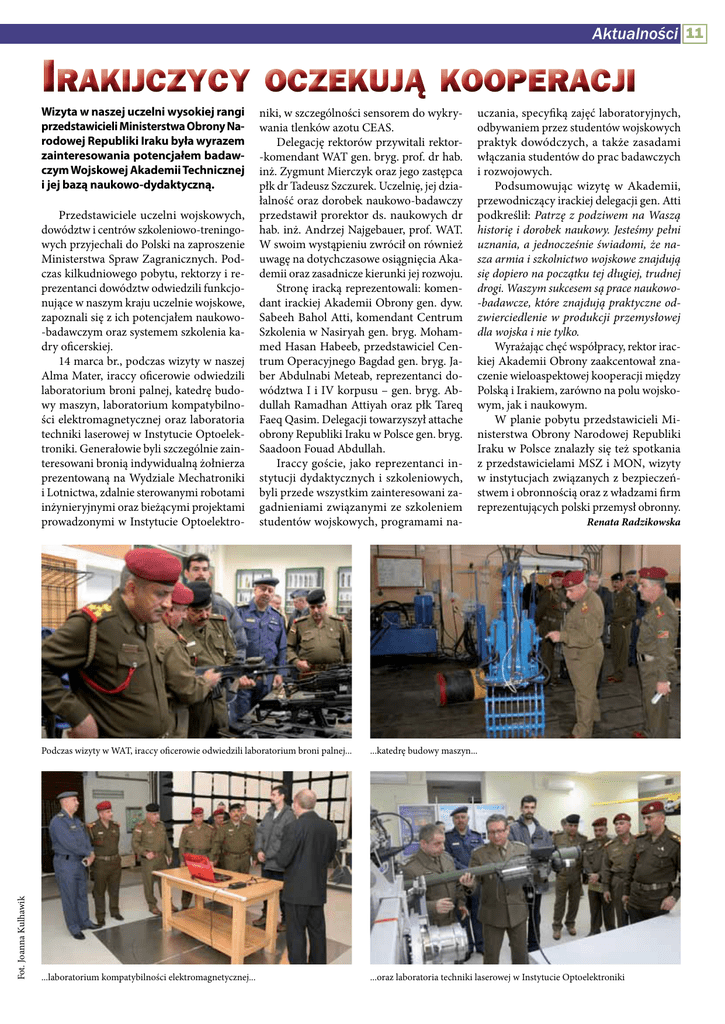 Aktualności 11 irakijczycy Wizyta w naszej uczelni wysokiej rangi przedstawicieli Ministerstwa Obrony Narodowej Republiki Iraku była wyrazem zainteresowania potencjałem badawczym Wojskowej Akademii Technicznej i jej bazą naukowo-dydaktyczną. Fot. Joanna Kulhawik Przedstawiciele uczelni wojskowych, dowództw i centrów szkoleniowo-treningowych przyjechali do Polski na zaproszenie Ministerstwa Spraw Zagranicznych. Podczas kilkudniowego pobytu, rektorzy i reprezentanci dowództw odwiedzili funkcjonujące w naszym kraju uczelnie wojskowe, zapoznali się z ich potencjałem naukowo-badawczym oraz systemem szkolenia kadry oficerskiej. 14 marca br., podczas wizyty w naszej Alma Mater, iraccy oficerowie odwiedzili laboratorium broni palnej, katedrę budowy maszyn, laboratorium kompatybilności elektromagnetycznej oraz laboratoria techniki laserowej w Instytucie Optoelektroniki. Generałowie byli szczególnie zainteresowani bronią indywidualną żołnierza prezentowaną na Wydziale Mechatroniki i Lotnictwa, zdalnie sterowanymi robotami inżynieryjnymi oraz bieżącymi projektami prowadzonymi w Instytucie Optoelektro- oczekują kooperacji niki, w szczególności sensorem do wykrywania tlenków azotu CEAS. Delegację rektorów przywitali rektor-komendant WAT gen. bryg. prof. dr hab. inż. Zygmunt Mierczyk oraz jego zastępca płk dr Tadeusz Szczurek. Uczelnię, jej działalność oraz dorobek naukowo-badawczy przedstawił prorektor ds. naukowych dr hab. inż. Andrzej Najgebauer, prof. WAT. W swoim wystąpieniu zwrócił on również uwagę na dotychczasowe osiągnięcia Akademii oraz zasadnicze kierunki jej rozwoju. Stronę iracką reprezentowali: komendant irackiej Akademii Obrony gen. dyw. Sabeeh Bahol Atti, komendant Centrum Szkolenia w Nasiryah gen. bryg. Mohammed Hasan Habeeb, przedstawiciel Centrum Operacyjnego Bagdad gen. bryg. Jaber Abdulnabi Meteab, reprezentanci dowództwa I i IV korpusu – gen. bryg. Abdullah Ramadhan Attiyah oraz płk Tareq Faeq Qasim. Delegacji towarzyszył attache obrony Republiki Iraku w Polsce gen. bryg. Saadoon Fouad Abdullah. Iraccy goście, jako reprezentanci instytucji dydaktycznych i szkoleniowych, byli przede wszystkim zainteresowani zagadnieniami związanymi ze szkoleniem studentów wojskowych, programami na- uczania, specyfiką zajęć laboratoryjnych, odbywaniem przez studentów wojskowych praktyk dowódczych, a także zasadami włączania studentów do prac badawczych i rozwojowych. Podsumowując wizytę w Akademii, przewodniczący irackiej delegacji gen. Atti podkreślił: Patrzę z podziwem na Waszą historię i dorobek naukowy. Jesteśmy pełni uznania, a jednocześnie świadomi, że nasza armia i szkolnictwo wojskowe znajdują się dopiero na początku tej długiej, trudnej drogi. Waszym sukcesem są prace naukowo-badawcze, które znajdują praktyczne odzwierciedlenie w produkcji przemysłowej dla wojska i nie tylko. Wyrażając chęć współpracy, rektor irackiej Akademii Obrony zaakcentował znaczenie wieloaspektowej kooperacji między Polską i Irakiem, zarówno na polu wojskowym, jak i naukowym. W planie pobytu przedstawicieli Ministerstwa Obrony Narodowej Republiki Iraku w Polsce znalazły się też spotkania z przedstawicielami MSZ i MON, wizyty w instytucjach związanych z bezpieczeństwem i obronnością oraz z władzami firm reprezentujących polski przemysł obronny. Renata Radzikowska Podczas wizyty w WAT, iraccy oficerowie odwiedzili laboratorium broni palnej... ...katedrę budowy maszyn... ...laboratorium kompatybilności elektromagnetycznej... ...oraz laboratoria techniki laserowej w Instytucie Optoelektroniki
