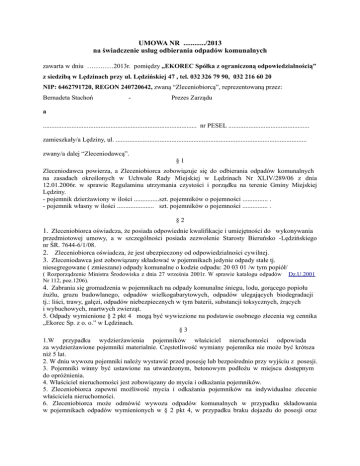 UMOWA NR ............/2013 na świadczenie usług odbierania odpadów komunalnych zawarta w dniu …………2013r. pomiędzy „EKOREC Spółka z ograniczoną odpowiedzialnością” z siedzibą w Lędzinach przy ul. Lędzińskiej 47 , tel. 032 326 79 90, 032 216 60 20 NIP: 6462791720, REGON 240720642, zwaną “Zleceniobiorcą”, reprezentowaną przez: Bernadeta Stachoń - Prezes Zarządu a ........................................................................................... nr PESEL ................................................ zamieszkały/a Lędziny, ul. ................................................................................................................. zwany/a dalej “Zleceniodawcą”. §1 Zleceniodawca powierza, a Zleceniobiorca zobowiązuje się do odbierania odpadów komunalnych na zasadach określonych w Uchwale Rady Miejskiej w Lędzinach Nr XLIV/289/06 z dnia 12.01.2006r. w sprawie Regulaminu utrzymania czystości i porządku na terenie Gminy Miejskiej Lędziny. - pojemnik dzierżawiony w ilości ...............szt. pojemników o pojemności ............... . - pojemnik własny w ilości ...................... szt. pojemników o pojemności ............... . §2 1. Zleceniobiorca oświadcza, że posiada odpowiednie kwalifikacje i umiejętności do wykonywania przedmiotowej umowy, a w szczególności posiada zezwolenie Starosty Bieruńsko -Lędzińskiego nr ŚR. 7644-6/1/08. 2. Zleceniobiorca oświadcza, że jest ubezpieczony od odpowiedzialności cywilnej. 3. Zleceniodawca jest zobowiązany składować w pojemnikach jedynie odpady stałe tj. niesegregowane ( zmieszane) odpady komunalne o kodzie odpadu: 20 03 01 /w tym popiół/ ( Rozporządzenie Ministra Środowiska z dnia 27 września 2001r. W sprawie katalogu odpadów Nr 112, poz.1206). Dz.U.2001 4. Zabrania się gromadzenia w pojemnikach na odpady komunalne śniegu, lodu, gorącego popiołu żużlu, gruzu budowlanego, odpadów wielkogabarytowych, odpadów ulegających biodegradacji tj.: liści, trawy, gałęzi, odpadów niebezpiecznych w tym baterii, substancji toksycznych, żrących i wybuchowych, martwych zwierząt. 5. Odpady wymienione § 2 pkt 4 mogą być wywiezione na podstawie osobnego zlecenia wg cennika „Ekorec Sp. z o. o.” w Lędzinach. §3 1.W przypadku wydzierżawienia pojemników właściciel nieruchomości odpowiada za wydzierżawione pojemniki materialnie. Częstotliwość wymiany pojemnika nie może być krótsza niż 5 lat. 2. W dniu wywozu pojemniki należy wystawić przed posesję lub bezpośrednio przy wyjściu z posesji. 3. Pojemniki winny być ustawione na utwardzonym, betonowym podłożu w miejscu dostępnym do opróżnienia. 4. Właściciel nieruchomości jest zobowiązany do mycia i odkażania pojemników. 5. Zleceniobiorca zapewni możliwość mycia i odkażania pojemników na indywidualne zlecenie właściciela nieruchomości. 6. Zleceniobiorca może odmówić wywozu odpadów komunalnych w przypadku składowania w pojemnikach odpadów wymienionych w § 2 pkt 4, w przypadku braku dojazdu do posesji oraz gdy masa pojemnika przekracza całkowitą masę dopuszczalną określoną przez producenta, tj. 50 kg- poj.110 l, 110 kg- poj.240 l. §4 1. Cena za wywóz i składowanie odpadów komunalnych zmieszanych wynosi: 19,00 zł + podatek VAT za 1 pojemnik 110 l i 120 l 38,00 zł + podatek VAT za 1 pojemnik 240 l 2. Dzierżawa pojemnika wynosi: 3,70 zł + podatek VAT za 1 pojemnik 110 l i 120 l 5,80 zł + podatek VAT za 1 pojemnik 240 l 3. Cena za odbiór odpadów komunalnych segregowanych, ulegających biodegradacji w systemie workowym tj. ścięta trawa, liście, drobne gałęzie, chwasty wynosi: 10,00 zł + podatek VAT za 1 worek 120 l. 4. Zmiana cen nie wymaga aneksu do umowy i będzie każdorazowo ogłaszana w prasie lokalnej. §5 1. Zleceniobiorca będzie opróżniał tylko pełne pojemniki. Nieczystości będące poza pojemnikami nie będą zbierane. 2. Właściciel nieruchomości zobowiązany jest do wyposażenia się w taką ilość pojemników, która zapewnia gromadzenie odpadów z terenu nieruchomości w sposób gwarantujący zachowanie czystości i porządku na nieruchomości. 3. W przypadku braku odpadów w danym miesiącu, Zleceniobiorca obciąży Zleceniodawcę ryczałtowym kosztem wywozu 1 pojemnika tj. 19,00 zł + podatek VAT. §6 1. Należności za wywóz nieczystości regulowane będą na podstawie faktur wystawionych w systemie dwumiesięcznym na konto Zleceniobiorcy w: Banku PKO BP o/Tychy 46 1020 2528 0000 0802 0196 6290 lub w kasie „Ekorec Sp. z o. o.” w Lędzinach, ul. Lędzińska 47. 2. W razie stwierdzenia zaległości płatniczych za 2 kolejne, następujące po sobie okresy rozliczeniowe wywóz zostanie wstrzymany, a sprawa o windykację należności zostanie skierowana na drogę sądową w trybie natychmiastowym. Windykacja będzie obejmować należność główną wraz z odsetkami ustawowymi, liczonymi od dnia terminu zapłaty. W przypadku zaległości w regulowaniu płatności wysyłane będą do klientów wezwania do zapłaty. Koszt takiego wezwania wynosi 12,00zł i obciąża zobowiązanego. 3. Za datę realizacji płatności uznaje się dzień wpłaty w kasie Zleceniobiorcy lub dzień wpływu środków pieniężnych na rachunek bankowy Zleceniobiorcy wskazany na fakturze. 4. Faktury będą dostarczane przez pracowników „Ekorec Sp. z o. o.” w Lędzinach lub za pośrednictwem poczty. §7 1. Umowa zostaje zawarta na czas nieokreślony z mocą obowiązującą od dnia …………..2013r. 2. Z dniem wejścia w życie niniejszej umowy traci moc poprzednia umowa na świadczenie usług odbierania odpadów komunalnych zawarta pomiędzy Zleceniodawcą a „Ekorec Sp. z o. o .” 3. Rozwiązanie umowy może nastąpić z jednomiesięcznym wypowiedzeniem przez każdą ze stron. 4. Umowę sporządzono w 2 jednobrzmiących egzemplarzach po jednym dla każdej ze stron. Wyrażam zgodę na przetwarzanie moich danych osobowych zawartych w umowie na potrz