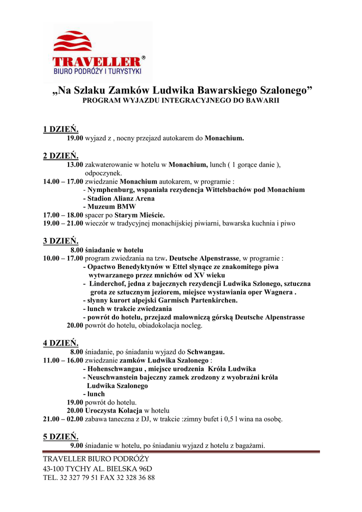 „Na Szlaku Zamków Ludwika Bawarskiego Szalonego” PROGRAM WYJAZDU INTEGRACYJNEGO DO BAWARII 1 DZIEŃ. 19.00 wyjazd z , nocny przejazd autokarem do Monachium. 2 DZIEŃ. 13.00 zakwaterowanie w hotelu w Monachium, lunch ( 1 gorące danie ), odpoczynek. 14.00 – 17.00 zwiedzanie Monachium autokarem, w programie : - Nymphenburg, wspaniała rezydencja Wittelsbachów pod Monachium - Stadion Alianz Arena - Muzeum BMW 17.00 – 18.00 spacer po Starym Mieście. 19.00 – 21.00 wieczór w tradycyjnej monachijskiej piwiarni, bawarska kuchnia i piwo 3 DZIEŃ. 8.00 śniadanie w hotelu 10.00 – 17.00 program zwiedzania na tzw. Deutsche Alpenstrasse, w programie : - Opactwo Benedyktynów w Ettel słynące ze znakomitego piwa wytwarzanego przez mnichów od XV wieku - Linderchof, jedna z bajecznych rezydencji Ludwika Szlonego, sztuczna grota ze sztucznym jeziorem, miejsce wystawiania oper Wagnera . - słynny kurort alpejski Garmisch Partenkirchen. - lunch w trakcie zwiedzania - powrót do hotelu, przejazd malowniczą górską Deutsche Alpenstrasse 20.00 powrót do hotelu, obiadokolacja nocleg. 4 DZIEŃ. 8.00 śniadanie, po śniadaniu wyjazd do Schwangau. 11.00 – 16.00 zwiedzanie zamków Ludwika Szalonego : - Hohenschwangau , miejsce urodzenia Króla Ludwika - Neuschwanstein bajeczny zamek zrodzony z wyobraźni króla Ludwika Szalonego - lunch 19.00 powrót do hotelu. 20.00 Uroczysta Kolacja w hotelu 21.00 – 02.00 zabawa taneczna z DJ, w trakcie :zimny bufet i 0,5 l wina na osobę. 5 DZIEŃ. 9.00 śniadanie w hotelu, po śniadaniu wyjazd z hotelu z bagaŜami. TRAVELLER BIURO PODRÓŻY 43-100 TYCHY AL. BIELSKA 96D TEL. 32 327 79 51 FAX 32 328 36 88 11.00 – 16.00 zwiedzanie kompleksu pałacowego Herrenchiemsee, w programie : - rejs statkiem spacerowym na wyspę - zwiedzanie Pałacu Ludwika Szalonego - powrót statkiem na parking - lunch 16.00 – 20.00 przejazd autokarem do hotelu w okolicy Wiednia, obiadokolacja, nocleg. 6 DZIEŃ. 8.00 śniadanie w hotelu, po śniadaniu przejazd do Wiednia. 10.00 – 13.00 krótkie zwiedzanie miasta, w programie : - UNO City i wieŜa Donauturm - przejazd Wiedeńskim Ringiem - spacer z Hohenmarkt do katedry św. Szczepana 13.00 – 15.00 czas wolny na Starym Mieście, wyjazd z Wiednia w drogę powrotną. 22.00 powrót do miejsca zbiórki, zakończenie Imprezy. Cena zawiera : podróŜ komfortowym autokarem, opiekę pilota na całej trasie, 3 noclegi w Monachium w pokojach 2 osobowych ( łazienka , TV ), 4 śniadania w formie bufetu, 4 jednodaniowe gorące posiłki w trakcie realizowania programu turystycznego, 2 obiadokolacje w hotelu, 1 obiadokolację w tradycyjnej bawarskiej piwiarni w Monachium, 1 uroczystą kolację połączoną z zabawą taneczną bilet powrotny na rejs statkiem na jeziorze Herrenchiemsee, opłaty drogowe i parkingowe, ubezpieczenie KL i NW, podatek VAT. Cena nie zawiera kosztów wstępów. TRAVELLER BIURO PODRÓŻY 43-100 TYCHY AL. BIELSKA 96D TEL. 32 327 79 51 FAX 32 328 36 88