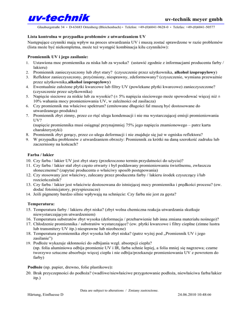uvuv-technik uv-technik meyer gmbh Glauburgstraße 34 • D-63683 Ortenberg (Bleichenbach) • Telefon: +49-(0)6041-9628-0 • Telefax: +49-(0)6041-50577 Lista kontrolna w przypadku problemów z utwardzaniem UV Następujące czynniki mają wpływ na proces utwardzania UV i muszą zostać sprawdzone w razie problemów (lista może być niekompletna, może też wystąpić kombinacja kilu czynników): Promiennik UV i jego zasilanie: 1. Ustawiona moc promiennika za niska lub za wysoka? (ustawić zgodnie z informacjami producenta farby / lakieru) 2. Promiennik zanieczyszczony lub zbyt stary? (czyszczenie przez użytkownika, alkohol izopropylowy) 3. Reflektor zanieczyszczony, przyćmiony, niesprawny, zdeformowany? (czyszczenie, wymiana przeważnie przez użytkownika,alkohol izopropylowy) 4. Ewentualnie założone płytki kwarcowe lub filtry UV (powlekane płytki kwarcowe) zanieczyszczone? (czyszczenie przez użytkownika) 5. Napięcie sieciowe za niskie lub za wysokie? (± 5% napięcia sieciowego może spowodować więcej niż ± 10% wahania mocy promieniowania UV, w zależności od zasilacza) 6. Czy promiennik ma właściwe spektrum? (emitowane długości fal muszą być dostosowane do utwardzanego produktu) 7. Promiennik zbyt zimny, przez co rtęć ulega kondensacji i nie ma wystarczającej emisji promieniowania UV? (napięcie promiennika musi osiągnąć przynajmniej 75% jego napięcia znamionowego – patrz karta charakterystyki) 8. Promiennik zbyt gorący, przez co ulega deformacji i nie znajduje się już w ognisku reflektora? 9. W przypadku problemów z utwardzaniem obrzeży: Promiennik za krótki na daną szerokość zadruku lub zaczerniony na końcach? Farba / lakier 10. Czy farba / lakier UV jest zbyt stary (przekroczono termin przydatności do użycia)? 11. Czy farba / lakier stał zbyt często otwarty i był poddawany promieniowaniu świetlnemu, zwłaszcza słonecznemu? (zapytać producenta o właściwy sposób postępowania) 12. Czy stosowany jest właściwy, zalecany przez producenta farby / lakieru środek czyszczący i/lub rozcieńczalnik? 13. Czy farba / lakier jest właściwie dostosowana do istniejącej mocy promiennika i prędkości procesu? (ew. dodać fotoinicjatory, przyspieszacze) 14. Jeśli pigmenty bardzo silnie wpływają na schnięcie: Czy farba nie jest za gęsta? Temperatura: 15. Temperatura farby / lakieru zbyt niska? (zbyt wolna chemiczna reakcja utwardzania skutkuje niewystarczającym utwardzeniem) 16. Temperatura substratów zbyt wysoka (deformacja / przebarwienie lub inna zmiana materiału nośnego)? 17. Chłodzenie promiennika / substratów wystarczające? (ew. płytki kwarcowe i filtry cieplne (zimne lustra lub transmitery UV itp.) niesprawne lub nieobecne) 18. Temperatura promiennika zbyt wysoka lub zbyt niska? (patrz wyżej pod „Promiennik UV i jego zasilanie”) 19. Podłoże wykazuje skłonności do odbijania wzgl. absorpcji ciepła? (np. folia aluminiowa odbija promienie UV i IR, farba schnie lepiej, a folia mniej się nagrzewa; czarne tworzywo sztuczne absorbuje więcej ciepła i nie odbija/przekazuje promieniowania UV z powrotem do farby) Podłoże (np. papier, drewno, folie plastikowe): 20. Brak przyczepności do podłoża? (wadliwe/niewłaściwe przygotowanie podłoża, niewłaściwa farba/lakier itp.) Data are subject to alterations / Zmiany zastrzeżone. Härtung, Einfluesse D 24.06.2010 10:48:00 uvuv-technik uv-technik meyer gmbh Glauburgstraße 34 • D-63683 Ortenberg (Bleichenbach) • Telefon: +49-(0)6041-9628-0 • Telefax: +49-(0)6041-50577 Seite/page 2 21. Bardzo chłonne podłoże? (farby/lakiery UV wsiąkają głęboko w podłoże i stają się tam niedostępne dla promieniowania UV) Maszyna drukująca / linia lakiernicza 22. Zespół drukujący / metoda druku niedostosowane do farb/lakierów UV? 23. Czy w zespole drukującym stosowane są odpowiednie materiały? (np. obciąg gumowy w przypadku druku offsetowego, itd.) 24. Prawidłowo ustawione parametry druku (nacisk wałków itp.)? Zmiany techniczne zastrzeżone. Härtung, Einfluesse D 2010-06-24 10:48:00