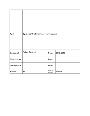 Tytuł: Opracował: Opis sieci teletechnicznych wymagania Robert Jaworski Data: Zaakceptował Data: Zaakceptował Data: Wersja 1.0 Status wersji 26.02.2013 robocza 1. Cel zadania Celem zadania jest budowa zgodnie z projektem budowlano-wykonawczym specyfikacją techniczną wykonania i odbioru robót oraz niniejszym dokumentem instalacji teletechnicznych w nowo projektowanym Lokalnym Centrum Aktywności Wiejskiej w Szczepanowie, którego usytuowanie planowane jest na działce nr 126/20 AM-2 przy ulicy Średzkiej. 2. Zakres zadania 1. Budowa i konfiguracja infrastruktury sieciowej (kablowa logiczna i elektryczna sieć strukturalna oraz sieć WiFi) -patrz pkt 3 2. Budowa i konfiguracja instalacji systemu telewizji użytkowej TVU (CCTV) -patrz pkt 4 3. Budowa i konfiguracja instalacji systemu sygnalizacji włamania i napadu SWIN (SSWiN) -patrz pkt 5 3. Budowa i konfiguracja infrastruktury sieciowej (kablowa logiczna i elektryczna sieć strukturalna oraz sieć WiFi) 3.1 Zakres pod zadania 1. Budowa centralnego punktu dystrybucyjnego sieci1 2. Budowa i konfiguracja infrastruktury sieci WiFi (tylko PEL w miejscach instalacji) 3.2 Wymogi ogólne 1. Należy wykorzystać elementy infrastruktury określone w załączniku 1 oraz przy budowie sieci uwzględnić wszystkie założenia i postulaty zawarte w niniejszym dokumencie i/lub o ile są one bardziej rygorystyczne z projektem budowlanowykonawczym oraz specyfikacją technicznej wykonania i odbioru robót) 1 W ramach niniejszego przetargu (dotyczy to wszystkich dokumentów będących biorących udział w niniejszym przetargu) zamawiający używa się zamiennie pojęć centralny punkt dystrybucyjny, CPD ,główny punkt dystrybucyjny ,GPD, serwerownia opis sieci teletechnicznych wymagania strona 2 z 18 2. Nowa sieć (teleinformatyczna miedziana) musi być wykonana w min. kategorii 5e 3. wykorzystany system okablowania (dla nowej sieci) musi być dostępny na polskim rynku min 5 lat 4. wykonawca musi zapewnić min. 36miesięczną w pełni bezpłatną gwarancję na wykonaną sieć 5. sieć musi być certyfikowana przez producenta systemu okablowania strukturalnego z gwarancją tegoż na min 25 lat (wykonawca musi przedstawić warunki potrzebne do utrzymania certyfikatu w okresie gwarancji producenta a jeżeli wymagać to będzie poniesienia kosztów przez zamawiającego w okresie świadczenia przez wykonawcę opieki gwarancyjnej o której mowa w punkcie powyżej wykonawca zobowiązany jest to wykazać w swojej ofercie jako dodatkowy koszt -i wliczyć go w ostateczną wartość oferty) 6. przybliżone miejsca PEL wykazane zostały przez zamawiającego na rysunkach (patrz Załącznik nr 1) natomiast miejsca doprowadzenia okablowania do Punktów Dostępowych (WiFi) załącznik 1 - prowadzenie tras oraz rozłożenie PEL i innych elementów infrastruktury musi zostać uzgodnione z zamawiającym 7. W przypadku prowadzenia okablowania teleinformatycznego i elektrycznego w jednym korycie obie instalacje muszą być od siebie odseparowane -koryto w przegrodą) 8. Po zakończeniu prac wykonawca przedstawi zamawiającemu w wersji elektronicznej (pliki *.odt, *.pdf ewentualnie *.dxf) i papierowej (trzy egzemplarze) dokumentacje podwykonawczą i protokoły pomiarów (sieć teleinformatyczna i elektryczna ) 9. Po zakończeniu prac w terminie max 1 m-ca wykonawca przedstawi zamawiającemu certyfikat producenta systemu okablowania strukturalnego obejmujący zakres o którym mowa w punktach powyżej. 10. Płatność za wykonanie prac to odpowiednio 80% po protokolarnym odbiorze prac o którym mowa w pkt 9 i 20% po dostarczeniu i protokolarnym odbiorze certyfikatu o którym mowa w pkt 9 -skorelować zresztą projektu !!! 11. Obwody elektryczne należy zabezpieczyć za pomocą zabezpieczeń różnicowoprądowych, serwerownia musi być wyposażona w awaryjny wyłącznik zasilania. 12. Wszystkie komponenty instalacji elektrycznej dedykowanej oraz logicznej muszą pochodzić od jednego producenta 13. Zamawiający ma obowiązek dostosować projekt a później zrealizować go zgodnie z obecnie obowiązującymi przepisami prawa i dobrymi praktykami biorąc pod uwagę fakt, że instalacja ta będzie służyć jako „element infrastruktury szkolnej” (wymagane oświadczenie o spełnieniu tego warunku trzeba będzie złożyć na ręce Zamawiającego w trakcie odbioru -będzie ono jednym z wymogów jego pozytywnej realizacji) opis sieci teletechnicznych wymagania strona 3 z 18 3.3 Wymogi szczegółowe Dotyczące sieci • • • • • • • • • • • • • • • • • • • • • • PEL -2x RJ45, 3xgniazdo elektryczne „z kluczem” przy Punktach Dostępu (AP -WIFI) -PEL to 1xRJ45 + 1x230V z kluczem PEL należy zbudować w formie dwóch gniazd w systemie Mosaic 45x45. Gniazdo logiczne w puszce 1M z adapterami prostymi, gniazdo elektryczne w puszce 3M (1M dla PEL przy AP). Komponenty sieci logicznej (kable, gniazda panele krosowe, patchcordy) muszą spełniać wymogi klasy E (kategorii 5) Okablowanie strukturalne należy oprzeć o przewód UTP kat. 5e (skrętka czteroparowa, nieekranowana) oraz o moduły keyston w wersji nieekranowanej. Instalację sieci elektrycznej dedykowanej należy wykonać przewodem YDY 3x2,5. Dopuszcza się zastosowanie przewodu OMY (linka) zamiast YDY (drut) pod warunkiem zachowania przekroju i ilości żył. W przypadku zastosowania przewodu OMY końcówki kabli należy zakończyć tulejkami zaciskanymi. Nie dopuszcza się pobielania (lutowania) przewodów ani pozostawienia przewodów bez jakiegokolwiek zabezpieczenia końcówek. Wszystkie komponenty sieci logicznej oraz dedykowanej elektrycznej muszą pochodzić od jednego producenta Należy zamontować jeden pełny PEL, na osobnym obwodzie elektrycznym w miejscu zamontowania urządzeń dostępu do sieci Internet (przyłącze telekomunikacyjne w serwerowni). Dostawa i montaż tych urządzeń nie jest objęta tym postępowaniem przetargowym wszystkie gniazda logiczne muszą być zak