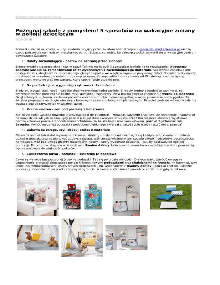 Tekst pochodzi z serwisu: Dekoria.pl Pożegnaj szkołę z pomysłem! 5 sposobów na wakacyjne zmiany w pokoju dziecięcym 2016-06-16 Poduszki, siedziska, kolory, wzory i materiał kryjący przed światem zewnętrznym – specjaliści marki Dekoria.pl wiedzą, czego potrzebuje najmłodszy mieszkaniec domu! Zobacz, co zrobić, by dziecięcy pokój zamienił się w wakacyjne centrum dowodzenia światem. 1. Rolety zaciemniające – postaw na ochronę przed słońcem Słońce przebija się przez okno i razi w oczy? Tak nie może być! Na szczęście istnieje na to rozwiązanie. Wystarczy zdecydować się na zamontowanie rolet wykonanych z zaciemniającego materiału. Skutecznie zablokują one dostęp światła, dzięki czemu w czasie największych upałów we wnętrzu zapanuje przyjemny chłód. Do zalet rolety należy możliwość różnorodnego montażu – do ramy okiennej, ściany, sufitu lub – na karniszu! W zależności od dostępnej przestrzeni warto wybrać ten wariant, który spełni Twoje oczekiwania. 2. Na podłodze jest wygodniej, czyli worek do siedzenia Siedzieć, biegać, stać, leżeć – dziecko chce wszystkiego jednocześnie. Z reguły trudno pogodzić te czynności, na szczęście rodzice podejmą się każdej misji specjalnej. Wystarczy, że w pokoju dziecka znajdzie się worek do siedzenia. Dzięki elastycznej formie siedziska pociecha może z nim robić niemal wszystko, a wciąż pozostanie ono wygodne. To świetna propozycja na długie wieczory z bajkowymi seansami lub grami planszowymi. Przecież podczas wakacji wcale nie trzeba siedzieć sztywno jak w szkolnej ławce. 3. Kraina marzeń – sen pod pościelą z bohaterem Sen to zdrowie! Dziecko powinno przesypiać od 8 do 10 godzin – wówczas cały jego organizm się regeneruje i nabiera sił na nowy dzień. Ale jak tu spać, gdy pościel jest już stara i wszystkim się znudziła? Rozwiązanie stanowią wyjątkowe, bardzo kolorowe pościele z podobiznami bohaterów ze świata bajek oraz komiksów np. pościel Spiderman lub Syrenka. Pomóc mogą też poduszki z podobizną ulubionego zwierzaka. Jakoś sobie trzeba radzić nocą, prawda? 4. Zabawa na całego, czyli zbuduj szałas z materiału Niewielki namiot lub stelaż wykonane z krzeseł i drabiny – mały Indianin zachwyci się każdym schronieniem! I dobrze, gdzieś trzeba skutecznie planować zdobycie świata. Jeśli chcesz właśnie w taki sposób ożywić i odświeżyć pokój dziecka na wakacje, weź pod uwagę płachty materiałów. Kolory i wzory wybierasz dowolnie – tak, by pasowały do ogólnej aranżacji. Może to być skąpana w szarościach tkanina Ashley. Uniwersalna, szara barwa uspokaja wzrok i z pewnością będzie pasowała do większości pokojów. 5. Cowieczorna bitwa – poduszki i siedziska to podstawa Czym są wakacje bez porządnej bitwy na poduszki! Tak się po prostu nie godzi. Dlatego warto zwrócić uwagę na uzupełnienie aranżacji dziecięcego pokoju kilkoma nowymi poduszkami oraz siedziskami na krzesła. Im barwniej, tym lepiej. Na różnokolorowych i estetycznych siedziskach – np. wykonanych z tkaniny Ashley – dziecko chętniej usiądzie podczas grillowania lub po prostu zabawy w ogrodzie. W końcu ruch i świeże powietrze każdemu wyjdą na zdrowie.