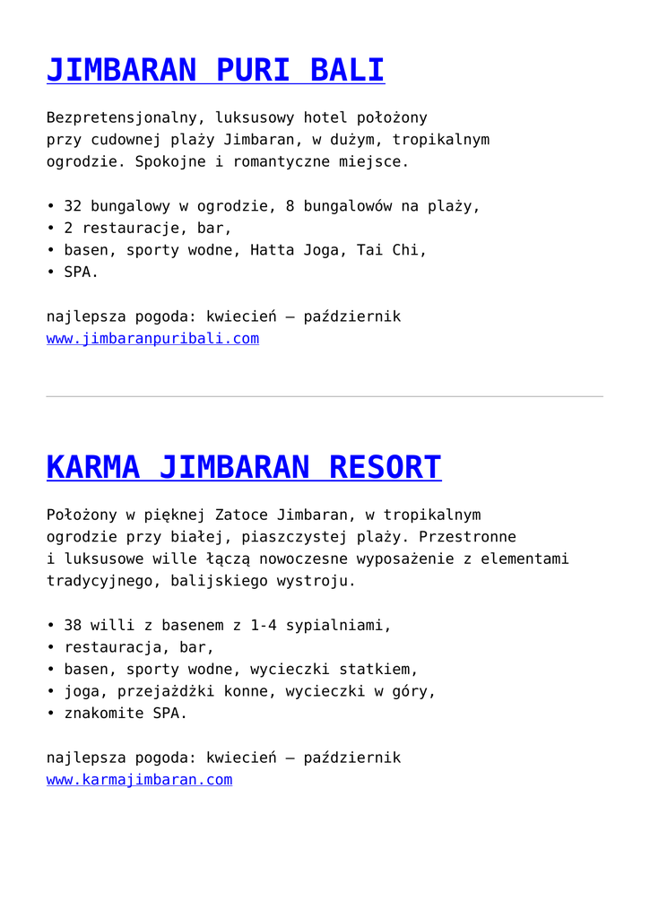 JIMBARAN PURI BALI Bezpretensjonalny, luksusowy hotel położony przy cudownej plaży Jimbaran, w dużym, tropikalnym ogrodzie. Spokojne i romantyczne miejsce. • 32 bungalowy w ogrodzie, 8 bungalowów na plaży, • 2 restauracje, bar, • basen, sporty wodne, Hatta Joga, Tai Chi, • SPA. najlepsza pogoda: kwiecień – październik www.jimbaranpuribali.com KARMA JIMBARAN RESORT Położony w pięknej Zatoce Jimbaran, w tropikalnym ogrodzie przy białej, piaszczystej plaży. Przestronne i luksusowe wille łączą nowoczesne wyposażenie z elementami tradycyjnego, balijskiego wystroju. • 38 willi z basenem z 1-4 sypialniami, • • • • restauracja, bar, basen, sporty wodne, wycieczki statkiem, joga, przejażdżki konne, wycieczki w góry, znakomite SPA. najlepsza pogoda: kwiecień – październik www.karmajimbaran.com TIKEHAU PEARL BEACH RESORT Uważany za jeden z najpiękniejszych atoli w Polinezji, w kształcie korony, atol Tikehau utworzony jest z wysepek, „zawieszonych” pomiędzy błękitem nieba i turkusem wody. Hotel znajduje się na wysepce Motu Tiano, wsród palm kokosowych i białych plaż. Szklana podłoga w bungalowach na wodzie umożliwia obserwację świata podwodnego. • • • • • • 13 bungalowów na plaży, 24 na wodzie, restauracja, bar, basen, nurkowanie, wycieczki łodzią, piknik na plaży, wycieczki rowerem do pobliskich wiosek, SPA. najlepsza pogoda: cały rok www.pearlresorts.com/tikehaupearlbeachresort/ MOTU TETA Wchodząca w skład atolu Rangiroa – największego w Arcipelagu Tuamotu, wysepka Motu Tetaraire jest wyjątkowym miejscem. Jedyny hałas, jaki można tu usłyszeć – to szum fal i szelest palm kokosowych. Jedyne decyzje, które należy podjąć – to czego się teraz napić i co zjeść. Gwarantowany całkowity relaks, spokój i odizolowanie od świata. • 1 willa w stylu polinezyjskim z 3 sypialniami, salonem, jadalnia i oddaloną kuchnią, w której znakomity kucharz przyrządza posiłki, • 1 bungalow z 2-sypialniami, • nurkowanie, windsurfing, przejażdżki łodzią na pobliskie wyspy, • łowienie ryb, zbieranie muszli. najlepsza pogoda: cały rok www.yourdreamisland.com BORA BORA PEARL BEACH RESOR T & SPA Położony na wysepce Motu Tevairoa, 10 minut statkiem od legendarnej wyspy Bora Bora. • 20 bungalowów w ogrodzie z prywatnym basenem, 10 bungalowów na plaży z jacuzzi, 50 bungalowów na wodzie z dużym tarasem, • 3 restauracje, 2 bary, • basen, sporty wodne, wycieczki katamaranem, korty tenisowe, • loty helikopterem, • karmienie rekinów i płaszczek. najlepsza pogoda: cały rok www.pearlresorts.com/bora LE TAHA’A ISLAND RESOR T & SPA Położony na prywatnej wysepce 5 minut drogi statkiem od wyspy Taha’a, leżącej w Archipelagu Wysp Towarzystwa, 230 km na zachód od Tahiti. Taha’a często zwana jest wyspą waniliową, ponieważ rocznie produkuje 25 ton tego cennego specjału. Taha’a to także wyspa, gdzie ludzie żyją w pełnej harmonii z niezwykle piękną, bogatą i dziewiczą przyrodą. • • • • • • • 48 przestronnych bungalowów na wodzie, 12 willi na plaży z prywatnym basenem i ogrodem, 3 restauracje, 2 bary, basen, sporty wodne, kort tenisowy, loty helikopterem na Bora Bora, wycieczki jeepem po wyspie, łowienie ryb, nurkowanie, wspaniałe SPA. najlepsza pogoda: cały rok www.letahaa.com PACIFIC RESORT RAROTONGA Położony na południowo-wschodnim wybrzeżu największej wyspy archipelagu – Rarotonga, przy krystalicznie czystej i bezpiecznej zatoce Muri. Spokojne, leniwe dni można spędzić wylegując się na białej plaży i kąpiąc w ciepłych wodach Pacyfiku, by nocami tańczyć i bawić się w okolicznych wioskach. • • • • 56 komfortowych bungalowów, 8 willi z 2-3 sypialniami, restauracja, bar, basen, masaże, nurkowanie, sporty wodne, wycieczki w interior wyspy. najlepsza pogoda: maj – październik www.pacificresort.com PACIFIC RESORT AITUTAKI W trakcie 40 minutowego lotu z Raratonga na Aitutaki można podziwiać niezwykle piękne laguny, których kolor przechodzi z jasnoturkusowego poprzez szmaragdowy do indygo. • • • • • 24 luksusowe bungalowy położone na plaży, 3 wille, restauracja, bar, basen, SPA, wycieczki na rowerach lub skuterach, nurkowanie, przejażdżki łodzią, łowienie ryb. najlepsza pogoda: cały rok www.aitutaki.pacificresort.com TURTLE ISLAND Bujna roślinność, białe plaże, niesamowicie błękitne wody oceanu zostały uwiecznione na filmie „Blue Lagoon”. Romantyczne pikniki na jednej z 14 dziewiczych plaż wyspy, egzotyczna przyroda, kąpiele w krystalicznie czystych lagunach, malownicze zachody słońca mogą być wspaniałą scenerią podróży poślubnych. • 14 willi 2-pokojowych, • śniadania podawane na tarasie willi, romantyczne zachodzie słońca, pikniki na plaży, wyrafinowane i urozmaicone duży wybór win, • nurkowanie z maską lub z butlami, łowienie ryb morzu, przejażdżki łodzià, piknik na plaży, wycieczki wspinaczka górska, masaże. kolacje o menu oraz na pełnym rowerem, najlepsza pogoda: kwiecień – wrzesień www.turtlefiji.com THE WAKAYA CLUB & SPA Położony na prywatnej wysepce Wakaya, otoczonej rafą koralową. Intymność, dziewicze plaże, spokoje laguny, majestatyczne klify – magią tego miejsca czuje się od momentu wylądowania na wyspie. • 10 ekskluzywnych bungalowów, 1 luksusowa willa z 3 sypialniami, • znakomita restauracja, bar, • basen, piknik na plaży, pole golfowe 9 dołków, korty tenisowe, SPA. najlepsza pogoda: kwiecień – wrzesień www.wakaya.com