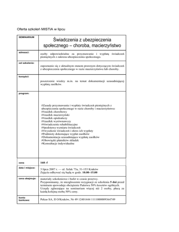 Oferta szkoleń MISTiA w lipcu SEMINARIUM adresaci: Świadczenia z ubezpieczenia społecznego – choroba, macierzyństwo osoby odpowiedzialne za przyznawanie i wypłatę świadczeń pieniężnych z zakresu ubezpieczenia społecznego. cel szkolenia: zapoznanie się z aktualnym stanem prawnym dotyczącym świadczeń z ubezpieczenia społecznego w razie macierzyństwa lub choroby. korzyści: poszerzenie wiedzy m.in. na temat dokumentacji uzasadniającej wypłatę zasiłków. program: #Zasady przyznawania i wypłaty świadczeń pieniężnych z ubezpieczenia społecznego w razie choroby i macierzyństwa: ##zasiłek chorobowy ##zasiłek macierzyński ##zasiłek opiekuńczy ##zasiłek wyrównawczy ##świadczenie rehabilitacyjne ##podstawa wymiaru świadczeń ##wysokość świadczeń i okres ich wypłaty #Podmioty dokonujące wypłat zasiłków #Dokumentacja uzasadniająca wypłatę zasiłków #Obowiązki płatników składek #Konsultacje indywidualne cena 160 zł data i miejsce: 3 lipca 2007 r. — ul. Szlak 73a, 31-153 Kraków Zajęcia odbywać się będą w godz. 10.00–15.00 cena obejmuje: materiały szkoleniowe i bufet w czasie przerwy. Przypominamy, że niezgłoszenie rezygnacji ze szkolenia 5 dni przed terminem spowoduje obciążenie Państwa 50% kosztów ogólnych. Urzędy zgłaszające na seminarium więcej niż 2 osoby, płacą za każdą kolejną osobę 50% ceny. konto bankowe: Pekao SA, II O/Kraków, Nr 49 12401444 1111000009364749 szkolenie zlecone: dla grupy liczącej nie więcej niż 20 osób, cena za grupę wynosi 2070 zł (nie obejmuje kosztu dojazdu wykładowcy). opiekun szkolenia: Agnieszka Majewska–Siwek e-mail: [email protected] SEMINARIUM adresaci: Stosunek pracy oraz inne formy zatrudniania pracodawcy, pracownicy działów kadrowych jst i jednostek podległych. cel szkolenia: zapoznanie uczestników z aktualnymi przepisami dotyczącymi stosunku pracy oraz innych form zatrudniania. korzyści: omówienie kazusów z zakresu zagadnień przedstawionych podczas szkolenia. program: #Nawiązywanie i rozwiązywanie stosunku pracy: rekrutacja; informacje, których można żądać od kandydata do pracy i pracownika; nawiązywanie stosunku pracy i rodzaje umów o pracę; kolejne umowy na czas określony; ważne klauzule umowne; zakres czynności pracownika; umowa zlecenie i o dzieło; dopuszczalność zawarcia umowy cywilnoprawnej, w tym z własnym pracownikiem #Elastyczne formy zatrudnienia: telepraca, praca nakładcza, „jobsharing” #Obowiązki pracodawców i pracowników: odpowiedzialność porządkowa i materialna pracowników, problem mobbingu i dyskryminacji; procedura antymobbingowa; prowadzenie ewidencji #Porozumienie zmieniające, wypowiedzenie zmieniające, powierzenie innych obowiązków niż wynikające z umowy o pracę, wejście z mocy prawa do umowy o pracę przepisów korzystniejszych w miejsce mniej korzystnych dla pracownika #Zakończenie stosunku pracy i obowiązki pracodawcy: zakończenie stosunku pracy, ochrona pracowników przed zwolnieniem uprawnienia pracownika związane z wypowiedzeniem; uprawnienia pracodawcy po wypowiedzeniu umowy pracownikowi cena 170 zł data i miejsce: 4 lipca 2007 r. — ul. Szlak 73a, 31-153 Kraków Zajęcia odbywać się będą w godz. 9.00–15.00 cena obejmuje: konto bankowe: materiały szkoleniowe i bufet w czasie przerwy. Przypominamy, że niezgłoszenie rezygnacji ze szkolenia 5 dni przed terminem spowoduje obciążenie Państwa 50% kosztów ogólnych. Urzędy zgłaszające na seminarium więcej niż 2 osoby, płacą za każdą kolejną osobę 50% ceny. Pekao SA, II O/Kraków, Nr 49 12401444 1111000009364749 szkolenie zlecone: dla grupy liczącej nie więcej niż 20 osób, cena za grupę wynosi 2260 zł (nie obejmuje kosztu dojazdu wykładowcy). opiekun szkolenia: Agnieszka Majewska–Siwek e-mail: [email protected] SEMINARIUM adresaci: Przyznawanie dodatków mieszkaniowych — aktualne problemy pracownicy referatów mieszkalnictwa oraz OPS odpowiedzialni za przyznawanie dodatków mieszkaniowych. cel szkolenia: omówienie zasad i trybu przyznawania dodatków mieszkaniowych. korzyści: zapoznanie się z najczęstszymi problemami związanymi z realizacją tego zadania. program: #Zasady i tryb przyznawania dodatków mieszkaniowych: tytuł prawny do lokalu; dochód - definicja, zasady ustalania i sposób dokumentowania dochodu; powierzchnia normatywna; pojęcie gospodarstwa domowego; wydatki stanowiące podstawę obliczenia dodatku mieszkaniowego #Przeprowadzanie wywiadów środowiskowych i podejmowanie decyzji w oparciu o dokonane ustalenia – „rażąca dysproporcja” w świetle orzecznictwa; #Wznowienie postępowania a zwrot nienależnie pobranego dodatku #Rodzaje decyzji i postanowień wydawanych w sprawach dodatków mieszkaniowych – wzory wraz z omówieniem ##decyzje przyznające dodatek mieszkaniowy zgodnie z wnioskiem strony i decyzje odmowne; prostowanie oczywistych omyłek, błędów pisarskich lub rachunkowych ##zawieszenie postępowania, wstrzymanie wykonania decyzji, wygaśnięcie decyzji ##podejmowanie decyzji w trybie autokontroli (art. 132 Kpa) ##uchylenie lub zmiana decyzji w trybie art. 154 i 155 Kpa ##uchylenie lub zmiana decyzji - wznowienie postępowania ##postępowanie w sprawie stwierdzenia nieważności decyzji cena 180 zł data i miejsce: 4 lipca 2007 r. — ul. Szlak 73a, 31-153 Kraków Zajęcia odbywać się będą w godz. 9.00–15.00 cena obejmuje: materiały szkoleniowe i bufet w czasie przerwy. Przypominamy, że niezgłoszenie rezygnacji ze szkolenia 5 dni przed terminem spowoduje obciążenie Państwa 50% kosztów ogólnych. Urzędy zgłaszające na seminarium więcej niż 2 osoby, płacą za każdą kolejną osobę 50% ceny. konto bankowe: Pekao SA, II O/Kraków, Nr 49 12401444 1111000009364749 szkolenie zlecone: dla grupy liczącej nie więcej niż 20 osób, cena za grupę wynosi 2350 zł (nie obejmuje kosztu dojazdu wykładowcy). opiekun szkolenia: Agnieszka Majewska–Siwek e-mail: [email 