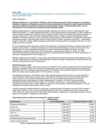 2015-12-08 STOWARZYSZENIE INWESTORÓW INDYWIDUALNYCH - OFERTA IPO MILESTONE MEDICAL S.A. – PIGUŁA INFORMACYJNA Adrian Mackiewicz Milestone Medical Inc. jest spółką z siedzibą w Stanach Zjednoczonych w Stanie Delaware, prowadzącą działalność zgodnie z tamtejszym prawem. Głównym przedmiotem działalności spółki będzie produkcja i sprzedaż urządzeń do podawania znieczulenia zewnątrzoponowego i iniekcji dostawowych wraz ze stosowanymi z nimi wymiennymi zestawami jednorazowego użytku. Spółka posiada licencję na wykorzystanie technologii i patentów pod nazwą CompuFlo, opracowanych przez Milestone Scientific Inc., spółki będącej założycielem, a także akcjonariuszem posiadającym 49,98% udziałów na dzień publikacji prospektu (4 grudnia 2015 roku). Spółka ta będzie również prowadzić dystrybucję produktów na zasadzie wyłączności w USA i Kanadzie. Milestone Medical jest na wstępnym etapie komercjalizacji swoich projektów. Pierwszym produktem, który wyszedł poza fazę prototypu, jest urządzenie do podawania znieczulenia zewnątrzoponowego. Obecnie projekt czeka na dopuszczenie do obrotu, wydawane przez FDA – Amerykański Urząd ds. Żywności i Leków. Spółka oczekuje, że pozwolenie zostanie wydane na początku 2016 roku, po czym spółka rozpocznie sprzedaż. W Unii Europejskiej spółka otrzymała certyfikat CE (niezbędny do rejestracji produktów na terenie krajów UE) na obydwa swoje produkty – systemu dozowania znieczulenia zewnątrzoponowego i systemu dozowania iniekcji dostawowych. W celu wprowadzenia produktów do obrotu konieczne jest zgłoszenie wyrobu do urzędu właściwego dla wyrobów medycznych lub powiadomienie o wprowadzeniu wyrobu do obrotu. Na dzień zatwierdzenia prospektu spółka podpisała już umowy z dystrybutorami we Włoszech i w Polsce, prowadzone są rozmowy z dystrybutorami w innych krajach UE. Milestone Medical celuje również w rynek chiński, gdzie dystrybutorem będzie powołana spółka Milestone China. Ponadto, spółka będzie się ubiegać o dofinansowanie w Polsce na rozwój nowej generacji urządzeń zarówno do iniekcji zewnątrzoponowych jak i dostawowych. Wyniki finansowe i rynek Spółka jest w fazie rozwoju, a pierwsze przychody w wysokości 40 tys. dolarów zostały odnotowane w pierwszych dziewięciu miesiącach 2015 roku. W ramach prywatnej oferty akcji w Polsce, przeprowadzonej w październiku i listopadzie 2013 roku, Milestone Medical pozyskał 2,3 mln dolarów netto na dalszy rozwój. Do dnia 30 września 2015 roku spółka łącznie wydała około 7,47 mln dolarów na rozwój. W prospekcie zaznaczono, że wielkość rynku iniekcji zewnątrzoponowych jest znaczna, a roczna sprzedaż w samych Stanach Zjednoczonych wynosi około 1 mld dolarów. Każdego roku około 2,5 mln kobiet rodzących dzieci korzysta ze znieczulenia zewnątrzoponowego, przy czym szacuje się, że około 8,9 mln iniekcji zewnątrzoponowych jest podawana w celach niezwiązanych z porodem. W Chinach liczba znieczuleń zewnątrzoponowych podczas porodów sięga 1,6 mln iniekcji. Z kolei około 1 mln przypadków znieczuleń odnotowuje się w Niemczech, Francji, Włoszech, Hiszpanii i Wielkiej Brytanii. Najmniej przypadków znieczuleń występuje w Kanadzie, średnio około 170 tys. rocznie. Analitycy Persistence Market Research prognozują, że globalny sektor zarządzania leczeniem bólu wzrośnie z około 36 mln dolarów w 2012 roku do około 49mld dolarów w 2019 roku (średnioroczna stopa wzrostu około 4,6%). Głównym rynkiem jest rynek amerykański, jednak analitycy prognozują, że najszybciej rosnącym rynkiem będzie rynek azjatycki w najbliższych pięciu latach. Akcjonariat przed i po ofercie, harmonogram i struktura oferty Przed emisją Akcjonariusz Liczba akcji/głosów Milestone Scientific Inc. Akcje/prawa głosu na WZ 10 995 000 49,98% Wang Tao 2 600 000 11,82% Zhang Lidong 2 000 000 9,09% Zhu Yun 1 600 000 7,27% Tom Cheng 1 325 000 6,02% Pozostali akcjonariusze założyciele 1 480 000 6,73% Akcje w wolnym obrocie 2 000 000 9,09% Źródło: prospekt emisyjny Milestone Medical Inc. Akcjonariat spółki na dzień publikacji prospektu emisyjnego Milestone Medical przedstawia tabela powyżej. W ramach oferty publicznej oferowanych jest do 3 200 000 akcji nowej emisji, przy czym do inwestorów indywidualnych ma trafić około 25% emisji (około 800 000 akcji). Zapisy można składać do 14 grudnia 2015 roku. Cena maksymalna, po której zapisy składają inwestorzy indywidualni, została ustalona na 5,90 zł. W prospekcie zaznaczono, że spółka chce pozyskać z rynku około 37 mln zł netto (około 10 mln dolarów przy średnim kursie za ostatnie trzy miesiące USD/PLN 3,70 zł). Środki pozyskane z emisji mają zostać przeznaczone na kontynuowanie komercjalizacji dwóch urządzeń medycznych, a także na promocję i marketing. Od 8 do 14 grudnia 2015 roku Przyjmowanie zapisów od inwestorów indywidualnych po cenie 5,90 zł Od 8 do 15 grudnia 2015 roku Proces budowy księgi popytu Do 16 grudnia 2015 roku Podanie ostatecznej liczby i ceny oferowanych akcji Od 16 do 17 grudnia 2015 roku Przyjmowanie zapisów od inwestorów instytucjonalnych Do 22 grudnia 2015 roku Planowany przydział akcji dla inwestorów indywidualnych za pośrednictwem GPW Przydział akcji dla inwestorów instytucjonalnych Źródło: prospekt emisyjny Milestone Medical Inc. Przejście na główny parkiet Aktualnie spółka jest notowana na rynku NewConnect, jednak ubiega się o przeniesienie na parkiet główny GPW. Przeniesienie ma nastąpić wraz z emisją akcji, a spółka oczekuje, że dojdzie do tego jeszcze w tym roku. Jak podano w prospekcie emisyjnym, spółka spełnia wszelkie kryteria ubiegania się o przeniesienie notowań na parkiet główny. Z pełną treścią prospektu emisyjnego można zapoznać się w tym miejscu. Źródło: Milestone Medical Inc.