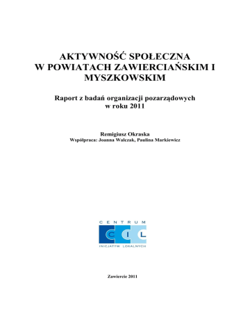 AKTYWNOŚĆ SPOŁECZNA W POWIATACH ZAWIERCIAŃSKIM I MYSZKOWSKIM Raport z badań organizacji pozarządowych w roku 2011 Remigiusz Okraska Współpraca: Joanna Walczak, Paulina Markiewicz Zawiercie 2011 Wydawca: Centrum Inicjatyw Lokalnych ul. Wierzbowa 16/18 42-400 Zawiercie Biuro: ul. Senatorska 14, Zawiercie tel. /032/ 67 02 014 [email protected] www.cil.org.pl Jesteśmy Organizacją Pożytku Publicznego Przekaż nam 1% podatku KRS 0000 215 720 Publikacja współfinansowana przez Unię Europejską w ramach Europejskiego Funduszu Społecznego 2 Spis treści: I. II. III. IV. V. VI. Wstęp................................................................................................4 Opis zakresu badań...........................................................................6 Badania ilościowe i ich analiza.........................................................7 Badania jakościowe.........................................................................22 Wnioski............................................................................................32 Wykaz organizacji............................................................................35 3 I. Wstęp Niniejszy raport prezentuje i omawia wyniki badań przeprowadzonych wśród organizacji pozarządowych (NGO) powiatów zawierciańskiego i myszkowskiego w I połowie roku 2011. Badania zostały zrealizowane przez zawierciańskie Centrum Inicjatyw Lokalnych (CIL) w ramach projektu „Zawierciański Inkubator Organizacji Pozarządowych”, współfinansowanego przez Unię Europejską ze środków Europejskiego Funduszu Społecznego. Zawierciański Inkubator działa od 1 stycznia 2011 r. Inicjatywa ta skierowana jest do NGO z terenu powiatów zawierciańskiego i myszkowskiego. Jej celem jest poprawa funkcjonowania i podniesienie potencjału organizacji działających na tym obszarze. Inkubator świadczy organizacjom pozarządowym bezpłatne doradztwo oraz usługi techniczne i księgowe, wspiera także osoby zainteresowane powołaniem nowych inicjatyw społecznych. Jednym z elementów działań Inkubatora jest analiza kondycji organizacji pozarządowych w obu powiatach. Aby wsparcie świadczone przez Inkubator było skuteczne, konieczne jest rozpoznanie rzeczywistych potrzeb sektora pozarządowego na tym obszarze. Dlatego też w ramach prowadzenia Inkubatora zaplanowano profesjonalne badania socjologiczne, mające pomóc lepiej poznać lokalny „trzeci sektor” – jego potencjał, kondycję i możliwości rozwoju. Przewidziano dwukrotne badania – wstępne (zrealizowano je w I kwartale 2011 r.) oraz końcowe (zostaną one przeprowadzone w II półroczu 2012 r.). Każdemu z nich towarzyszyć ma stosowny raport, przedstawiający i analizujący zgromadzoną wiedzę. Niniejszy raport stanowi omówienie badań wstępnych, natomiast podsumowaniem badań końcowych i zarazem całego projektu będzie publikacja, która powstanie jesienią roku 2012. Prowadzone badania mają w dużej mierze charakter prekursorski. W powiatach zawierciańskim i myszkowskim nie prowadzono dotychczas profesjonalnych analiz sektora NGO. Jedyną tego rodzaju inicjatywą były do tej pory badania przeprowadzone również przez Centrum Inicjatyw Lokalnych w roku 2008. Ich wyniki omówiono w publikacji „Informator – organizacje pozarządowe w powiecie zawierciańskim 2008” (CIL, Zawiercie 2008). Po pierwsze jednak, ówczesne badania odnosiły się jedynie do terenu powiatu zawierciańskiego (nie obejmowały pow. myszkowskiego). Po drugie – na rozesłaną wtedy, stosunkowo krótką ankietę odpowiedziało zaledwie 19 organizacji. Po trzecie wreszcie, od tamtej pory minęły 3 lata, co stanowi okres dość długi w kontekście dynamicznie zachodzących przeobrażeń. Mamy tu na myśli m.in. znaczny wzrost funduszy przeznaczanych dla sektora pozarządowego ze środków krajowych i zagranicznych (w tym głównie z Unii Europejskiej); scedowanie na organizacje pozarządowe szeregu zadań dotychczas zarezerwowanych dla sektora publicznego; spopularyzowanie „trzeciego sektora” poprzez kampanie promocyjne przekazywania 1% podatku dla organizacji pożytku publicznego. 4 Takie procesy i zjawiska wpływają nie tylko na dynamikę powstawania i działań organizacji pozarządowych, lecz także na ich znaczenie społeczne. Inicjatywy obywatelskie stają się coraz bardziej istotnym aktorem życia publicznego, którego rola i przedsięwzięcia muszą być uwzględniane przez inne podmioty. Wiedza o organizacjach pozarządowych jest zatem ważna nie tylko dla nich samych, lecz również dla ogółu społeczeństwa i jego przedstawicieli. Nic dziwnego zatem, że projekt „Zawierciański Inkubator Organizacji Pozarządowych” zyskał partnera w postaci Starostwa Powiatowego w Zawierciu. Analiza lokalnego sektora NGO jest ważna również z powodu obserwowanych niezbyt korzystnych tendencji. Powiat zawierciański zamieszkują 123 tys. osób. Zgodnie z danymi Starostwa Powiatowego, siedzibę na tym terenie mają 234 stowarzyszenia i fundacje. Wedle statystyk ogólnopolskich, które nie uwzględniają niektórych form stowarzyszania się, np. Ochotniczych Straży Pożarnych, w powiecie zawierciańskim na 10 tys. osób przypada jedynie 10 organizacji, natomiast w woj. śląskim wskaźnik ten wynosi 12,6 organizacji, zaś średnia dla Polski to aż 16 organizacji. Z kolei zgodnie z bazą organizacji pożytku publicznego (OPP), prowadzoną przez Ministerstwo Pracy i Polityki Społecznej, spośród 7357 OPP zaledwie 11 ma siedzibę w powiecie zawierciańskim. Wskaźnik liczby tych organizacji na 10 tys. mieszkańców w powiecie zawierciańskim wynosi 0,91 i jest ponad dwa razy niższy niż średnia ogólnopolska (1,93). Nieco lepiej wygląda sytuacja w powiecie myszkowskim. Na terenie tego powiatu, zamieszkanego przez ok. 72 tys. osób, zgodnie z ewidencją portalu ngo.pl siedzibę posiada 167 stowarzyszeń oraz 4 fundacje. Tutaj wskaźnik liczby organizacji na 10 tys.