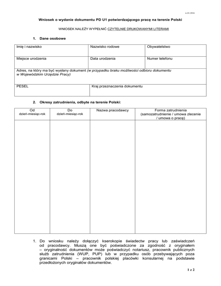 w.01.2016 Wniosek o wydanie dokumentu PD U1 potwierdzającego pracę na terenie Polski WNIOSEK NALEŻY WYPEŁNIĆ CZYTELNIE DRUKOWANYMI LITERAMI 1. Dane osobowe Imię i nazwisko Nazwisko rodowe Obywatelstwo Miejsce urodzenia Data urodzenia Numer telefonu Adres, na który ma być wysłany dokument (w przypadku braku możliwości odbioru dokumentu w Wojewódzkim Urzędzie Pracy) PESEL Kraj przeznaczenia dokumentu 2. Okresy zatrudnienia, odbyte na terenie Polski: Od Do dzień-miesiąc-rok dzień-miesiąc-rok Nazwa pracodawcy Forma zatrudnienia (samozatrudnienie / umowa zlecenie / umowa o pracę) 1. Do wniosku należy dołączyć kserokopie świadectw pracy lub zaświadczeń od pracodawcy. Muszą one być poświadczone za zgodność z oryginałem – oryginalność dokumentów może poświadczyć notariusz, pracownik publicznych służb zatrudnienia (WUP, PUP) lub w przypadku osób przebywających poza granicami Polski – pracownik polskiej placówki konsularnej na podstawie przedłożonych oryginałów dokumentów. 1z2 w.01.2016 2. W przypadku pracy na mniej niż pełen etat należy dołączyć zaświadczenie o wysokości dochodów. 3. W przypadku niektórych państw wysokość zasiłku uzależniona jest od wysokości zarobków, w związku z czym wskazane jest załączenie dokumentów poświadczających ww. zarobki. 4. Zgodnie z art. 40 Kodeksu postępowania administracyjnego (tekst jednolity Dz. U. z 2016 r., poz. 23 z późn. zm.) § 1 Pisma doręcza się stronie, a gdy strona działa przez przedstawiciela - temu przedstawicielowi. § 2 Jeżeli strona ustanowiła pełnomocnika, pisma doręcza się pełnomocnikowi. Jeżeli ustanowiono kilku pełnomocników, doręcza się pisma tylko jednemu pełnomocnikowi. Strona może wskazać takiego pełnomocnika. § 3 W sprawie wszczętej na skutek podania złożonego przez dwie lub więcej stron pisma doręcza się wszystkim stronom, chyba że w podaniu wskazały jedną jako upoważnioną do odbioru pism. § 4 Strona, która nie ma miejsca zamieszkania lub zwykłego pobytu albo siedziby w Rzeczypospolitej Polskiej lub innym państwie członkowskim Unii Europejskiej, jeżeli nie ustanowiła pełnomocnika do prowadzenia sprawy zamieszkałego w Rzeczypospolitej Polskiej i nie działa za pośrednictwem konsula Rzeczypospolitej Polskiej, jest obowiązana wskazać w Rzeczypospolitej Polskiej pełnomocnika do doręczeń, chyba że doręczenie następuje za pomocą środków komunikacji elektronicznej. § 5 W razie niewskazania pełnomocnika do doręczeń przeznaczone dla tej strony pisma pozostawia się w aktach sprawy ze skutkiem doręczenia. Stronę należy o tym pouczyć przy pierwszym doręczeniu. Strona powinna być również pouczona o możliwości złożenia odpowiedzi na pismo wszczynające postępowanie i wyjaśnień na piśmie oraz o tym, kto może być ustanowiony pełnomocnikiem. 5. Zgodnie z art. 41 § 1 i 2 Kodeksu postępowania administracyjnego (tekst jednolity Dz. U. z 2016 r., poz. 23 z późn. zm.) § 1 W toku postępowania strony oraz ich przedstawiciele i pełnomocnicy mają obowiązek zawiadomić organ administracji publicznej o każdej zmianie swojego adresu, w tym adresu elektronicznego. § 2 W razie zaniedbania obowiązku określonego w § 1 doręczenie pisma pod dotychczasowym adresem ma skutek prawny. 6. Administratorem danych osobowych zebranych podczas realizacji zadań związanych z koordynacją systemów zabezpieczenia społecznego w państwach UE / EOG / Szwajcarii, w zakresie świadczeń z tytułu bezrobocia jest Wojewódzki Urząd Pracy w Poznaniu, ul. Kościelna 37, 60-537 Poznań. Dane osobowe przetwarzane są wyłącznie w celu i przez okres konieczny do realizacji zadań z zakresu koordynacji systemów zabezpieczenia społecznego określonych w Ustawie z dnia 20 kwietnia 2004 r. o promocji zatrudnienia i instytucjach rynku pracy (tekst jednolity Dz. U. z 2015 r., poz. 149 z późn. zm.). Dane wskazane dobrowolnie będą przetwarzane i udostępniane publicznym służbom zatrudnienia lub instytucjom właściwym w państwach UE / EOG / Szwajcarii ds. koordynacji systemów zabezpieczenia społecznego. Osobie, której dane dotyczą, przysługuje prawo dostępu do treści jej danych oraz możliwość ich poprawiania. Oświadczam, że zapoznałem(łam) się z treścią zamieszczonego pouczenia Data i czytelny podpis wnioskodawcy…………………………………………………………………………………….. 3. Adnotacje wojewódzkiego urzędu pracy: Data i podpis pracownika Urzędu przyjmującego wniosek………………………………………………………….. (uzupełniane tylko w przypadku złożenia wniosku osobiście w siedzibie Urzędu) 2z2
