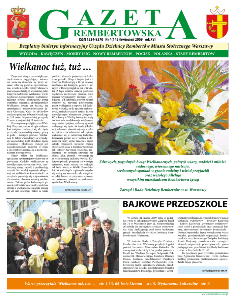 ISSN 1234-8570 Nr 4(145) kwiecień 2009 rok XVI Zmęczeni zimą, z coraz większym utęsknieniem wyglądający wiosny, nie możemy doczekać się kiedy zacznie robić się pięknie, optymistycznie, wesoło i ciepło. Wtedy właśnie w pierwszą niedzielę po wiosennej pełni księżyca nadchodzi Wielkanoc. Jest to najstarsze, najważniejsze i najbardziej radosne święto, obchodzone przez wszystkie wyznania chrześcijańskie. Wielkanoc, zwana też Paschą, ma upamiętniać zmartwychwstanie Jezusa Chrystusa. Czas jej obchodów ustalono podczas Soboru Nicejskiego w 325 roku. Najwcześniej przypada 22 marca, najpóźniej 25 kwietnia. Poza wymową religijną czas Wielkiej Nocy ma jeszcze drugie zadanie. Jest świętem budzącej się do życia przyrody, zapowiedzią wiosny, pracy w polu i dobrych plonów. Wielkanoc to także wywodzący się z tradycji słowiańskiej hołd składany życiu, witalności i płodności. Dlatego jest najradośniejszym świętem w roku, a jej symbole kojarzą się z rozpoczynaniem nowego życia. Kiedy zbliża się Wielkanoc, sprzątamy i przystrajamy domy na jej powitanie. Ozdoby wielkanocne są nieodłącznym atrybutem świąt, symbolizują naszą radość i podkreślają nastrój. Na każdej wystawie sklepowej, na stolikach w kawiarniach i w urzędach pojawiają się w tym okresie różnorodne i barwne ozdoby wielkanocne. Talerze pełne kolorowych pisanek, żółciutkie kurczaczki, urokliwe stroiki i wielkanocne zajączki śmieją się do nas zewsząd. Także w wielu polskich domach pojawiają się kolorowe pisanki. Długa i bogata jest ich tradycja. Pochodzący z Persji zwyczaj zdobienia jaj kurzych, gęsich i kaczych w Polsce przyjął się już w X wieku. Z tego właśnie okresu pochodzi najstarsza zachowana pisanka. Dziś pisanki wykonujemy różnymi technikami - od skrobania ostrym nożem wzorów na barwnej powierzchni, przez wyklejanki z papieru lub kolorowej włóczki, aż do ręcznie malowanych, małych arcydzieł sztuki. Są one nieodłącznym elementem „święconki”, z którą w Wielką Sobotę idzie się do kościoła, to dekoracja wielkanocnego stołu i piękny, radosny symbol rodzącego się życia. W tradycji ludowej kolorowe pisanki zajmują czołowe miejsce i w zależności od regionu wykonuje się je odmienną techniką. Kraszanki gotuje się w wodzie z dodatkiem kory dębu (czarne), łupin cebuli (brązowe), kwiatów malwy (fioletowe), soku z buraków (różowe) lub listków barwinka (zielone). Nalepianki - to owinięte sitowiem lub słomą jajka, pisanki - wykonuje się je wspomnianą techniką wosku. Kolorowe pisanki przynosi się w święta sąsiadom, nimi można się wykupić od lania wodą w Wielki Poniedziałek. W niektórych regionach urządza się wojny na kraszanki, ale wszędzie, w całej Polsce, artystycznie wykonane, kolorowe pisanki są radosnym symbolem Wielkanocy. (dokończenie na str. 3) BAJKOWE PRZEDSZKOLE W sobotę 21 marca 2009 roku o godzinie 10.00 w sali gimnastycznej Zespołu Szkół Nr 74 w Warszawie przy ul. Niepołomickiej 26 odbyła się uroczystość z okazji wmurowania Aktu Erekcyjnego pod nowo budowany gmach Przedszkola Nr 160 w Dzielnicy Rembertów m.st. Warszawy. W imieniu Rady i Zarządu Dzielnicy Rembertów m.st. Warszawy przybyłych gości powitał burmistrz Mieczysław Golónka. Na uroczystości obecni byli: ks. prałat proboszcz Parafii św. Wacława Szczepan Stalpiński, Pełnomocnik Mazowieckiego Kuratora Oświaty Renata Bontron, przedstawiciel Dyrektora Biura Edukacji Czesław Piechociński, rembertowscy radni i członkowie Zarządu, przedstawiciele rad osiedli, przedstawiciel Związku Nauczycielstwa Polskiego, projektant i archi- tekt Krzysztof Janus, kierownik budowy Janusz Jabłoński, wykonawcy - Bolesław Kosowski i Robert Kosowski, dyrektorzy rembertowskich szkół i przedszkoli oraz instytucji kultury, emerytowani dyrektorzy Przedszkola Danuta Ptaszyńska, Irena Korecka oraz Maria Kucaba, przedstawiciele organizacji kombatanckich oraz Światowego Związku Żołnierzy Armii Krajowej, przedstawiciele zaprzyjaźnionych organizacji pozarządowych, grono pedagogiczne, przedstawiciele Rady Rodziców i dzieci z Przedszkola Nr 160. Po powitaniu gości Dyrektor przedszkola pani Agnieszka Karczewska - Gzik, podczas krótkiej prezentacji multimedialnej, opowiedziała dzieje placówki. (dokończenie na str.3) Warto przeczytać: Wielkanoc tuż, tuż ... - str. 1 i 3, 65-lecie Liceum - str. 5, Wydarzenia kulturalne - str. 6 www.rembertow.waw.pl WIEŚCI Z RATUSZA Z prac Zarządu Dzielnicy Działalność uchwałodawcza: W okresie od 04 marca 2008 roku do 7 kwietnia 2009 roku odbyły się 4 posiedzenia Zarządu Dzielnicy Rembertów m.st. Warszawy, na których podjęto 15 uchwał i zajęto 6 stanowisk. Uchwały dotyczyły spraw: infrastruktury (6), budżetowych (2), mieszkaniowych (4), organizacyjnych (1), kultury (1), społecznych (1). Zarząd Dzielnicy Rembertów zajął pozytywne stanowiska w sprawie: - w sprawie wyboru części wykonawców programu artystycznego z okazji Święta Rembertowa w dniu 24 maja 2009 r., - w sprawie ustalenia ksiąg rachunkowych, które prowadzi się przy użyciu komputera w Dzielnicy Rembertów m. st. Warszawy, - w sprawie wyboru koncepcji budynku komunalnego w rejonie ulic Bellony i Kacpury, - w sprawie sprawozdania z działalności Ośrodka Pomocy Społecznej w Dzielnicy Rembertów m. st. Warszawy, - w sprawie rozszerzenia porządku obrad XXXVII sesji Rady Dzielnicy Rembertów m. st. Warszawy, - w sprawie zajęcia stanowiska w kwestii wskazania nowej lokalizacji dla dotychczasowych dzierżawców nieruchomości położonej przy al. gen. Chruściela. Infrastruktura: Uchwały Zarządu Dzielnicy Rembertów m. st. Warszawy zostały podjęte: - w sprawie zlecenia wykonania dokumentacji projektowej na przebudowę linii napowietrznej nn. oraz linii kablowej nn. oświetlenia ulicznego przy ul. Paderewskiego w Warszawie, - w sprawie zlecenia wykonania i montażu elementów oznakowania przej