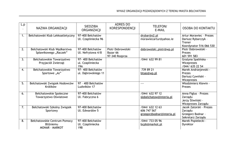 L.p . NAZWA ORGANIZACJI SIEDZIBA ORGANIZACJI ADRES DO