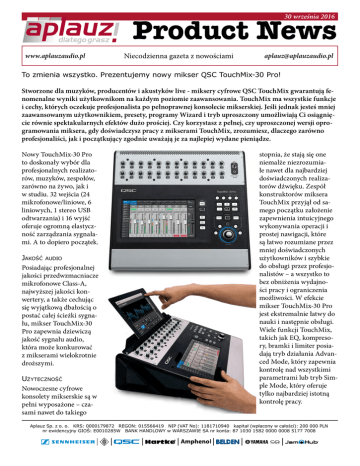 Product News 30 września 2016 www.aplauzaudio.pl Niecodzienna gazeta z nowościami [email protected] To zmienia wszystko. Prezentujemy nowy mikser QSC TouchMix-30 Pro! Stworzone dla muzyków, producentów i akustyków live - miksery cyfrowe QSC TouchMix gwarantują fenomenalne wyniki użytkownikom na każdym poziomie zaawansowania. TouchMix ma wszystkie funkcje i cechy, których oczekuje profesjonalista po pełnoprawnej konsolecie mikserskiej. Jeśli jednak jesteś mniej zaawansowanym użytkownikiem, presety, programy Wizard i tryb uproszczony umożliwiają Ci osiągnięcie równie spektakularnych efektów dużo prościej. Czy korzystasz z pełnej, czy uproszczonej wersji oprogramowania miksera, gdy doświadczysz pracy z mikserami TouchMix, zrozumiesz, dlaczego zarówno profesjonaliści, jak i początkujący zgodnie uważają je za najlepiej wydane pieniądze. Nowy TouchMix-30 Pro to doskonały wybór dla profesjonalnych realizatorów, muzyków, zespołów, zarówno na żywo, jak i w studiu. 32 wejścia (24 mikrofonowe/liniowe, 6 liniowych, 1 stereo USB odtwarzania) i 16 wyjść oferuje ogromną elastyczność zarządzania sygnałami. A to dopiero początek. Jakość audio Posiadając profesjonalnej jakości przedwzmacniacze mikrofonowe Class-A, najwyższej jakości konwertery, a także cechując się wyjątkową dbałością o postać całej ścieżki sygnału, mikser TouchMix-30 Pro zapewnia dziewiczą jakość sygnału audio, która może konkurować z mikserami wielokrotnie droższymi. Użyteczność Nowoczesne cyfrowe konsolety mikserskie są w pełni wyposażone – czasami nawet do takiego stopnia, że stają się one niemalże niezrozumiałe nawet dla najbardziej doświadczonych realizatorów dźwięku. Zespół konstruktorów miksera TouchMix przyjął od samego początku założenie zapewnienia intuicyjnego wykonywania operacji i prostej nawigacji, które są łatwo rozumiane przez mniej doświadczonych użytkowników i szybkie do obsługi przez profesjonalistów – a wszystko to bez obniżenia wydajności pracy i ograniczenia możliwości. W efekcie mikser TouchMix-30 Pro jest ekstremalnie łatwy do nauki i następnie obsługi. Wiele funkcji TouchMix, takich jak EQ, kompresory, bramki i limiter posiadają tryb działania Advanced Mode, który zapewnia kontrolę nad wszystkimi parametrami lub tryb Simple Mode, który oferuje tylko najbardziej istotną kontrolę pracy. Aplauz Sp. z o. o. KRS: 0000179872 REGON: 015566419 NIP (VAT No): 1181710940 kapitał (wpłacony w całości): 200 000 PLN nr ewidencyjny GIOŚ: E0010285W BANK HANDLOWY w WARSZAWIE SA nr konta: 87 1030 1582 0000 0008 5177 7008 ® Ostatecznie, Gain Wizard stale monitoruje i wskazuje przeciążenie wejść, zapewniając jednocześnie sposoby właściwego ustawienia trymerów wzmocnienia sygnałów. Nagrywanie wielościeżkowe TouchMix-30 Pro pozwala na rejestrowanie 32 ścieżek audio bezpośrednio na zewnętrznym twardym dysku USB – bez konieczności używania komputera. Wszystkie wejścia oraz miks stereo są zapisywane w 32-bitowym formacie Broadcast Wave. Zapisane ścieżki mogą być następnie odtwarzane i zgrywane na mikserze lub też zaimportowane do większości programów DAW w celu dokonania dograń oraz post-produkcji. Presety TouchMix-30 Pro posiada obszerną bibliotekę presetów kanałów. Nie są to typowe, ogólne, czy pasujące do wszystkiego ustawienia opracowane w studiu nagraniowym. Inżynierowie dźwięku live o bogatym dorobku i doświadczeniu spędzili miesiące w warunkach koncertowych i współpracując z muzykami, korzystając ze wszelkiego typu instrumentów, popularnych mikrofonów i przetworników, a także różnego rodzaju systemów głośnikowych, aby przygotować kompleksową bibliotekę ustawień, które są w szczególny sposób dedykowane do użycia w przypadku systemów nagłośnieniowych live w zakresie zarówno muzyki, jak również współpracy z głosem. Nawet najbardziej doświadczeni operatorzy przekonają się, że te presety pozwolą im uzyskać świetne brzmienie miksów w rekordowym czasie. Kompaktowy i kompletny Obecność interfejsu użytkownika w postaci unikalnego i funkcjonalnego ekranu dotykowego sprawia, że TouchMix-30 jest kompletną i w pełni wyposażoną cyfrową konsoletą mikserską, a do tego tak małą, że możemy przenosić ją w bagażu podręcznym lub też można ją zamontować w racku (z użyciem opcjonalnego zestawu akcesoriów). Kolorowy, graficzny ekran wielodotykowy przedstawia i zapewnia dostęp do parametrów miksu. Parametry miksera mogą być regulowane na ekranie lub też za pośrednictwem fizycznych enkoderów obrotowych. Dostęp i kontrola często używanych funkcji są możliwe za pośrednictwem przycisków sprzętowych. Więcej informacji: aplauzaudio.pl/touchmix-30-pro Kreatory Anti-Feedback Wizard pozwala operatorowi „przedzwonić” system przy użyciu 12 regulowanych filtrów notch, które są dostępne na wszystkich 16 wyjściach. Room Tuning Wizard zapewnia wsparcie operatorowi podczas dokonywania ustawień korekcji oraz ostatecznego dostrojenia systemu głośnikowego do danych warunków akustycznych. Effect Wizard prowadzi użytkownika przez procedurę wyboru i przypisania odpowiednich efektów, które są dostępne w sześciu wbudowanych procesorach efektów – każdy starannie opracowany i dostrojony do zapewnienia charakteru oraz jakości dźwięku live, na którym to zależy inżynierom dźwięku. Aplauz Sp. z o. o. KRS: 0000179872 REGON: 015566419 NIP (VAT No): 1181710940 kapitał (wpłacony w całości): 200 000 PLN nr ewidencyjny GIOŚ: E0010285W BANK HANDLOWY w WARSZAWIE SA nr konta: 87 1030 1582 0000 0008 5177 7008 ® TouchMix-30 Pro Trymery wzmocnienia: 24 przedwzmacniacze mikrofonowe Class-A 10-calowy ekran wielodotykowy o wysokiej jednego przycisku Enkoder Touch-and-turn TouchMix-30 Pro mikrofonowe/liniowe dysku twardego nagrywania, routera Wi-Fi, DAW, MP3 przewodowych monitorów dousznych (IEM) monitorowania
