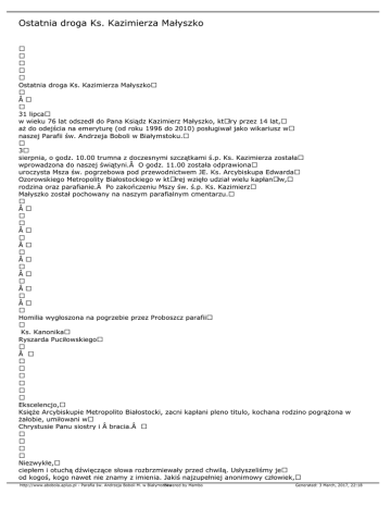 Ostatnia droga Ks. Kazimierza Małyszko Ostatnia droga Ks. Kazimierza Małyszko  31 lipca w wieku 76 lat odszedł do Pana Ksiądz Kazimierz Małyszko, ktÃłry przez 14 lat, aż do odejścia na emeryturę (od roku 1996 do 2010) posługiwał jako wikariusz w naszej Parafii św. Andrzeja Boboli w Białymstoku. 3 sierpnia, o godz. 10.00 trumna z doczesnymi szczątkami ś.p. Ks. Kazimierza została wprowadzona do naszej świątyni. O godz. 11.00 została odprawiona uroczysta Msza św. pogrzebowa pod przewodnictwem JE. Ks. Arcybiskupa Edwarda Ozorowskiego Metropolity Białostockiego w ktÃłrej wzięło udział wielu kapłanÃłw, rodzina oraz parafianie. Po zakończeniu Mszy św. ś.p. Ks. Kazimierz Małyszko został pochowany na naszym parafialnym cmentarzu.        Homilia wygłoszona na pogrzebie przez Proboszcz parafii Ks. Kanonika Ryszarda Puciłowskiego  Ekscelencjo, Księże Arcybiskupie Metropolito Białostocki, zacni kapłani pleno titulo, kochana rodzino pogrążona w żałobie, umiłowani w Chrystusie Panu siostry i  bracia. Niezwykłe, ciepłem i otuchą dźwięczące słowa rozbrzmiewały przed chwilą. Usłyszeliśmy je od kogoś, kogo nawet nie znamy z imienia. Jakiś najzupełniej anonimowy człowiek, http://www.abobola.aplus.pl - Parafia św. Andrzeja Boboli M. w Białymstoku Powered by Mambo Generated: 3 March, 2017, 22:18 ktÃłry przed wiekami napisał starotestamentalną Księgę Mądrości, mÃłwił dziś do nas. Posłuchajmy go jeszcze raz; „Dusze sprawiedliwych są w ręku Boga i nie dosięgnie ich męka. Zdało się oczom głupich, że pomarli, zejście ich poczytano za nieszczęście i odejście od nas za unicestwienie, A ONI TRWAJĄ W POKOJU―. Słowa te padły przed tysiącami lat, a zdaje się, jakby ich autor stał tu, wśrÃłd nas widząc nasz bÃłl, łzy w oczach, nieutulony żal w sercach, jakby pochylał się nad nami i szeptał do ucha „czy ty jesteś przygotowany―. Tyle w jego słowach wspÃłłczucia dla ludzkich żali i smutkÃłw, nieodłącznie związanych z dzisiejszym pogrzebem ś.p. Ks. Kazimierza. Popatrz – zdaje się mÃłwić starożytny mędrzec – Ten, ktÃłry zwyciężył śmierć swą krzyżowa ofiarą nad ofiarami, prosił Boga, swojego Ojca: „Chcę, aby także ci, ktÃłrych mi dałeś, byli ze mną tam, gdzie ja jestem, aby widzieli chwałę moją, ktÃłrą mi dałeśâ€• (J. 17,240). Chrystus chce, by ludzie, za ktÃłrych umarł i dla ktÃłrych zwyciężył śmierć byli z Nim w niebie. On sam tego chce. Trzeba tylko by ci, ktÃłrzy mu zaufali, zrozumieli prawdę – tę najważniejszą i jedyną prawdę, ktÃłra ma zasadnicze znaczenie dla ludzkiego bytowania. Prawdę o Zmartwychwstaniu. SpÃłjrz – szepcze dalej – stoisz koło trumny z ciałem Ks. Kazimierza, ktÃłry był ci tak bliski. Stoisz i pojąć nie możesz, że oto świat będzie się od tej pory odbywał bez niego. Trudno ci zrozumieć i to także, że skończyło się właśnie życie, w ktÃłrym miałeś swÃłj istotny udział i skoro tu jesteś to ś.p. Ks. Kazimierz musiał być dla ciebie ważny, może nawet bardzo ważny. Śmierć przyszła nagle i niespodziewanie, zastała go w Ciechocinku. Musiał zgodzić się z wolą Bożą i stanąć na tym ostatecznym rozrachunku przed Bogiem. Sam Pan BÃłg zasadził go przed laty, zasadził na polskiej ziemi, by przeżył to życie jak najpiękniej, najmądrzej i najszlachetniej. Było to 15 sierpnia w PopiołÃłwce, kiedy to rodzice Feliks i Waleria z d. Sokołowska cieszyli się owocem swojej miłości. Jeszcze bardziej się cieszyli, kiedy to z rąk Ks. Biskupa Władysława Suszyńskiego dnia 17 czerwca 1962 roku otrzymał święcenia kapłańskie. I od tego momentu rozpoczęła się prawdziwa przygoda z Jezusem Chrystusem, ktÃłry powiedział do niego: „PÃłjdź za mnąâ€•. http://www.abobola.aplus.pl - Parafia św. Andrzeja Boboli M. w Białymstoku Powered by Mambo Generated: 3 March, 2017, 22:18 Został skierowany do pracy duszpasterskiej w Starosielcach. Przez dwa lata siał słowo Boże z wielką gorliwością i poświęceniem, bo pierwsza parafia to pierwsza miłość. Ziarna Słowa Bożego, na nieraz nieurodzajną glebę, siła w rÃłżnych parafiach: w JasionÃłwce, ChodorÃłwce, Goniądzu, Trzciannem. Władze kościelne widząc dobrą pracę i wielkie zdolności Ks. Kazimierza, skierowały go na studia na Katolicki Uniwersytet Lubelski (lata 1971-1975). Po skończonych studiach uwieńczonych pracą magisterską wraca ponownie do pracy duszpasterskiej, początkowo w Farze Białostockiej. Tutaj też pracuje jako Obrońca Węzła Małżeńskiego w Sądzie Arcybiskupim. Otrzymywał rÃłwnież propozycję zostania proboszczem, ale nigdy nie zdecydował się, aby piastować ten urząd. Kolejne parafie, w ktÃłrych pracował to: parafia św. Rodziny, Miłosierdzia Bożego, Chrystusa KrÃłla. W roku 1996 Ks. Kazimierz ponownie wraca do parafii św. Andrzeja Boboli w Białymstoku, aby zebrać tym razem obfite plony swojej dotychczasowej pracy. Zbieranie owocÃłw swojej pierwszej pracy trwało przez 14 lat do 2010 roku, kiedy to odszedł na zasłużoną emeryturę. 49 lat służby dla Jezusa Chrystusa i Kościoła to szmat czasu. Kim był Ks. Kazimierz, to większość nas tu obecnych może powiedzieć, bo go znała. Był niesamowicie zdolnym człowiekiem, może nie do końca wykorzystywał swoje talenty otrzymane od Pana Boga. Był człowiekiem skromnym, nie zabiegał o zaszczyty, honory, pochwały, był duszą towarzystwa, humor dopisywał mu na każdym kroku. Nigdy nie narzekał na swoje choroby i cierpienia, umiał godzić się z wolą Bożą. Bardzo lubił samotność, był wrażliwy i czuły na punkcie sprawiedliwości. Był wielkim patriotą – mÃłwił bardzo odważne kazania w czasach komunistycznych i obecnie. Nie wszystkim taki styl mÃłwienia podobał się. SB wiele razy go upominała i rozmawiała, ale nigdy nie uległ pokusie. Ks. Kazimierz