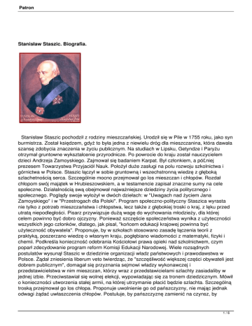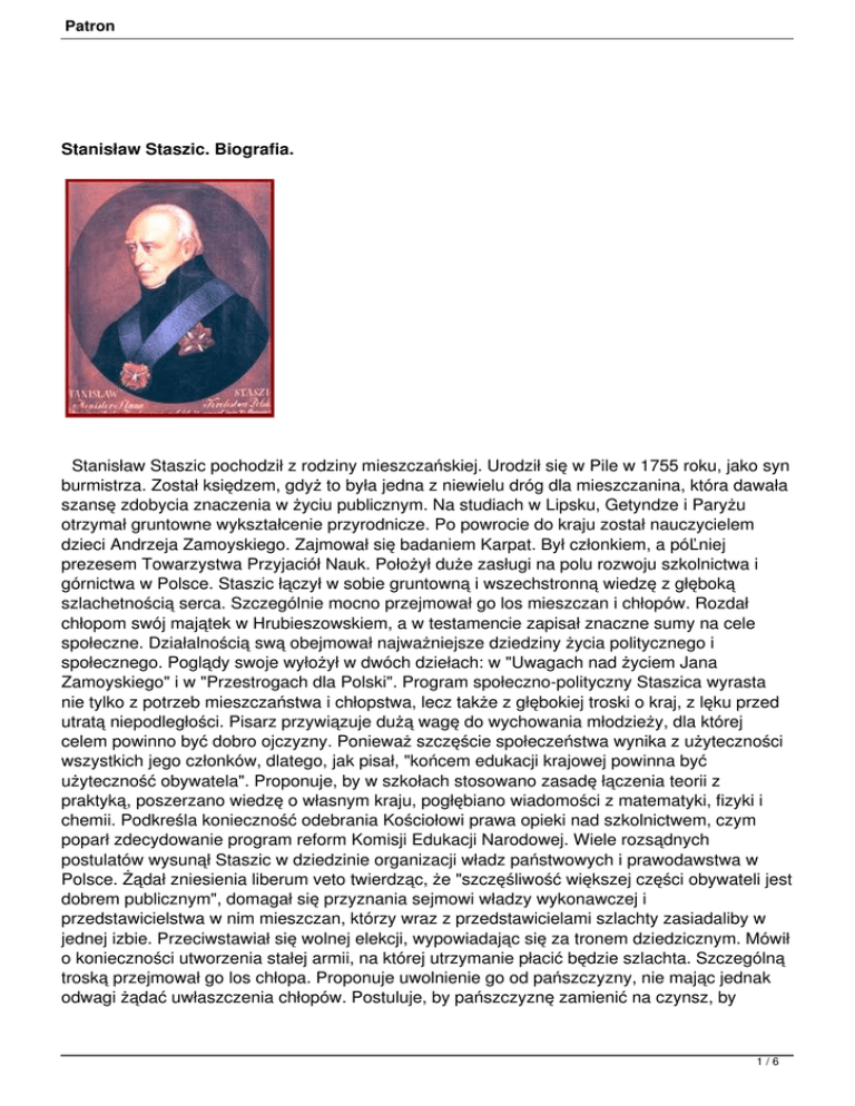 Patron Stanisław Staszic. Biografia. Stanisław Staszic pochodził z rodziny mieszczańskiej. Urodził się w Pile w 1755 roku, jako syn burmistrza. Został księdzem, gdyż to była jedna z niewielu dróg dla mieszczanina, która dawała szansę zdobycia znaczenia w życiu publicznym. Na studiach w Lipsku, Getyndze i Paryżu otrzymał gruntowne wykształcenie przyrodnicze. Po powrocie do kraju został nauczycielem dzieci Andrzeja Zamoyskiego. Zajmował się badaniem Karpat. Był członkiem, a póĽniej prezesem Towarzystwa Przyjaciół Nauk. Położył duże zasługi na polu rozwoju szkolnictwa i górnictwa w Polsce. Staszic łączył w sobie gruntowną i wszechstronną wiedzę z głęboką szlachetnością serca. Szczególnie mocno przejmował go los mieszczan i chłopów. Rozdał chłopom swój majątek w Hrubieszowskiem, a w testamencie zapisał znaczne sumy na cele społeczne. Działalnością swą obejmował najważniejsze dziedziny życia politycznego i społecznego. Poglądy swoje wyłożył w dwóch dziełach: w "Uwagach nad życiem Jana Zamoyskiego" i w "Przestrogach dla Polski". Program społeczno-polityczny Staszica wyrasta nie tylko z potrzeb mieszczaństwa i chłopstwa, lecz także z głębokiej troski o kraj, z lęku przed utratą niepodległości. Pisarz przywiązuje dużą wagę do wychowania młodzieży, dla której celem powinno być dobro ojczyzny. Ponieważ szczęście społeczeństwa wynika z użyteczności wszystkich jego członków, dlatego, jak pisał, "końcem edukacji krajowej powinna być użyteczność obywatela". Proponuje, by w szkołach stosowano zasadę łączenia teorii z praktyką, poszerzano wiedzę o własnym kraju, pogłębiano wiadomości z matematyki, fizyki i chemii. Podkreśla konieczność odebrania Kościołowi prawa opieki nad szkolnictwem, czym poparł zdecydowanie program reform Komisji Edukacji Narodowej. Wiele rozsądnych postulatów wysunął Staszic w dziedzinie organizacji władz państwowych i prawodawstwa w Polsce. Żądał zniesienia liberum veto twierdząc, że "szczęśliwość większej części obywateli jest dobrem publicznym", domagał się przyznania sejmowi władzy wykonawczej i przedstawicielstwa w nim mieszczan, którzy wraz z przedstawicielami szlachty zasiadaliby w jednej izbie. Przeciwstawiał się wolnej elekcji, wypowiadając się za tronem dziedzicznym. Mówił o konieczności utworzenia stałej armii, na której utrzymanie płacić będzie szlachta. Szczególną troską przejmował go los chłopa. Proponuje uwolnienie go od pańszczyzny, nie mając jednak odwagi żądać uwłaszczenia chłopów. Postuluje, by pańszczyznę zamienić na czynsz, by 1/6 Patron dziedzic nie miał prawa usunąć chłopa z ziemi bez wyroku sądowego, by zniesiono sądy patrymonialne. Domaga się większych praw dla mieszczan, ustaw zabezpieczających swobodny rozwój miast, co byłoby drogą do uprzemysłowienia kraju. Niemałe znaczenie ma przy tym rozwój handlu i rzemiosła. Osobne miejsce w jego dziełach zajmuje krytyka polskiej magnaterii, którą wini za upadek kraju. Pisał: "Z samych panów zguba Polaków". Oni zniszczyli, według Staszica, szacunek dla prawa, doprowadzili do rozbioru Polski, swoim postępowaniem uczyli innych egoizmu, a nawet zdrady. Do dnia dzisiejszego Stanisław Staszic uważany jest za najwybitniejszą postać polskiego oświecenia. Doceniali go też jemu współcześni. Pogrzeb Staszica przybrał charakter manifestacji, młodzież pielgrzymowała na jego grób na Bielanach, mnożyły się wiersze ku czci zmarłego. W roku 2001 mija 175 rocznica śmierci Stanisława Staszica. . W związku z tym publikujemy całościową bibliografię dzieł patrona naszej szkoły i publikacji jemu poświęconych. Stanisław Staszic. Bibliografia. 1. STASZIC Stanisław.:Być narodowi użytecznym; wybór i wstęp B. Suchodolski. Warszawa 1985 2. STASZIC Stanisław .: Dziennik podróży....1789-1805. Kraków1931 3. STASZIC Stanisław .:Edukacja. Z autobiografią autora. Warszawa 1921 4. STASZIC Stanisław : Geologia- górnictwo- hutnictwo. Red. nauk. Antoni Stanisław Kleczkowski; AGH im. S. Staszica w Krakowie. Warszawa 1979 5. STASZIC Stanisław. : (Calendarium, dzienniki, pamiętniki, poezja, quiz) : wybór materiałów i oprac. tekstu Maria Dąbrowska. Kielce 1973 6. STASZIC Stanisław .: Myśli...do ułożenia stanu nauczycielskiego w Krajach Księstwa 2/6 Patron Warszawskiego: Biblioteka Warszawska s.169-180, Warszawa 1903 7. STASZIC Stanisław .: O nauce, jej znaczeniu i organizacji. Wybór pism. Opracow. B. Suchodolski, Warszawa 1952 8. STASZIC Stanisław .: O statystyce Polski. Krótki rzut wiadomości potrzebnych tym, którzy ten kraj chcą oswobodzić i tym, którzy chcą w nim rządzić. Warszawa 1807 9. STASZIC Stanisław .: O przyczynach szkodliwości Żydów i o środkach usposobienia ich, aby się społeczeństwu użytecznymi stali. Lwów 1875 10. STASZIC Stanisław : O ziemiorodztwie Karpatow i innych gor i rownin Polski .Warszawa 1955. 11. STASZIC S. :O ziemiorodztwie Karpatow .Atlas. Warszawa 1955. 12. STASZIC S.: Uwagi nad życiem Jana Zamojskiego. Kraków 1926. 13. STASZIC S.: Pisma filozoficzne i społeczne. T.1.Oprac. B. Suchodolski. Kraków 1954. 14. STASZIC S. :Pisma filozoficzne i społeczne. T.2.Oprac. B. Suchodolski. Kraków 1954. 15. STASZIC S. :Przestrogi dla Polski. Kraków 1926. 16. STASZIC S.: Wybór pism .Warszawa 1952 . Opracowania o Staszicu 17. Brandys Marian: Ksiądz Dyrektor w opałach: „Generał Arbuz”. WięĽ 1986 nr 6 s.56-65. 18. Drozdowski Marian: Stanisław Staszic a współczesna geologia polska. Kwartalnik Historyczny 1976 nr 4 s. 981-983. 19. DRUGIE Spotkanie Staszicowskie w Pile (24 września 1999 r.) Józef Olejniczak w: Kwartalnik Hist. Nauk. 2000 nr2, s.187-189. 20. ELSNER i Chopin na pogrzebie Staszica. Krzysztof Rotermund . Ruch Muzyczny 2000, nr1, s.33-34 21. GRUNTA chłopskie, czyli rolnik pracowity: Przestrogi dla Polski. S. Staszic. Kultura wsi 1997, nr2 s.11-16 22. 