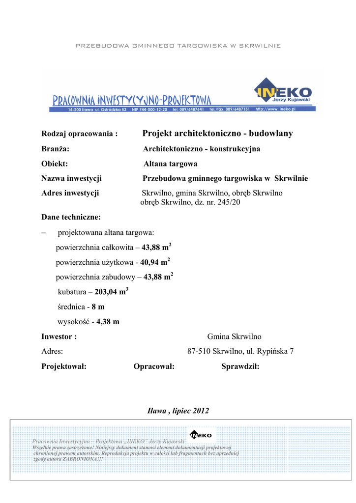 PRZEBUDOWA GMINNEGO TARGOWISKA W SKRWILNIE Rodzaj opracowania : Projekt architektoniczno - budowlany Branża: Architektoniczno - konstrukcyjna Obiekt: Altana targowa Nazwa inwestycji Przebudowa gminnego targowiska w Skrwilnie Adres inwestycji Skrwilno, gmina Skrwilno, obręb Skrwilno obręb Skrwilno, dz. nr. 245/20 Dane techniczne: − projektowana altana targowa: powierzchnia całkowita – 43,88 m2 powierzchnia użytkowa - 40,94 m2 powierzchnia zabudowy – 43,88 m2 kubatura – 203,04 m3 średnica - 8 m wysokość - 4,38 m Inwestor : Gmina Skrwilno 87-510 Skrwilno, ul. Rypińska 7 Adres: Projektował: Opracował: Sprawdził: Iława , lipiec 2012 Pracownia Inwestycyjno – Projektowa „INEKO” Jerzy Kujawski Wszelkie prawa zastrzeżone! Niniejszy dokument stanowi element dokumentacji projektowej chronionej prawem autorskim. Reprodukcja projektu w całości lub fragmentach bez uprzedniej zgody autora ZABRONIONA!!! PRZEBUDOWA GMINNEGO TARGOWISKA W SKRWILNIE CZĘŚĆ ARCHITEKTONICZNA Zawartość opracowania: - URPRAWNIENIA I ZAŚWIADCZENIA PROJEKTANTÓW - UPRAWNIENIA I ZAŚWIADCZENIA SPRAWDZAJĄCEGO 1.Oświadczenie projektantów str.3 2.Opis techniczny str.4-7 3.Informacja BIOZ str.8-10 4.Część graficzna: architektura - rzut fundamentów - rzut przyziemia - rzut konstrukcji dachu - rzut dachu - przekrój A-A - elewacja 5. Zestawienie drewna 6. Zestawienie stali zbrojeniowej Pracownia Inwestycyjno – Projektowa „INEKO” Jerzy Kujawski Wszelkie prawa zastrzeżone! Niniejszy dokument stanowi element dokumentacji projektowej chronionej prawem autorskim. Reprodukcja projektu w całości lub fragmentach bez uprzedniej zgody autora ZABRONIONA!!! rys. nr. 1 rys. nr. 2 rys. nr. 3 rys. nr. 4 rys. nr. 5 rys. nr. 6 PRZEBUDOWA GMINNEGO TARGOWISKA W SKRWILNIE Iława, Lipiec 2012 r. OŚWIADCZENIE: Dotyczy: Projektu budowlanego: „Przebudowa gminnego targowiska w Skrwilnie” Lokalizacja: Skrwilno, gmina Skrwilno, obręb Skrwilno , dz. nr. 245/20 Opracowanie: Projekt architektoniczno – budowlany Branża: Architektoniczno - konstrukcyjna Obiekt: Altana targowa Oświadczam, że projekt sporządzono zgodnie z obowiązującymi przepisami i zasadami wiedzy technicznej. Projektant: Sprawdzający: Pracownia Inwestycyjno – Projektowa „INEKO” Jerzy Kujawski Wszelkie prawa zastrzeżone! Niniejszy dokument stanowi element dokumentacji projektowej chronionej prawem autorskim. Reprodukcja projektu w całości lub fragmentach bez uprzedniej zgody autora ZABRONIONA!!! PRZEBUDOWA GMINNEGO TARGOWISKA W SKRWILNIE OPIS TECHNICZNY 1.DANE OGÓLNE 1.1. CELE INWESTYCJI: Celem projektowanej inwestycji jest altana targowa przy projektowanym targowisku: Nr. 7 – altana targowa • Projektowaną altanę targową projektuje się w miejscowości Skrwilno, Gmina Skrwilno, woj. kujawsko - pomorskie. Altana Targowa nr. 7 Obiekt jednokondygnacyjny. Zaprojektowano altanę targową celem stworzenia zadaszonych miejsc targowych. W przedmiotowym obiekcie nie zachodzi potrzeba wykonywania pracy stałej, wystarczająca jest doraźna obsługa urządzeń. 1.2. PODSTAWA OPRACOWANIA - Decyzja o warunkach zabudowy. 1.3. BILANS POWIERZCHNI - Powierzchnia zabudowy projektowanej altany targowej: - Powierzchnia użytkowa projektowanej altany targowej: - Kubatura projektowanej altany targowej: - 43,88 m2 - 40,94 m2 - 203,04 m3 2.DANE KONSTRUKCYJNO-MATERIAŁOWE 2.1. Opis ogólny konstrukcji altany targowej: - obiekt wykonany w tradycyjnej technologii. Fundamenty pod słupy z betonu B 20 żelbetowe , elementy konstrukcyjne altany z drewna C27 łączone z wykorzystaniem tradycyjnych rozwiązań ciesielskich zaimpregnowane przed środkiem impregnującym np. HolzProf bądź innym o identycznych właściwościach zabezpieczających drewno przed czynnikami zewnętrznymi. - planowane dojazdy i dojścia piesze wykonać z kostki betonowej zgodnie z projektem zagospodarowania terenu. 2.2. Fundamenty 2.2.1. Warunki geologiczno-inżynierskie Opinie wydaje się na podstawie dokonanych badań geotechnicznych dla przebudowy gminnego targowiska w Skrwilnie oraz innych opinii zasięgniętych w Pracownia Inwestycyjno – Projektowa „INEKO” Jerzy Kujawski Wszelkie prawa zastrzeżone! Niniejszy dokument stanowi element dokumentacji projektowej chronionej prawem autorskim. Reprodukcja projektu w całości lub fragmentach bez uprzedniej zgody autora ZABRONIONA!!! PRZEBUDOWA GMINNEGO TARGOWISKA W SKRWILNIE ramach wywiadu od inwestora i własnych obserwacji. - na poziomie posadowienia występują piaski drobne i gliny piaszczyste Właściwości gruntu pozwalają na bezpośrednie posadowienie obiektów na wykonanej wcześniej zagęszczonej podsypce piaskowej. 2.2.2.Fundamenty pod słupy. Wykonać zgodnie z częścią rysunkową opracowania. 2.3. Dach Dach o konstrukcji drewnianej według rysunków zawartych w opracowaniu, pokrycie blachodachówką w kolorze ceglastym. Przed montażem należy zaimpregnować preparatem np. HolzProf bądź innym spełniającym te same właściwości dotyczące ochrony drewna przed czynnikami zewnętrznymi następujące elementy dachu: - elementy konstrukcyjne - drewniane elementy poszycia - deski wykorzystane jako boazeria bądź inne elementy wykończeniowe 2.4. Elementy konstrukcyjne obiektu - wykonać zgodnie z częścią rysunkową opracowania. Przed montażem elementy konstrukcyjne należy zaimpregnować preparatem np. HolzProf bądź innym spełniającym te same właściwości dotyczące ochrony drewna przed czynnikami zewnętrznymi. 2.5. Elewacja - wykonać zgodnie z częścią rysunkowa opracowania Rynny i rury spustowe z PCV. 3. INSTALACJE Altana targowa wyposażona będzie w: 3.1.Instalacje elektryczne Wszystkie instalacje według odrębnego opracowania 4. INFORMACJE DODATKOWE Teren działki zgodnie z decyzją o warunkach zabudowy i zagospodarowania przestrzennego nie jest wpisany do rejestru zabytków. Śmietnik na terenie działki utylizacja poprzez wywóz. Niniejsze opracowanie zostało wykonane w zakresie proje