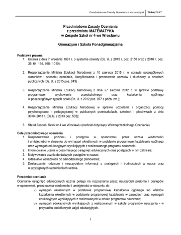 Przedmiotowe Zasady Oceniania z matematyki 2016/2017 Przedmiotowe Zasady Oceniania z przedmiotu MATEMATYKA w Zespole Szkół nr 4 we Wrocławiu Gimnazjum i Szkoła Ponadgimnazjalna Podstawa prawna 1. Ustawa z dnia 7 września 1991 r. o systemie oświaty (Dz. U. z 2015 r. poz. 2156 oraz z 2016 r. poz. 35, 64, 195, 668 i 1010); 2. Rozporządzenie Ministra Edukacji Narodowej z 10 czerwca 2015 r. w sprawie szczegółowych warunków i sposobu oceniania, klasyfikowania i promowania uczniów i słuchaczy w szkołach publicznych (Dz. U. z 2015 poz. 843) 3. Rozporządzenie Ministra Edukacji Narodowej z dnia 27 sierpnia 2012 r. w sprawie podstawy programowej wychowania przedszkolnego oraz kształcenia ogólnego w poszczególnych typach szkół (Dz. U. z 2012 poz. 977 z późn. zm.); 4. Rozporządzenie Ministra Edukacji Narodowej w sprawie udzielania i organizacji pomocy psychologiczno - pedagogicznej w publicznych przedszkolach, szkołach i placówkach z dnia 30.04.2013 r. (Dz.U. z 2013 poz. 532); 5. Statut Zespołu Szkół nr 4 we Wrocławiu (rozdział dotyczący Wewnątrzszkolnego Oceniania) Cele przedmiotowego oceniania 1. Rozpoznawanie poziomu i postępów w opanowaniu przez ucznia wiadomości i umiejętności w stosunku do wymagań określonych w podstawie programowej kształcenia ogólnego oraz wymagań edukacyjnych wynikających z realizowanego programu nauczania; 2. Informowanie ucznia o poziomie jego osiągnięć edukacyjnych oraz postępach w tym zakresie; 3. Motywowanie ucznia do dalszych postępów w nauce; 4. Udzielanie wskazówek do samodzielnego planowania; 5. Dostarczanie rodzicom i nauczycielom informacji o postępach i trudnościach w nauce oraz o szczególnych uzdolnieniach ucznia. Przedmiot oceniania Ocenianie osiągnięć edukacyjnych ucznia polega na rozpoznaniu przez nauczycieli poziomu i postępów w opanowaniu przez ucznia wiadomości i umiejętności w stosunku do: a) wymagań określonych w podstawie programowej kształcenia ogólnego lub efektów kształcenia określonych w podstawie programowej kształcenia w zawodach oraz wymagań edukacyjnych wynikających z realizowanych w szkole programów nauczania; b) wymagań edukacyjnych wynikających z realizowanych w szkole programów nauczania - w przypadku dodatkowych zajęć edukacyjnych. 1 Przedmiotowe Zasady Oceniania z matematyki 2016/2017 Zakres przedmiotowego oceniania 1. Formułowanie wymagań edukacyjnych niezbędnych do otrzymania przez ucznia poszczególnych śródrocznych i rocznych ocen klasyfikacyjnych z zajęć edukacyjnych; 2. Ustalenie sposobów i form sprawdzania osiągnięć edukacyjnych uczniów oraz częstotliwość ich występowania; 3. Ustalanie ocen bieżących oraz ich wag; 4. Ustalenie śródrocznych i rocznych ocen klasyfikacyjnych (w szczególności wskazanie tych form sprawdzania wiedzy i umiejętności, które są niezbędne do otrzymania oceny pozytywnej) 5. Ustalenie warunków i trybu uzyskana wyższych niż przewidywane rocznych ocen klasyfikacyjnych; 6. Ustalenie zasad informowania ucznia o poziomie jego wiedzy i postępach w nauce; 7. Ustalenie zasad współpracy w zakresie pomocy w nauce i samodzielnego rozwoju ucznia (poprawy); 8. Ustalenie warunków i sposobu przekazywania rodzicom informacji o postępach i trudnościach ucznia w nauce. Ad 1. Wymagania edukacyjne niezbędne do uzyskania poszczególnych śródrocznych i rocznych ocen klasyfikacyjnych W ocenianiu bieżącym oraz klasyfikowaniu śródrocznym i rocznym stosuje się sześciostopniową skalę ocen. Przy ustalaniu ocen bieżących dopuszcza się stosowanie plusów i minusów. Ocenę niedostateczną otrzymuje uczeń, który: nie spełnił kryteriów na ocenę dopuszczającą; posiada braki wiedzy i umiejętności uniemożliwiające edukację na wyższym poziomie; nie podejmuje prób rozwiązania zadań schematycznych, nawet przy pomocy nauczyciela; nie rozwiązuje najprostszych zadań. Ocenę dopuszczającą otrzymuje uczeń, który: w ograniczonym zakresie opanował podstawowe wiadomości, nie przeszkodzi mu to jednak w kontynuowaniu i pogłębianiu wiedzy na wyższym poziomie edukacji; przy pomocy nauczyciela rozwiązuje typowe zadania; podejmuje liczne próby, nie zawsze skuteczne; nie lekceważy przedmiotu i nauczyciela. ma 75% zaliczonych na ocenę pozytywną obowiązkowych sprawdzianów. Ocenę dostateczną otrzymuje uczeń, który: opanował podstawowe treści programowe w zakresie przewidzianym dla danej klasy; rozwiązuje typowe zadania o średnim stopniu trudności, czasem korzysta z pomocy nauczyciela; nie ma prac pisemnych ocenionych na niedostateczny. Ocenę dobrą otrzymuje uczeń, który: opanował pełny zakres wiadomości i umiejętności; poprawnie stosuje nabyte umiejętności; samodzielnie rozwiązuje typowe zadania; pisze sprawdziany pisemne oceniane na dobry i wyżej (może pojawić się 20% ocen niższych); reprezentuje bierną postawę na lekcji mimo posiadanych wiadomości. 2 Przedmiotowe Zasady Oceniania z matematyki 2016/2017 Ocenę bardzo dobrą otrzymuje uczeń, który: opanował pełny zakres wiedzy i umiejętności określony programem; sprawnie posługuje się zdobytymi wiadomościami; samodzielnie rozwiązuje problemy; rozwiązuje zadanie w nowych sytuacjach; pisze prace pisemne oceniane na 4,5 lub 6; reprezentuje aktywną postawę na lekcji. Ocenę celującą otrzymuje uczeń, który: posiada wiedzę i umiejętności wykraczające poza zagadnienia przewidziane podstawą programową; aktywnie uczestniczy w zajęciach lekcyjnych; pomaga uczniom słabszym; reprezentuje szkołę w konkursach matematycznych; rozwiązuje zadania nietypowe, jego umiejętności nie ograniczają się do schematów. Ad 2. Sposoby i formy sprawdzania osiągnięć uczniów Obowiązkowe formy pracy ucznia, które podlegają ocenianiu: Minimalna liczba sprawdzeń w semestrze Formy sprawdzeń 2 razy w semestrze praca klasowa (sprawdzian) w miarę potrzeb kartkówka 1 raz w semestrze odpowiedź ustna zadania bieżące i zadania