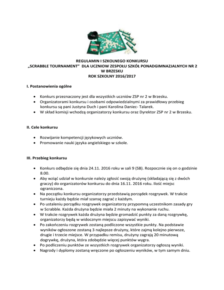 REGULAMINISZKOLNEGOKONKURSU „SCRABBLETOURNAMENT”DLAUCZNIOWZESPOŁUSZKÓŁPONADGIMNAZJALNYCHNR2 WBRZESKU ROKSZKOLNY2016/2017 I.Postanowieniaogólne • KonkursprzeznaczonyjestdlawszystkichuczniówZSPnr2wBrzesku. • Organizatoramikonkursuiosobamiodpowiedzialnymizaprawidłowyprzebieg konkursusąpaniJustynaDuchipaniKarolinaDaniec-Talarek. • WskładkomisjiwchodząorganizatorzykonkursuorazDyrektorZSPnr2wBrzesku. II.Celekonkursu • Rozwijaniekompetencjijęzykowychuczniów. • Promowanienaukijęzykaangielskiegowszkole. III.Przebiegkonkursu • Konkursodbędziesiędnia24.11.2016rokuwsali9(SB).Rozpoczniesięonogodzinie 8.00. • Abywziąćudziałwkonkursienależyzgłosićswojądrużynę(składającąsięzdwóch graczy)doorganizatorówkonkursudodnia16.11.2016roku.Ilośćmiejsc ograniczona. • Napoczątkukonkursuorganizatorzyprzedstawiąporządekrozgrywek.Wtrakcie turniejukażdybędziemiałszansęzagraćzkażdym. • Poustaleniuporządkurozgrywekorganizatorzyprzypomnąuczestnikomzasadygry wScrabble.Każdadrużynabędziemiała2minutynawykonanieruchu. • Wtrakcierozgrywekkażdadrużynabędziegromadzićpunktyzadanąrozgrywkę, organizatorzybędąwwidocznymmiejscuzapisywaćwyniki. • Pozakończeniurozgrywekzostanąpodliczonewszystkiepunkty.Napodstawie wynikówogłoszonezostaną3najlepszedrużyny,którezajmąkolejnopierwsze, drugieitrzeciemiejsce.Wprzypadkuremisu,drużynyzagrają20minutową dogrywkę,drużyna,którazdobędziewięcejpunktówwygra. • Popodliczeniupunktówzewszystkichrozgrywekorganizatorzyogłosząwyniki. • Nagrodyidyplomyzostanąwręczonepoogłoszeniuwyników,wtymsamymdniu. IV.Informacjekońcowe • InformacjenatematkonkursubędązamieszczonenastronieinternetowejZSPnr2 wBrzeskuorazzostanąprzekazaneprzezszkolnyradiowęzeł.Informacjirównież udzielaćbędąpanieDuchiDaniec-Talarek. • Wszyscyuczniowiebiorącyudziałwkonkursieotrzymająocenybardzodobre zaktywnościzj.angielskiegoorazpozytywneuwagi. Scrabble- zasady gry SCRABBLE® to gra słowna dla 2, 3 lub 4 graczy. Polega na układaniu na planszy powiązanych ze sobą słów, przy użyciu płytek z literami o różnej wartości - przypomina to budowanie krzyżówki. Celem gry jest uzyskanie jak najwyższego wyniku. Każdy gracz stara sie uzyskać jak najwięcej punktów, układając słowa w taki sposób, aby wykorzystać wartość liter i premiowane pola planszy. Zawartość pudełka z grą 1 plansza 100 płytek z literami 4 stojaki na literki woreczek na literki Gracze mają do dyspozycji 98 płytek z literami z alfabetu oraz dwie płytki blank. Każdej literze odpowiada określona liczba punktów (widoczna w prawym dolnym rogu płytki). Blank nie ma wartości punktowej i może zastąpić dowolna literę z alfabetu. Gracz, który kładzie blanka musi powiedzieć jaką literę on zastępuje- ustalenie to pozostanie ważne do końca gry. Reguły gry 1. Zapisywanie wyników Jeden z graczy otrzymuje zadanie zapisywania wyników, robi to po zakończeniu każdego ruchu. 2. Wymiana płytek Każdy gracz może wykorzystać swój ruch na wymianę dowolnej liczby płytek. W tym celu zdejmuje je ze stojaka, tak aby nie było widać liter, bierze z woreczka losowo taką sama liczbę liter, a następnie wrzuca odłożone płytki do woreczka. Na tym jego ruch się kończy i kolejka przechodzi na następnego gracza. Reguły turniejowe zakazują wymiany płytek wtedy, gdy w woreczku jest mniej niż siedem liter. Zasada ta została wprowadzona w Anglii przede wszystkim po to, by uniemożliwić graczom wymianę litery Q gdy nie mieli litery U pod koniec partii. 3. Opuszczanie kolejki Oprócz możliwości ułożenia słów na planszy lub wymiany płytek gracz może także postanowić, że opuści kolejkę niezależnie od tego czy jest w stanie ułożyć słowo czy nie. Gra kończy się jednak, jeśli wszyscy gracze dwa razy z rzędu opuszczą kolejkę. 4. Ułożenie pierwszego słowa Przed rozpoczęciem gry uczestnicy losują z woreczka po jednej literce, aby określić, kto rozpocznie grę. Gracz, który wylosuje literkę najbliższą początkowi alfabetu zaczyna grę (blank zastępuje dowolna literę z zestawu wybraną przez gracza). Pierwszy wyraz musi być ułożony na planszy pionowo lub poziomo, tak aby przechodził przez centralne pole z gwiazdką. Nie wolno układać słów ukośnie. 5. Dozwolone słowa Dozwolone jest korzystanie ze wszystkich słów znajdujących się w słownikach języka angielskiego oraz ich poprawnych form gramatycznych, z wyjątkiem tych, które zaczynają się od wielkiej litery, są skrótami, przedrostkami lub przyrostkami albo wymagają użycia apostrofu lub łącznika. Wszystkie słowa dozwolone są zawarte w słowniku na stronie internetowej: http://scrabble.hasbro.com/en-us/tools#dictionary Po zakończeniu ruchu nie można zmieniać położenia na planszy żadnej płytki, ani jej zdejmować, chyba, że słowo zostanie słusznie zakwestionowane. To samo słowo może być użyte w grze więcej niż raz. Słowo można w jednym ruchu przedłużyć z obu jego końców np. fridge-> REfridgeRATOR. Wszystkie płytki użyte w trakcie ruchu muszą znaleźć się w linii poziomej lub pionowej. Nie jest dozwolone dokładanie w jednym ruchu płytek do różnych słów w różnych częściach planszy. Jeśli w jednym ruchu zostanie ułożonych kilka słów to liczone jest każde takie słowo łącznie z premiami. Jeśli wyraz przechodzi przez dwa pola premii słownych, suma punktów jego liter jest mnożona przez 4 (2x2) lub przez 9 (3x3). 6. Kwestionowanie słów Po ułożeniu słowa, jeszcze przed zapisaniem wyniku i przejściem kolejki na następnego gracza można zakwestionować poprawność tego słowa. Wtedy i tylko wtedy można sprawdzić poprawność tego słowa w słowniku. Jeśli zakwestionowane słowo okaże się niedozwolone, gracz musi zabrać wyłożone przez siebie płytki z planszy i kolejka przechodzi na kolejnego gracza. 7. Pola premiowe Na planszy znajdują się specjalne premiowe pola, które zw