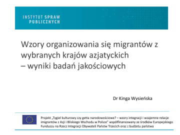 Wzory organizowania się migrantów z wybranych krajów azjatyckich – wyniki badań jakościowych Dr Kinga Wysieńska Projekt „Tygiel kulturowy czy getta narodowościowe? – wzory integracji i wzajemne relacje imigrantów z Azji i Bliskiego Wschodu w Polsce” współfinansowany ze środków Europejskiego Funduszu na Rzecz Integracji Obywateli Państw Trzecich oraz z budżetu państwa Kontekst badania: • Ambiwalentny stosunek do roli organizacji migrantów w procesie integracji. • Są one postrzegane, z jednej strony, jako ułatwiające proces adaptacji cudzoziemców w nowym kraju dzięki dostarczaniu wsparcia, informacji i przestrzeni do spotkań w gronie danej społeczności migranckiej. • Z drugiej strony są postrzegane jako wzmacniające poczucie odrębności przez ułatwianie utrzymywania więzi z krajem i kulturą pochodzenia, więzi transnacjonalnych i transnacjonalnych tożsamości. Kontekst teoretyczny Koncepcja kompletności instytucjonalnej (Breton 1991) • Rodzaj oraz liczba powiązań i wzajemnych relacji w obrębie danej grupy. • Kontinuum kompletności: • od sytuacji, w której istnieje gęsta sieć powiązań opartych na relacjach przyjacielskich i nieformalnych, brakuje jednak instytucjonalizacji tych relacji, • do sytuacji, w której dana grupa etniczna – przez uformowanie sieci różnych instytucji etnicznych (kościołów, centrów kulturalnych, izb handlowych, organizacji edukacyjnych, profesjonalnych) – jest w stanie zaspokoić potrzeby przynależności i afiliacji czy wszystkie inne potrzeby migranta tak, że w zasadzie nie musi on szukać kontaktu na zewnątrz własnej grupy. Kontekst teoretyczny • Liczba organizacji formalnych. • Typy organizacji. • Cele i działalność organizacji, w tym rodzaje prowadzonej aktywności. • Formalni i nieformalni liderzy organizacji • Członkowie organizacji. • Wewnętrzne i zewnętrzne powiązania organizacji (struktura więzi wewnątrz organizacji i z otoczeniem zewnętrznym). Charakterystyka próby, metoda prowadzenia wywiadów • Trzydzieści wywiadów pogłębionych z osobami pochodzenia azjatyckiego i bliskowschodniego, którzy byli liderami w obrębie danych społeczności. • Dobór respondentów miał charakter kryterialny i celowy. • Podstawowym kryterium był kraj pochodzenia i zajmowanie pozycji przywódczych w organizacji, stowarzyszeniu czy innej formalnej lub nieformalnej grupie cudzoziemców albo bycie ważnym (w sensie wpływu społecznego) członkiem danej społeczności (na przykład tłumacze, osoby mające wiele kontaktów w ramach danej społeczności. Organizacje Indyjskie I had this project to promote Indian economy in Poland, but people are more interested in spirituality, in kropka, in krowa, they don’t want to know much about economy. They only want Diwali and so on. Organizacje Indyjskie [There are] these seminars to which people, Indian people, come. And then [...] we know that this guy, who owns a company or an institute, wants to interact with Polish, with this country, he wants to sell something. [So] that time, we also get along with this guy, if it is possible to exchange some goods or some business. So it is good for us, it is an announcement for us. Organizacje tureckie Dla przykładu, jeśli do organizacji zgłasza się polski lub turecki przedsiębiorca, stowarzyszenie pomaga mu w znalezieniu partnera biznesowego z drugiej strony. Organizacja ma służyć jako pośrednik i instytucja negocjująca. Organizacje ormiańskie (koniec lat 90.) Impulsem (…) była chęć pomocy Ormianom w legalizacji pobytu i innego rodzaju pomoc prawna [R7]; [...] założyliśmy to stowarzyszenie, [żeby] można było pomóc naszym rodakom, żeby tutaj ulegalizować swój stan, nie, żeby w jakiś sposób na obronę [R6]. Organizacje ormiańskie (obecnie) Jeśli nie byłoby takich ludzi, jak my, szkół, które organizujemy, Kościoła, to za chwilę nie byłoby języka ormiańskiego, w drugim pokoleniu, a trzecie to mówiłoby co najwyżej „mój dziadek był Ormianinem”. Po prostu współdziałamy z innymi stowarzyszeniami ormiańskimi, też i z innymi narodowościami, z Rosjanami, [...] Ukraińcami, Niemcami. (…) organizujemy różne imprezy czy spotkania takie, [...] bo żeby dużą taką imprezę zorganizować, to siły jednego stowarzyszenia nie wystarcza, a jak jest współpraca – jest lepiej. Każdy coś robi. Wnioski • W każdej z opisywanych społeczności imigrantów przybyłych do Polski po 1989 roku rozpoczął się proces instytucjonalizacji, przy czym najbardziej zaawansowany jest on w wypadku społeczności migrantów z Indii. • W wypadku wszystkich społeczności dominują organizacje nastawione na podtrzymywanie tożsamości kulturowej i organizacje wspomagające proces integracji ekonomicznej. • Liderami różnych typów organizacji są często te same osoby. Wnioski • Organizacje migrantów mają służyć podtrzymywaniu więzi transnarodowych. Relacje transnarodowe są związane z procesem, dzięki któremu migranci ustanawiają i strukturyzują różnego rodzaju więzi pomiędzy krajem pochodzenia a krajem osiedlenia. Proces ten jest szczególnie intensywny, jeśli działalność danej grupy wymaga regularnych kontaktów i wymiany zasobów (w tym społecznych) pomiędzy osobami, które zostały w kraju pochodzenia i migrantami (Zhou i Lee 2011). Wnioski W wypadku społeczności hinduskiej i tureckiej, dominujące są transnarodowe relacje o charakterze ekonomicznym. Wiele z organizacji, z których przedstawicielami rozmawiano, deklarowało jako cel pośredniczenie w nawiązywaniu tego typu relacji. Co więcej, transnarodowość w wypadku tych dwóch społeczności jest rozumiana szeroko, to jest, nie tylko jako strukturyzowanie bezpośrednich relacji pomiędzy osobami w kraju pochodzenia i migrantami, ale także pomiędzy migrantami w różnych krajach (członkami diaspory). Z kolei w wypadku Ormian, to działalność mająca na celu pod