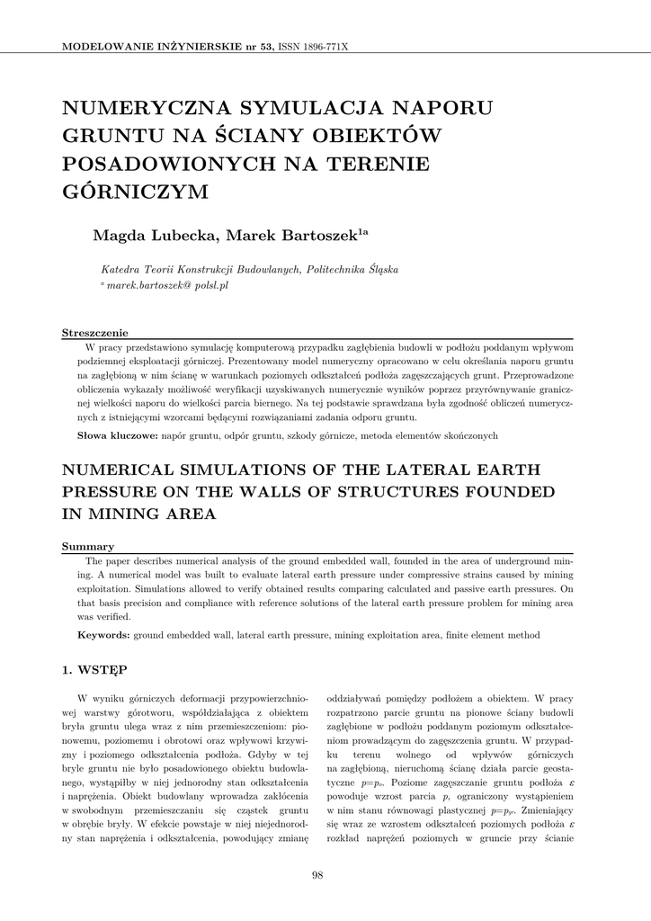 MODELOWANIE INŻYNIERSKIE nr 53, ISSN 1896-771X NUMERYCZNA SYMULACJA NAPORU GRUNTU NA ŚCIANY OBIEKTÓW POSADOWIONYCH NA TERENIE GÓRNICZYM Magda Lubecka, Marek Bartoszek1a Katedra Teorii Konstrukcji Budowlanych, Politechnika Śląska a marek.bartoszek@ polsl.pl, [email protected] Streszczenie W pracy przedstawiono symulację komputerową przypadku zagłębienia budowli w podłożu poddanym wpływom podziemnej eksploatacji górniczej. Prezentowany model numeryczny opracowano w celu określania naporu gruntu na zagłębioną w nim ścianę w warunkach poziomych odkształceń podłoża zagęszczających grunt. Przeprowadzone obliczenia wykazały możliwość weryfikacji uzyskiwanych numerycznie wyników poprzez przyrównywanie granicznej wielkości naporu do wielkości parcia biernego. Na tej podstawie sprawdzana była zgodność obliczeń numerycznych z istniejącymi wzorcami będącymi rozwiązaniami zadania odporu gruntu. Słowa kluczowe: napór gruntu, odpór gruntu, szkody górnicze, metoda elementów skończonych NUMERICAL SIMULATIONS OF THE LATERAL EARTH PRESSURE ON THE WALLS OF STRUCTURES FOUNDED IN MINING AREA Summary The paper describes numerical analysis of the ground embedded wall, founded in the area of underground mining. A numerical model was built to evaluate lateral earth pressure under compressive strains caused by mining exploitation. Simulations allowed to verify obtained results comparing calculated and passive earth pressures. On that basis precision and compliance with reference solutions of the lateral earth pressure problem for mining area was verified. Keywords: ground embedded wall, lateral earth pressure, mining exploitation area, finite element method 1. WSTĘP W wyniku górniczych deformacji przypowierzchniowej warstwy górotworu, współdziałająca z obiektem bryła gruntu ulega wraz z nim przemieszczeniom: pionowemu, poziomemu i obrotowi oraz wpływowi krzywizny i poziomego odkształcenia podłoża. Gdyby w tej bryle gruntu nie było posadowionego obiektu budowlanego, wystąpiłby w niej jednorodny stan odkształcenia i naprężenia. Obiekt budowlany wprowadza zakłócenia w swobodnym przemieszczaniu się cząstek gruntu w obrębie bryły. W efekcie powstaje w niej niejednorodny stan naprężenia i odkształcenia, powodujący zmianę oddziaływań pomiędzy podłożem a obiektem. W pracy rozpatrzono parcie gruntu na pionowe ściany budowli zagłębione w podłożu poddanym poziomym odkształceniom prowadzącym do zagęszczenia gruntu. W przypadku terenu wolnego od wpływów górniczych na zagłębioną, nieruchomą ścianę działa parcie geostatyczne p=po. Poziome zagęszczanie gruntu podłoża ε powoduje wzrost parcia p, ograniczony wystąpieniem w nim stanu równowagi plastycznej p=pgr. Zmieniający się wraz ze wzrostem odkształceń poziomych podłoża ε rozkład naprężeń poziomych w gruncie przy ścianie 98 Magda Lubecka, Marek Bartoszek prezentuje rys.1. Linią przerywaną oznaczono wprowadzony do modelu numerycznego stan początkowy, równy parciu spoczynkowemu p=po. Krzywe oznaczone liniami ciągłymi uzyskano przy kolejnym, coraz większym zagęszczeniu gruntu w modelu podłoża górniczego. 0 0 50 100 150 200 250 300 p [kPa] 0.5 1 1.5 2 2.5 3 3.5 4 z [m] Rys. 2. Schemat układu obliczeniowego budowla - podłoże; a) teren górniczy, przypadek naporu gruntu na ścianę (TG), b) teren niegórniczy, przypadek odporu gruntu (PB) Rys. 1. Przyrost parcia gruntu na ścianę w wyniku poziomych odkształceń podłoża zagęszczających grunt ε Istniejące analityczne metody obliczeniowe nie dają jednoznacznej informacji o mobilizacji naporu gruntu na ścianę w wyniku poziomych odkształceń podłoża. Określając napór jako wielkość pośrednią pomiędzy parciem czynnym i biernym, zauważa się, że różnią się one między sobą co do opisu wzrostu parcia w zależności od odkształceń podłoża górniczego, wymiarów budowli czy cech gruntu. Przeprowadzone obliczenia wykorzystujące metodę elementów skończonych miały na celu dostosowanie modelu numerycznego do potrzeb postawionego problemu. Opierając się na doświadczalnie stwierdzonej możliwości osiągnięcia przez napór wielkości parcia biernego [1], w każdym z rozważanych zadań doprowadzano do wytworzenia się w zagęszczanym gruncie przed ścianą budowli klasycznego klina odłamu. Stosowanie dla gruntu sprężysto idealnie plastycznego modelu materiału – Coulomba Mohra pozwoliło z kolei na weryfikację uzyskanych wyników poprzez przyrównywanie ich do wartości otrzymywanych za pomocą metod analitycznych opartych na klasycznej teorii parcia. Ostatecznie prezentowane rozważania koncentrują się wokół prawidłowego określenia granicznych wartości naporu i odporu gruntu. Skupiono się w nich również na analizie tworzących się w gruncie przy ścianie stref uplastycznienia bezpośrednio wpływających na te wielkości. Podukład (B) reprezentował budowlę o szerokości 2b zagłębioną w podłożu (Pg) na wysokość h. Pracę materiału charakteryzującego budowlę (B) opisano sprężystym modelem konstytutywnym za pomocą parametrów: ciężar objętościowy =20 kN/m3, moduł sprężystości E=30 GPa oraz współczynnik Poissona =0,17. Podukład odpowiadający podłożu górniczemu (Pg) reprezentował z kolei pewien skończony podobszar podłoża współpracującego z budowlą (B) i deformującego się w wyniku eksploatacji górniczej. Poziome odkształcenia podłoża ε odtworzono w modelu za pomocą kinematycznych warunków brzegowych nałożonych na dolną i boczną prawą krawędź modelu w postaci przemieszczeń poziomych ε x. Grunt opisano sprężysto idealnie plastycznym modelem konstytutywnym o powierzchni plastyczności Coulomba Mohra. Układ obliczeniowy (B)(Pg) uproszczono, zakładając jego pionową oś symetrii w połowie szerokości budowli (B). Przydatność opisanego modelu terenu górniczego (TG) do określania wielkości naporu sprawdzano,