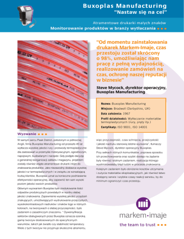 Buxoplas Manufacturing “Nastaw się na cel” Atramentowe drukarki małych znaków Monitorowanie produktów w branży wytłaczania “Od momentu zainstalowania drukarek Markem-Imaje, czas przestoju został skrócony o 98%, umożliwiając nam pracę z pełną wydajnością, realizowanie zamówień na czas, ochronę naszej reputacji w biznesie” Steve Mycock, dyrektor operacyjny, Buxoplas Manufacturing Nazwa: Buxoplas Manufacturing Miejsce: Bradwell (Derbyshire, UK) Data założenia: 1967 Profil działalności: Wytłaczanie materiałów termoplastycznych (rury, prety itp.) Certyfikaty: ISO 9001, ISO 14001 Wyzwanie W samym sercu Peak District, położonym w północnej więc przyczepność, czas schnięcia, przejrzystość wytłacza wysokiej jakości rury i przewody termoplastyczne Steve Mycock, dyrektor operacyjny Buxoplas. Anglii, firma Buxoplas Manufacturing od przeszło 45 lat i jakość nadruku stanowią istotne wyzwania”, tłumaczy dla zastosowań w przemyśle motoryzacyjnym, ogrodniczym, Przy setkach różnych komunikatów, poprawa sposobu napojowym, budowlanym i narzędzi. Gdy podjęto decyzję o generalnej reorganizacji zakładu i magazynu, projektem zostały również objęte atramentowe drukarki inkjet do znakowania produktów. Jako niezawodny dostawca wysokiej jakości rur termoplastycznych i w związku ze wzrastającą liczbą klientów, Buxoplas uznał za konieczne podniesienie efektywności operacyjnej, aby zapewnić ten sam wysoki poziom jakości swoich produktów. Głównym wyzwaniem Buxoplas było zredukowanie ilości odpadów produkcyjnych powstałych w wyniku słabej jakości znakowania. Zapewnienie wysokiej jakości urządzeń znakujących, umożliwiających wydrukowanie przejrzystych, wysokokontrastowych nadruków i znaków logo w różnych kolorach, na tworzywach o słabej przyczepności, było zadaniem o zasadniczym znaczeniu. “ Dywersyfikacja sektorów obsługiwanych przez Buxoplas oznacza szeroką gamę tworzyw dostosowanych do specyficznych warunków, takich jak światło czy stabilność temperatury. Wiele z tych tworzyw nie przyjmuje skutecznie atramentu, ich przechowywania oraz szybki dostęp na żądanie były również istotnym zadaniem, realizacja którego wyeliminowałaby błąd ludzki w procesie znakowania. Kolejnym zadaniem było obniżenie kosztów utrzymania i zużycia materiałów eksploatacyjnych, jak również łatwo dostępny serwis i szybkie czasy reakcji serwisu, by do minimum ograniczyć czas przestoju. Monitorowanie produktów w branży wytłaczania Jakie rozwiązanie zaoferowało Markem-Imaje W 2011, Buxoplas zdecydował się na wymianę 11 drukarek inkjet na drukarki Markem-Imaje - 10 drukarek 9232 i jedną 9232E. Zaprojektowana z myślą o potrzebach przemysłu tworzyw sztucznych, drukarka 9232E została wybrana ze względu na biały atrament do ciemnych powierzchni. “Nasza produkcja obejmuje 16 linii produkcyjnych obciążonych przez 12 godzin na Buxoplas Manufacturing wybrało drukarki Markem-Imaje 9232 i 9232E do kodowania i monitoringu produktów termoplastycznych. dobę. Gdy zachodzi potrzeba, przenosimy drukarki pomiędzy liniami. Można to łatwo” tłumaczy Drukarka 9232E znakuje białym atramentem czarne tuby w Buxoplas Manufacturing. Druk długich Dzięki kontraktowi na dostawę materiałów eksploata- zrobić bardzo Steve Mycock. komunikatów o rozbudowanej zawartości, z datą, godziną, znakami logo, numerem partii wymaga, by drukarka była przyjazna w obsłudze. Port USB umożliwiający załadowanie w dowolnym momencie setek komunikatów, zamiast ich ręcznego wprowadzania do drukarki, eliminuje liczbę błędów. “Od czasu zainstalowania drukarek 9232 i 9232E, czas przestoju został skrócony o 98%, umożliwiając produkcję z pełną cyjnych oraz przy wydłużonej żywotności atramentu do drukarek 9232 i 9232E, Buxoplas zmniejszył zużycie materiałów o 80% i zoptymalizował poziom zapasów magazynowych. “Nasi operatorzy przeszli spersonalizowane szkolenie umożliwiające optymalne wykorzystanie drukarek. Mogą wykonywać codzienne czynności konserwacyjne i serwisowe, zabezpieczające przed przestojami i podnoszące jakość druku. Możemy realizować zamówienia szybko i efektywnie” konkluduje Steve Mycock. wydajnością, szybką realizację zamówień i chroniąc reputację firmy”, dodaje. Buxoplas ograniczył koszty i podwyższył standardy w zakresie ochrony środowiska. Niezawodność i wysokiej jakości nadruk pomogły zredukować ilość odpadów o 30%. DR - 12/12 Informacje o innych wdrożeniach dostępne na stronach www.coleman.pl Coleman International Sp. z o.o. ul. Królowej Marysieńki 76 tel: 022/651-76-63 do 65 fax: 022/642-78-40 http://www.coleman.pl Markem-Imaje SAS 9, rue Gaspard Monge B.P. 110 26501 Bourg-lès-Valence Cedex France Tél. : +33 (0) 4 75 75 55 00 Fax : +33 (0) 4 75 82 98 10