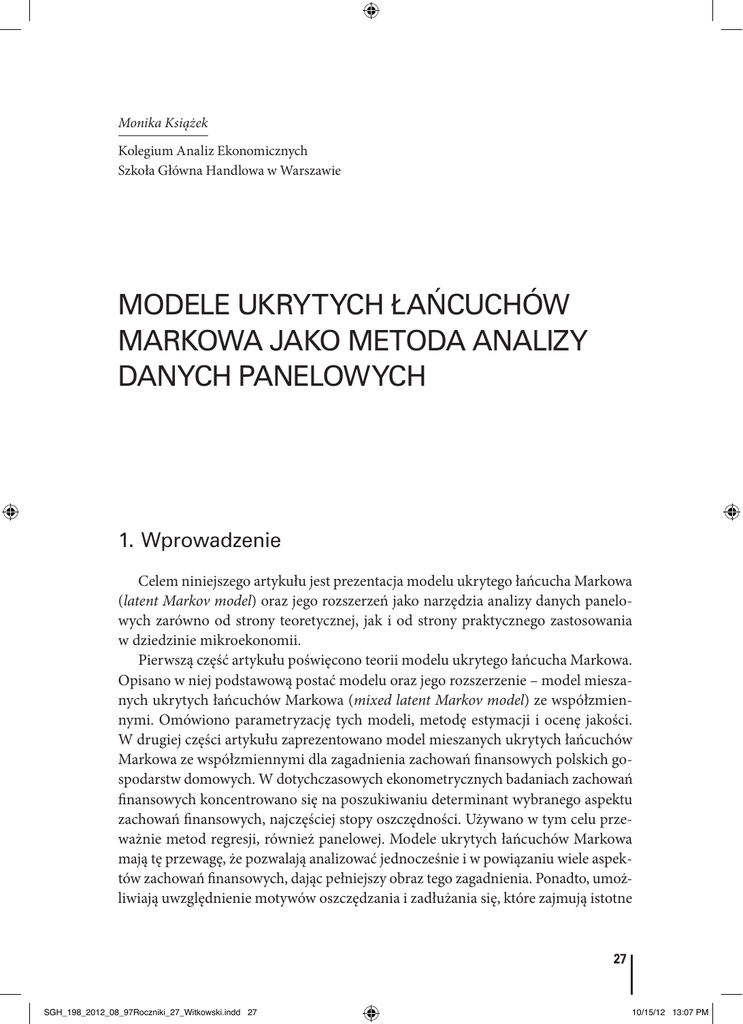 ważnie metod regresji, również panelowej. Modele ukrytych łańcuchów Markowa