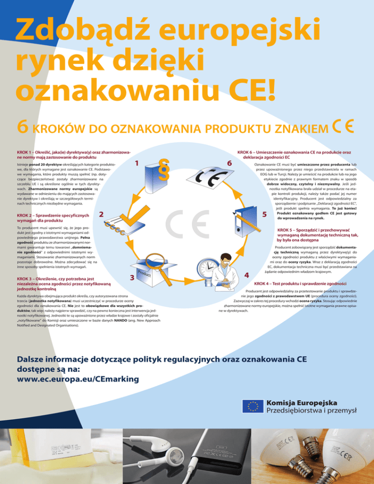 Zdobądź europejski rynek dzięki oznakowaniu CE! 6 KROKÓW DO OZNAKOWANIA PRODUKTU ZNAKIEM KROK 1 – Określić, jaka(ie) dyrektywa(y) oraz zharmonizowane normy mają zastosowanie do produktu Istnieje ponad 20 dyrektyw określających kategorie produktowe, dla których wymagane jest oznakowanie CE. Podstawowe wymagania, które produkty muszą spełnić (np. dotyczące bezpieczeństwa) zostały zharmonizowane na szczeblu UE i są określone ogólnie w tych dyrektywach. Zharmonizowane normy europejskie są wydawane w odniesieniu do mających zastosowanie dyrektyw i określają w szczegółowych terminach technicznych niezbędne wymagania. KROK 2 – Sprawdzenie specyficznych wymagań dla produktu 1 6 KROK 6 – Umieszczenie oznakowania CE na produkcie oraz deklaracja zgodności EC Oznakowanie CE musi być umieszczone przez producenta lub przez upoważnionego przez niego przedstawiciela w ramach EOG lub w Turcji. Należy je umieścić na produkcie lub na jego etykiecie zgodnie z prawnym formatem znaku w sposób dobrze widoczny, czytelny i niezmywalny. Jeśli jednostka notyfikowana brała udział w procedurze na etapie kontroli produkcji, należy także podać jej numer identyfikacyjny. Producent jest odpowiedzialny za sporządzenie i podpisanie „Deklaracji zgodności EC”, jeśli produkt spełnia wymagania. To już koniec! Produkt oznakowany godłem CE jest gotowy do wprowadzenia na rynek. 2 5 To producent musi upewnić się, że jego produkt jest zgodny z istotnymi wymaganiami odpowiedniego prawodawstwa unijnego. Pełna zgodność produktu ze zharmonizowanymi normami gwarantuje temu towarowi „domniemanie zgodności” z odpowiednimi istotnymi wymaganiami. Stosowanie zharmonizowanych norm pozostaje dobrowolne. Można zdecydować się na inne sposoby spełnienia istotnych wymagań. KROK 3 – Określenie, czy potrzebna jest niezależna ocena zgodności przez notyfikowaną jednostkę kontrolną KROK 5 – Sporządzić i przechowywać wymaganą dokumentację techniczną tak, by była ona dostępna 3 Każda dyrektywa obejmująca produkt określa, czy autoryzowana strona trzecia (jednostka notyfikowana) musi uczestniczyć w procedurze oceny zgodności dla oznakowania CE. Nie jest to obowiązkowe dla wszystkich produktów, tak więc należy najpierw sprawdzić, czy na pewno konieczna jest interwencja jednostki notyfikowanej. Jednostki te są upoważnione przez władze krajowe i zostały oficjalnie „notyfikowane” do Komisji oraz umieszczone w bazie danych NANDO (ang. New Approach Notified and Designated Organisations). 4 Producent zobowiązany jest sporządzić dokumentację techniczną wymaganą przez dyrektywę(y) do oceny zgodności produktu z właściwymi wymaganiami oraz do oceny ryzyka. Wraz z deklaracją zgodności EC, dokumentacja techniczna musi być przedstawiana na żądanie odpowiednim władzom krajowym. KROK 4 – Test produktu i sprawdzenie zgodności Producent jest odpowiedzialny za przetestowanie produktu i sprawdzenie jego zgodności z prawodawstwem UE (procedura oceny zgodności). Zazwyczaj w zakres tej procedury wchodzi ocena ryzyka. Stosując odpowiednie zharmonizowane normy europejskie, można spełnić istotne wymagania prawne opisane w dyrektywach. Dalsze informacje dotyczące polityk regulacyjnych oraz oznakowania CE dostępne są na: www.ec.europa.eu/CEmarking Komisja Europejska Przedsiębiorstwa i przemysł