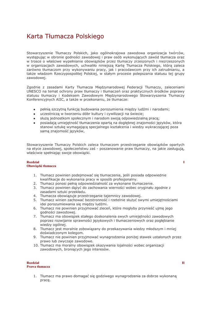 Karta Tłumacza Polskiego Stowarzyszenie Tłumaczy Polskich, jako ogólnokrajowa zawodowa organizacja twórców, występując w obronie godności zawodowej i praw osób wykonujących zawód tłumacza oraz w trosce o właściwe wypełnianie obowiązków przez tłumaczy zrzeszonych i niezrzeszonych w organizacjach zawodowych, uchwaliło niniejszą Kartę Tłumacza Polskiego, którą zaleca zarówno tłumaczom przy wykonywaniu pracy, jak i pracodawcom przy ich zatrudnianiu, a także władzom Rzeczypospolitej Polskiej, w stałym procesie polepszania statusu tej grupy zawodowej. Zgodnie z zasadami Karty Tłumacza Międzynarodowej Federacji Tłumaczy, zaleceniami UNESCO na temat ochrony praw tłumaczy i tłumaczeń oraz praktycznych środków poprawy statusu tłumaczy i Kodeksem Zawodowym Międzynarodowego Stowarzyszenia Tłumaczy Konferencyjnych AIIC, a także w przekonaniu, że tłumacze: pełnią szczytną funkcję budowania porozumienia między ludźmi i narodami; uczestniczą w tworzeniu dóbr kultury i cywilizacji na świecie; służą jednostkom społecznym i narodom swoją odpowiedzialną pracą; posiadają umiejętność tłumaczenia opartą na dogłębnej znajomości języków, która stanowi sztukę wymagającą specjalnego kształcenia i wiedzy wykraczającej poza samą znajomość języków, Stowarzyszenie Tłumaczy Polskich zaleca tłumaczom przestrzeganie obowiązków opartych na etyce zawodowej, społeczeństwu zaś - poszanowanie praw tłumaczy, na jakie zasługują, właściwie spełniając swoje obowiązki. Rozdział Obowiązki tłumacza I 1. Tłumacz powinien podejmować się tłumaczenia, jeśli posiada odpowiednie kwalifikacje do wykonania pracy w sposób profesjonalny. 2. Tłumacz ponosi pełną odpowiedzialność za wykonane tłumaczenie. 3. Tłumacz powinien dążyć do zachowania wierności wobec oryginału zgodnie z zasadami sztuki przekładu. 4. Tłumacza obowiązuje przestrzeganie tajemnicy zawodowej. 5. Tłumacz winien zachować bezstronność i rzetelnie służyć swymi umiejętnościami idei porozumiewania się między ludźmi. 6. Tłumacz nie powinien przyjmować zleceń, które mogłyby przynieść ujmę jego godności zawodowej. 7. Tłumacz ma obowiązek stałego doskonalenia swych umiejętności zawodowych poprzez rozwijanie sprawności językowych i tłumaczeniowych oraz pogłębianie wiedzy ogólnej. 8. Tłumacz jest moralnie zobowiązany do przekazywania wiedzy młodszym i mniej doświadczonym kolegom. 9. Tłumacz nie powinien przyjmować wynagrodzenia poniżej stawek ustalonych przez prawo lub zwyczaje zawodowe. 10. Tłumacz ma moralny obowiązek okazywania lojalności wobec organizacji zawodowych, broniących jego interesów. Rozdział Prawa tłumacza 1. Tłumacz ma prawo domagać się godziwego wynagrodzenia za dobrze wykonaną pracę. II 2. Tłumacz ma prawo żądać zapewnienia mu godziwych warunków pracy, umożliwiających sprawne tłumaczenie ustne i pisemne. 3. Tłumacz ma prawo żądać udostępnienia mu materiałów umożliwiających poprawne wykonanie tłumaczenia pisemnego lub ustnego. 4. Tłumacz ma prawo domagać się przestrzegania prawa autorskiego, w tym prawa do umieszczenia nazwiska na publikowanym tłumaczeniu, zachowania integralności tłumaczenia i uzyskania przewidzianych przez prawo korzyści majątkowych. 5. Tłumacz ma prawo odmówić wykonania tłumaczenia, jeśli przekracza ono zakres jego wiedzy albo sprawności językowych czy tłumaczeniowych. 6. Tłumacz ma prawo odmówić tłumaczenia, jeśli proponowany termin uniemożliwia mu jego rzetelne wykonanie. 7. Tłumacz ma prawo odmówić tłumaczenia, jeśli nie pozwalają mu na to uprzednio podjęte zobowiązania. 8. Tłumacz ma prawo odmówić tłumaczenia, jeśli narzuca się mu interpretację oryginału sprzeczną z jego przekonaniami, zasadami sztuki przekładu lub uznanymi normami. 9. Tłumacz ma prawo odmówić tłumaczenia na język niebędący jego językiem ojczystym bez zapewnienia niezbędnej konsultacji z kompetentnym rodzimym użytkownikiem języka. 10. Tłumacz ma prawo oczekiwać ochrony swych praw zawodowych, moralnych i materialnych przez zawodowe organizacje tłumaczy. Dokument uchwalony na posiedzeniu Zarządu Głównego Stowarzyszenia Tłumaczy Polskich 9 października 1993 r. zgodnie z wytycznymi uczestników III Zjazdu Delegatów STP, zmieniony 18 czerwca 2005 r. uchwałą VII Zjazdu Delegatów STP