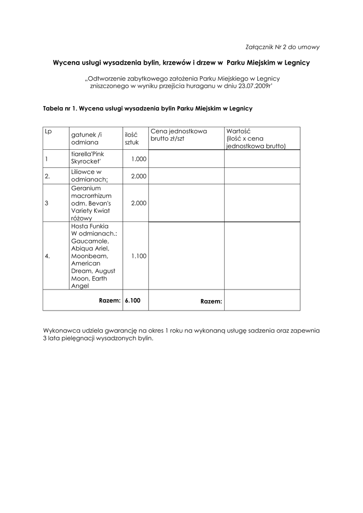 Załącznik Nr 2 do umowy Wycena usługi wysadzenia bylin, krzewów i drzew w Parku Miejskim w Legnicy „Odtworzenie zabytkowego załoŜenia Parku Miejskiego w Legnicy zniszczonego w wyniku przejścia huraganu w dniu 23.07.2009r’ Tabela nr 1. Wycena usługi wysadzenia bylin Parku Miejskim w Legnicy Lp 1 2. 3 4. gatunek /i odmiana tiarella'Pink Skyrocket' Liliowce w odmianach: Geranium macrorrhizum odm. Bevan's Variety Kwiat róŜowy Hosta Funkia W odmianach.: Gaucamole, Abiqua Ariel, Moonbeam, American Dream, August Moon, Earth Angel ilość sztuk Cena jednostkowa brutto zł/szt Wartość (ilość x cena jednostkowa brutto) 1.000 2.000 2.000 1.100 Razem: 6.100 Razem: Wykonawca udziela gwarancję na okres 1 roku na wykonaną usługę sadzenia oraz zapewnia 3 lata pielęgnacji wysadzonych bylin. Tabela nr 2. Wycena usługi wysadzenia krzewów w Parku Miejskim w Legnicy Lp gatunek /i odmiana 4. Hortensja wiechowata w odmianach Renhy, Pink Diamond Grandiflora hortensja drzewiasta Anabelle Hydrangea arborescens 'Anabelle' Dereń biały odm syberyjska Bialobrzega Cornus alba Sibirica Variegata Tawuła japońska Anthony Waterer 5. Tawuła nippońska Snoowmund 1. 2. 3. Ilość szt 100/120 30 80/100 50 40/60 100 50 50 7. Kalina sztywnolistna Viburnum rhytidophyllum 30 11. 12. 40/60 60/80 Kolkwitzia amabilis 10. Wartość (ilość x cena jednostkowa brutto) 30 kolkwicja chińska Azalie Rhododendron azalia Fireball (jaskrawa czerwień) Azalie Rhododendron azalia Parkfeuer (ognista czerwień) Azalie Rhododendron azalia Gibraltar mocny oranŜ róŜanecznik Rhododendron kw. czerwone(Nova Zembla) R. catawbiense Grandiflora Cena jedn. brutto zł/szt 100/120 6. 9. Wysokość cm 80/100 15 min 130+ cm 15 min 130+ cm 15 min 130+ cm min.120x 150 szer 40 Razem: Wykonawca udziela gwarancję na okres 1 roku na wykonaną usługę sadzenia oraz zapewnia 3 lata pielęgnacji wysadzonych roślin. Tabela nr 3. Wycena usługi wysadzenia drzew w Parku Miejskim w Legnicy lipa drobnolistna Tilia cordata obwód wys ilość pnia na w m sztuk wys.100 cm 35+ 5,5+ 40 sosna himalajska Pinus wallichiana 6 Kasztan jadalny Castanea sativa. 3 Lp gatunek /i odmiana -- 3,5+ 25+ 4,5+ Cena jednostkowa brutto zł/szt Wartość (ilość x cena jednostkowa brutto) RAZEM Wykonawca udziela gwarancję na okres 1 roku na wykonaną usługę sadzenia drzew oraz zapewnia 3 lata pielęgnacji wysadzonych roślin.