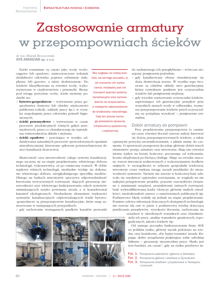 Inżynieria Bezwykopowa INFRASTRUKTURA WODNA I ŚCIEKOWA Zastosowanie armatury w przepompowniach ścieków dr inż. Marek Brzozowski AVK ARMADAN sp. z o.o. do nadmiernego ich przegłębienia – wówczas stoŚcieki rozumiane są często jako wody wodociągowe lub opadowe, zanieczyszczone wskutek Bez względu na rodzaj ście- sujemy pompownie pośrednie; działalności człowieka poprzez substancje stałe, ków, od samego początku, tj. – gdy kanalizowany obszar charakteryzuje się dużą deniwelacją terenu. W wyniku tego twopłynne lub gazowe, a także drobnoustroje. Do od momentu ich wytworzone są odrębne układy sieci grawitacyjnej, ścieków klasyfikowane są również wody, wykorzenia, niezbędny jest ich której centralnym punktem jest oczyszczalnia rzystywane w ciepłownictwie i przemyśle. Biorąc ścieków lub pompownia strefowa; pod uwagę powyższe cechy, ścieki możemy po- transport poprzez systemy kanalizacyjne oraz wprowa– gdy wysokie usytuowanie oczyszczalni ścieków, dzielić na: zapewniające ich grawitacyjny przepływ przy – bytowo-gospodarcze – wytwarzane przez godzenie na oczyszczalnie, wszystkich stanach wody w odbiorniku, wymuspodarstwa domowe lub obiekty użyteczności a następnie odprowadzenie sza przepompowanie ścieków przed oczyszczalpublicznej (szkoły, zakłady pracy itp.), w wynido środowiska naturalnego. nią na pożądaną wysokość – pompownia cenku zaspokajania przez człowieka potrzeb higieCały ten proces wymatralna; nicznych; ga posiadania sprawnej – ścieki przemysłowe – wytwarzane w czasie procesów produkcyjnych różnych gałęzi przeDobór armatury do pompowni infrastruktury podziemnej mysłowych, przez co charakteryzują się najwiękPrzy projektowaniu przepompowni (a ostatnii nadziemnej szą różnorodnością składu i stężenia; mi czasy również tłoczni) zawsze należy kierować – ścieki opadowe – powstające w wyniku odsię ilością przepompowywanych ścieków, a także działywania naturalnych procesów spowodowanych opadami opisanymi powyżej uwarunkowaniami, z jakimi mamy do czyatmosferycznymi, kierowane spływem powierzchniowym do nienia. O sprawności pompowni decyduje głównie dobór trzech sieci kanalizacji deszczowej. elementów: pomp, armatury oraz sterowania. Mają one również istotny wpływ na koszty końcowe, poczynając od wykonania, Skuteczność oraz niezawodność całego systemu kanalizacyjkosztu eksploatacji po bieżącą obsługę. Mając na uwadze znacznego zaczyna się na etapie projektowania, właściwego doboru ny wzrost inwestycji realizowanych z wykorzystaniem środków technologii, wykonawstwa, aż po ostateczny rozruch. W dobie unijnych, w szczególności w sektorze gospodarki ściekowej, napływu różnych technologii, niezbędne wydaje się dokonainwestorzy coraz większą uwagę zaczęli przykładać do niezanie właściwego doboru, uwzględniającego specyfikę mediów. wodności systemów. Niestety nie zawsze w końcowej fazie udaDlatego na barkach inwestorów spoczywa odpowiedzialność wało się uzyskiwać optymalne rozwiązania, ze względu na nie kreowania nowoczesnych rozwiązań, dających gwarancję nienajlepiej przygotowane projekty, pozorne oszczędności związazawodności oraz właściwego funkcjonowania całych systemów ne z zamianami urządzeń, poszukiwanie tańszych rozwiązań, zmniejszających ryzyko powstania awarii, a w konsekwencji brak wykwalifikowanej kadry (dotyczy głównie małych ośrodkatastrof ekologicznych. Niezbędnym elementem większości ków), niedoskonałość ustawy o zamówieniach publicznych itp. systemów kanalizacyjnych odprowadzających ścieki bytowoPodstawowe błędy rodziły się jednak na etapie projektowania. -gospodarcze są przepompownie kanalizacyjne, które mają zaPomimo zalewu informacji dotyczących dostępnych technologii, stosowanie w następujących przypadkach: nie zawsze idą one w parze z podstawową wiedzą dotyczącą – gdy zachowanie wymaganych spadków kanałów prowadzi przeliczania przepływów, wysokości tłoczenia, zachowania się urządzeń w określonych warunkach oraz charakterystyki ich pracy, analizy warunków gruntowych, topograficznych, jakości ścieków itp. Od samego początku funkcjonowania firmy AVK na polskim rynku, główny nacisk położono na wiedzę oraz kształcenie, aby lepiej rozumieć zasadę Kupując dobre urządzenia podarujesz sobie odrobinę luksusu – gwarancję niezawodnej pracy. Hasło jest tym bardziej „na czasie”, gdy na rynku przybywa in- Fot. 1. Fot. 2. Fot. 3. 60 kwiecień - czerwiec 2 / 2015 [58] Pompownia pośrednia i główna w Ostrołęce Pompownia główna i strefowa w Żyrardowie Pompownie strefowe i przydomowe w Terespolu i Łosicach INFRASTRUKTURA WODNA I ŚCIEKOWA Inżynieria Bezwykopowa frastruktury wodno-kanalizacyjnej (nadziemnej i podziemnej), kiedy odbiorcy chcą niezawodnych systemów, a inwestorzy chcą ograniczać koszty eksploatacji. Woda i ścieki dość często stają się wtedy kartą przetargową w lokalnych samorządach. Oferowane przez firmę AVK urządzenia przechodzą dogłębne badania, poparte bogatą wiedzą teoretyczną i praktyczną pozyskiwaną od docelowych odbiorców tak, by spełniały najwyższe wymogi. Do takich urządzeń możemy zaliczyć: 1. Zasuwy nożowe (mogą być wykonane w różnych wariantach): – zasuwa z trzpieniem stałym, – zasuwa z trzpieniem wznoszącym, – zasuwa z dźwignią – do szybkiego zamykania, – zasuwa z V-portem – do regulacji przepływu, – zasuwa z wymiennym deflektorem – obniża tarcie, – zasuwy z przeznaczeniem do sterowania, itp. typu NBR, z przeznaczeniem do ścieków. Zasuwy tego typu polecane są do kanalizacji ciśnieniowej i podciśnieniowej. Zasuwa z V-portem daje możliwość regulacji przepływu ścieków i spełnia rolę urządzenia odcinającego przepływ. Z kolei zastosowanie deflektora powoduje wydłużenie żywotności zasuwy poprzez zwiększenie odporności na tarcie powo