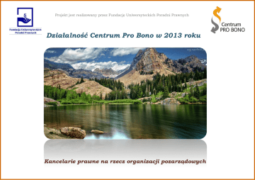 Projekt jest realizowany przez Fundację Uniwersyteckich Poradni Prawnych Działalność Centrum Pro Bono w 2013 roku Kancelarie prawne na rzecz organizacji pozarządowych Projekt realizowany jest przez Fundację Uniwersyteckich Poradni Prawnych w partnerstwie z krakowską Fundacją Biuro Inicjatyw Społecznych oraz wrocławskim Regionalnym Centrum Wspierania Inicjatyw Pozarządowych Szanowni Państwo, z wielką radością przedstawiamy raport z działalności programu Centrum Pro Bono (CPB), realizowanego przez Fundację Uniwersyteckich Poradni Prawnych. W minionym roku do CPB wpłynęło 60 spraw, z których 36 zostało ukończonych. W ubiegłych latach Centrum pomogło w sumie w 340 sprawach zgłoszonych przez potrzebujące wsparcia prawnego organizacje pozarządowe. Prawnicy ze współpracujących z nami kancelarii pomogli w sprawach z zakresu m.in. prawa pracy, prawa podatkowego i gospodarczego. Rozwiązywali też problemy prawne związane z ochroną środowiska i zwierząt, a także z rozwojem handlu internetowego. Tradycyjnie pojawiło się dużo spraw dotyczących wewnętrznego funkcjonowania fundacji i stowarzyszeń. Podczas opracowywania niniejszego raportu otrzymałyśmy wiele pozytywnych opinii ze strony organizacji pozarządowych, których przedstawiciele wyrażali gorące podziękowania dla prawników za ich profesjonalną pomoc. To chyba najbardziej wskazuje na potrzebę działalności pro bono oraz konieczność stymulacji rozwoju współpracy organizacji z chętnymi do pomocy kancelariami. Niezmiernie miło jest nam ogłosić, że w październiku 2013 roku Centrum Pro Bono zostało laureatem Konkursu na Najlepsze Partnerstwo Społeczne organizowanego przez polskie biuro United Nations Development Programme (UNDP) oraz Krajowy Ośrodek 1 European Social Found (EFS). Kapituła Konkursu nagrodziła partnerstwo za przełamywanie stereotypu zawodu prawnika nastawionego wyłącznie na zysk i promowania go, jako zawodu zaufania publicznego. Jury doceniło również fakt, iż zasady według których świadczone jest wsparcie prawne przez współpracujące z Centrum Pro Bono kancelarie, gwarantują powszechny dostęp. Program przynosi wymierne rezultaty, a wypracowany model wsparcia może być skutecznie wykorzystywany przez inne zawody. W roku 2013 wspieraliśmy organizacyjnie przygotowanie do odbywającego się po raz pierwszy w Polsce Europejskiego Forum Pro Bono, które miało miejsce w październiku ubiegłego roku w Warszawie. Obecnie z programem Centrum Pro Bono współpracują na stałe już 63 kancelarie. Mamy nadzieję, że kolejne lata będą owocowały coraz bardziej prężną współpracą między sektorem pozarządowym, a kancelariami prawnymi. Łączę wyrazy szacunku i zapraszam do lektury sprawozdania Centrum Pro Bono za 2013 rok, Anna Włodarczyk Koordynatorka Programu Centrum Pro Bono 2 Kancelaria Radców Prawnych Bieluk i Partnerzy Pani Mec. nie uwzględniał możliwości wykazywania wkładu własnego, w Jolanta Adamska pomogła Fundacji Dzieci Niczyje w sprawie z zakresu prawa pracy. Fundacja potrzebowała wsparcia w celu rozwiania wątpliwości postaci wkładu rzeczowego, osobowego, w tym świadczeń wolontariuszy i pracy społecznej członków organizacji. Ustawa zaś rozpatrującemu wniosek o dofinansowanie organowi administracji publicznej nakazuje uwzględniać taki wkład. natury prawnej dotyczących, m.in. wypowiedzenia umowy o Prawnicy Kancelarii ustalili, że regulamin jest prawidłowy, pracę ponieważ pracownicy wracającej z urlopu macierzyńskiego, Wojewódzki Fundusz Ochrony Środowiska i rozwiązania umów o pracę na czas nieokreślony bez wypłaty Gospodarki Wodnej nie jest organem administracji publicznej, a odprawy, instytucją ochrony środowiska. regulaminu wynagradzania oraz przywracania zlikwidowanych wcześniej stanowisk pracy. Sprawę prowadził Mec. Maciej Szermach. Za kontakt z Centrum Pro Bono w kancelarii odpowiedzialna jest Pani Mec. Jolanta Adamska. CMS Cameron McKenna Dariusz Greszta Sp. Komandytowa Kancelaria Prawna BSO Prawo & Podatki W 2013 roku Kancelaria Fundacji Ekologicznej zakresie interpretacji pomogła „Silesia” w regulaminu konkursu o dofinansowanie sformułowanego przez Wojewódzki Fundusz Ochrony Środowiska i Gospodarki Wodnej w Katowicach. Organizacja poprosiła o ustalenie, czy zapisy wspomnianego regulaminu były prawidłowe w kontekście ustawy o działalności pożytku publicznego i o wolontariacie. Regulamin 3 Mec. Arkadiusz Michaliszyn udzielił pomocy prawnej Fundacji z dziedziny Splotu prawa podatkowego Ramiennego. Sprawa dotyczyła obowiązku wystawiania faktur. Wątpliwości Fundacji dotyczyły zasad wystawiania faktur dla podopiecznych Fundacji, którzy przebywając na turnusie rehabilitacyjnym dokonywali zakupu sprzętu rehabilitacyjnego. Drugim problemem, który wyjaśnił Mec. Michaliszyn była kwestia obowiązku zapłaty podatku od darowizny na rzecz podopiecznych Fundacji. 4 Za kontakt kancelarii z Centrum Pro Bono jest odpowiedzialny internetowy, a także drukowany album. Pani Mec. Patrycja Mec. Arkadiusz Michaliszyn. Bolimowska pomogła organizacji w odpowiedzi na pytanie, czy podawane do publicznej informacji dane właścicieli gospodarstw powinny wchodzić w zakres bazy, którą należy zgłosić do GIODO. Kancelaria Prawna Chajec, Don-Siemion & Żyto Organizacja jest bardzo wysoko oceniła profesjonalizm Pani Pani Mec. Weronika Papucewicz pomogła Fundacji Mecenas. Uniwersyteckich Poradni Prawnych w sprawie z zakresu prawa pracy. Pracownik zatrudniony na umowę zlecenie w Fundacji jest obcokrajowcem. Fundacja poprosiła o wsparcie przy formułowaniu aneksu do umowy tak, aby pracownik mógł pracować zza granicy jako Kancelaria Radców Prawnych G.Morawska-Stanecka M.Stańko Spółka Partnerska wolontariusz w celu zachowania ciągłości okresu zatrudnienia, W 2013 roku Pani Mec. Ewelina Basta co jest istotną kwestią przy wnioskowaniu o kartę pobytu na udzieliła terenie Polski. wsparci