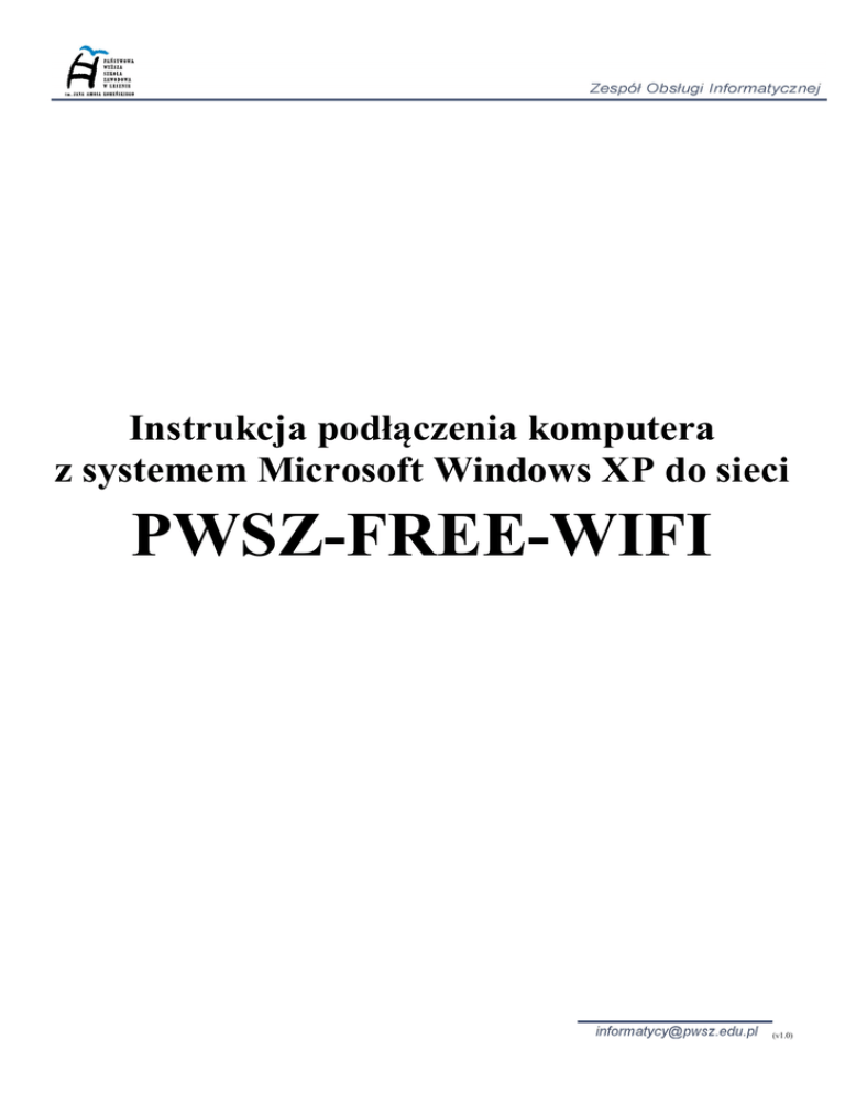 Instrukcja pod czenia komputera z systemem Microsoft Windows XP do sieci PWSZ-FREE-WIFI (v1.0) I. REJESTRACJA 1. W pierwszej kolejno ci nale y sprawdzi , czy punkt dost powy PWSZ-FREE-WIFI-REJESTRACJA jest dost pny. 2. Z menu Start nale y wybra „Uruchom” i wpisa komend : control netconnections 3. W oknie „Po czenia sieciowe” nale y klikn bezprzewodowej” i wybra „ ciwo ci”. prawym przyciskiem ikon „Po czenie sieci (v1.0) 4. W oknie „W ciwo ci: Po czenie sieci bezprzewodowej” nale y zaznaczy (1) „Protokó internetowy (TCP/IP)” i klikn (2) „ ciwo ci”. 5. W oknie „W ciwo ci: Protokó internetowy (TCP/IP) nale y zaznaczy pola tak jak na poni szym rysunku i wybra „OK”. 6. Aby zarejestrowa si w sieci PWSZ-FREE-WIFI, nale y pod czy komputer do punktu dost powego o nazwie PWSZ-FREE-WIFI-REJESTRACJA i uruchomi przegl dark internetow . Po wpisaniu adresu np. www.pwsz.edu.pl, wy wietlony zostanie regulamin, który nale y przeczyta i zatwierdzi a nast pnie wype ni formularz rejestracyjny. Uwaga! W oknie potwierdzaj cym poprawn rejestracj , mo na pobra instrukcj konfiguracji komputera do po czenia z sieci PWSZ-FREE-WIFI. (v1.0) II. AKTYWACJA Aby dokona aktywacji, nale y zg osi si z wa legitymacj studenck (studenci) lub dowodem osobistym (pracownicy, go cie) do jednego z punktów aktywacji (lista dost pnych punktów aktywacji zostanie wy wietlona po dokonaniu rejestracji). III. KONFIGURACJA Posiadaj c aktywne konto (potwierdzone otrzymaniem wiadomo ci SMS z nazw u ytkownika i has em), mo na dokona konfiguracji komputera do korzystania z sieci PWSZ-FREE-WIFI. Opis poszczególnych kroków przedstawiono w punktach poni ej. 1. W pierwszej kolejno ci nale y sprawdzi który punkt dost powy jest osi galny. W opisywanym przypadku dost pny jest PWSZ-FREE-WIFI-1 i t nazw nale y zapami ta (b dzie ona potrzebna w nast pnych krokach). 2. Z menu Start nale y wybra „Uruchom” i wpisa komend : control netconnections (v1.0) 3. W oknie „Po czenia sieciowe” nale y klikn bezprzewodowej” i wybra „ ciwo ci”. prawym przyciskiem ikon „Po czenie sieci 4. W oknie „W ciwo ci: po cznia sieci bezprzewodowej” nale y wybra zak adk (1) „Sieci bezprzewodowe” i klikn (2) „Dodaj…”. (v1.0) 5. W polu (1) „Nazwa sieci (SSID):” nale y wpisa nazw punktu dost powego, do którego komputer ma zosta pod czony - nazwa zosta a wy wietlona w punkcie 1. W budynkach Uczelni dost pnych jest 6 punktów dost powych, nazwy zako czone s odpowiednim numerem od 1 do 6 np. PWSZ-FREE-WIFI-1, PWSZ-FREE-WIFI-2, PWSZ-FREE-WIFI-3 itd. Po wpisaniu nazwy punktu dost powego nale y wybra (2) „Uwierzytelnianie sieciowe:” WPA oraz (3) „Szyfrowanie danych:” AES. Po wype nieniu wszystkich pól jak pokazano na rysunku poni ej, nale y przej do zak adki (4) „Uwierzytelnianie”. (v1.0) 6. W zak adce „Uwierzytelnianie” nale y wybra (1) „Typ protoko u EAP” Chroniony protokó EAP (PEAP) i klikn (2)„ ciwo ci”. (v1.0) 7. W oknie „W ciwo ci chronionego protoko u EAP” nale y odznaczy pole (1) „Weryfikuj certyfikat serwera” i klikn przycisk (2) „Konfiguruj…” w polu „Wybierz metod uwierzytelniania”. 8. W oknie „W ciwo ci protoko u EAP MSCHAPv2” nale y odznaczy (1) „Automatycznie ywaj nazwy logowania i has a (oraz domeny, je li istnieje) systemu Windows” i zaakceptowa klikaj c „OK” . 9. W pozosta ych oknach nale y klikn tak e przycisk „OK” a do zamkni cia wszystkich okien. Tym sposobem skonfigurowano po czenie do sieci PWSZ-FREE-WIFI ( w tym przypadku przez punkt dost powy PWSZ-FREE-WIFI-1). (v1.0) 10. Aby po czy si do sieci PWSZ-FREE-WIFI przez skonfigurowany punk dost powy, nale y wy wietli dost pne sieci bezprzewodowe, zaznaczy dodany punkt sieci bezprzewodowej i klikn „Po cz”. 11. W prawym dolnym rogu pojawi si komunikat, który nale y klikn , aby wprowadzi po wiadczenia dla po czenia z sieci PWSZ-FREE-WIFI. 12. W oknie „Wprowadzanie po wiadcze ” nale y wpisa nazw u ytkownika oraz has o, które zosta y wys anie na numer telefonu komórkowego podany w procesie rejestracji. Pole „Domena logowania” nale y zostawi puste. (v1.0)