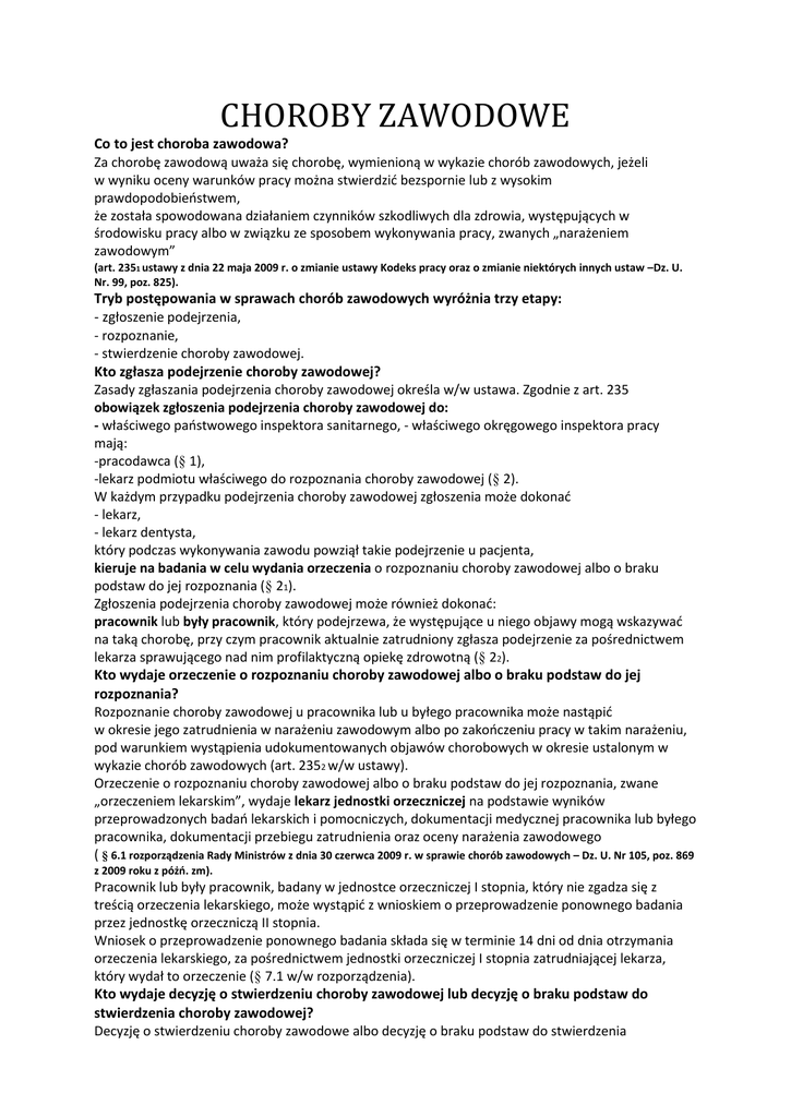 CHOROBY ZAWODOWE Co to jest choroba zawodowa? Za chorobę zawodową uważa się chorobę, wymienioną w wykazie chorób zawodowych, jeżeli w wyniku oceny warunków pracy można stwierdzić bezspornie lub z wysokim prawdopodobieństwem, że została spowodowana działaniem czynników szkodliwych dla zdrowia, występujących w środowisku pracy albo w związku ze sposobem wykonywania pracy, zwanych „narażeniem zawodowym” (art. 2351 ustawy z dnia 22 maja 2009 r. o zmianie ustawy Kodeks pracy oraz o zmianie niektórych innych ustaw –Dz. U. Nr. 99, poz. 825). Tryb postępowania w sprawach chorób zawodowych wyróżnia trzy etapy: - zgłoszenie podejrzenia, - rozpoznanie, - stwierdzenie choroby zawodowej. Kto zgłasza podejrzenie choroby zawodowej? Zasady zgłaszania podejrzenia choroby zawodowej określa w/w ustawa. Zgodnie z art. 235 obowiązek zgłoszenia podejrzenia choroby zawodowej do: - właściwego państwowego inspektora sanitarnego, - właściwego okręgowego inspektora pracy mają: -pracodawca (§ 1), -lekarz podmiotu właściwego do rozpoznania choroby zawodowej (§ 2). W każdym przypadku podejrzenia choroby zawodowej zgłoszenia może dokonać - lekarz, - lekarz dentysta, który podczas wykonywania zawodu powziął takie podejrzenie u pacjenta, kieruje na badania w celu wydania orzeczenia o rozpoznaniu choroby zawodowej albo o braku podstaw do jej rozpoznania (§ 21). Zgłoszenia podejrzenia choroby zawodowej może również dokonać: pracownik lub były pracownik, który podejrzewa, że występujące u niego objawy mogą wskazywać na taką chorobę, przy czym pracownik aktualnie zatrudniony zgłasza podejrzenie za pośrednictwem lekarza sprawującego nad nim profilaktyczną opiekę zdrowotną (§ 22). Kto wydaje orzeczenie o rozpoznaniu choroby zawodowej albo o braku podstaw do jej rozpoznania? Rozpoznanie choroby zawodowej u pracownika lub u byłego pracownika może nastąpić w okresie jego zatrudnienia w narażeniu zawodowym albo po zakończeniu pracy w takim narażeniu, pod warunkiem wystąpienia udokumentowanych objawów chorobowych w okresie ustalonym w wykazie chorób zawodowych (art. 2352 w/w ustawy). Orzeczenie o rozpoznaniu choroby zawodowej albo o braku podstaw do jej rozpoznania, zwane „orzeczeniem lekarskim”, wydaje lekarz jednostki orzeczniczej na podstawie wyników przeprowadzonych badań lekarskich i pomocniczych, dokumentacji medycznej pracownika lub byłego pracownika, dokumentacji przebiegu zatrudnienia oraz oceny narażenia zawodowego ( § 6.1 rozporządzenia Rady Ministrów z dnia 30 czerwca 2009 r. w sprawie chorób zawodowych – Dz. U. Nr 105, poz. 869 z 2009 roku z póżń. zm). Pracownik lub były pracownik, badany w jednostce orzeczniczej I stopnia, który nie zgadza się z treścią orzeczenia lekarskiego, może wystąpić z wnioskiem o przeprowadzenie ponownego badania przez jednostkę orzeczniczą II stopnia. Wniosek o przeprowadzenie ponownego badania składa się w terminie 14 dni od dnia otrzymania orzeczenia lekarskiego, za pośrednictwem jednostki orzeczniczej I stopnia zatrudniającej lekarza, który wydał to orzeczenie (§ 7.1 w/w rozporządzenia). Kto wydaje decyzję o stwierdzeniu choroby zawodowej lub decyzję o braku podstaw do stwierdzenia choroby zawodowej? Decyzję o stwierdzeniu choroby zawodowe albo decyzję o braku podstaw do stwierdzenia choroby zawodowej wydaje właściwy państwowy inspektor sanitarny na podstawie materiału dowodowego, a w szczególności danych zawartych w orzeczeniu lekarskim oraz formularzu oceny narażenia zawodowego pracownika lub byłego pracownika. Od decyzji państwowego inspektora sanitarnego przysługuje stronom odwołanie do właściwego organu odwoławczego zgodnie z pouczeniem zawartym w decyzji. Decyzja wydana przez właściwy organ odwoławczy jest ostateczna. O ile strona uzna, że decyzja organu odwoławczego jest niezgodna z prawem może zaskarżyć ją do właściwego Sądu Administracyjnego za pośrednictwem organu odwoławczego w terminie 30 dni od daty jej otrzymania. SCHEMAT ILUSTRUJĄCY PRZEBIEG POSTĘPOWANIA W PRZYPADKU PODEJRZENIA CHOROBY ZAWODOWEJ decyzja Jednostki orzecznicze I stopnia: - poradnie chorób zawodowych wojewódzkich ośrodków medycyny pracy; - kliniki i poradnie chorób zawodowych uniwersytetów (akademii medycznych); - poradnie chorób zakaźnych wojewódzkich ośrodków medycyny pracy albo przychodnie i oddziały chorób zakaźnych poziomu wojewódzkiego – w zakresie chorób zawodowych zakaźnych i pasożytniczych; - jednostki organizacyjne zakładów opieki zdrowotnej, w których nastąpiła hospitalizacjaw zakresie rozpoznawania chorób zawodowych u pracowników hospitalizowanych z powodu wystąpienia ostrych objawów choroby. Jednostki orzecznicze II stopnia Od orzeczeń wydanych przez lekarzy zatrudnionych w jednostkach orzeczniczych I stopnia, przysługuje stronie odwołanie do jednostek orzeczniczych II stopnia, którymi są jednostki badawczo – rozwojowe w dziedzinie medycyny pracy.